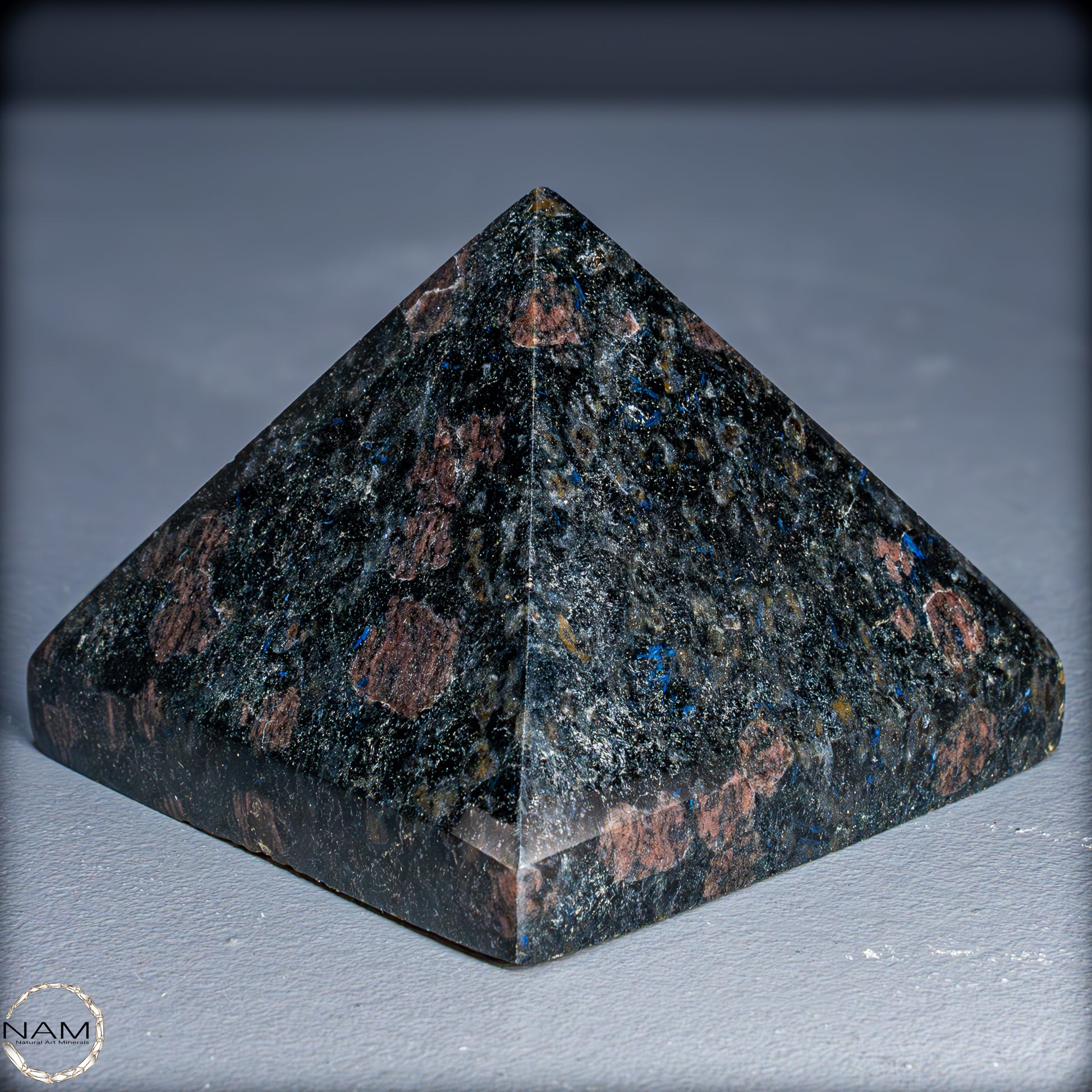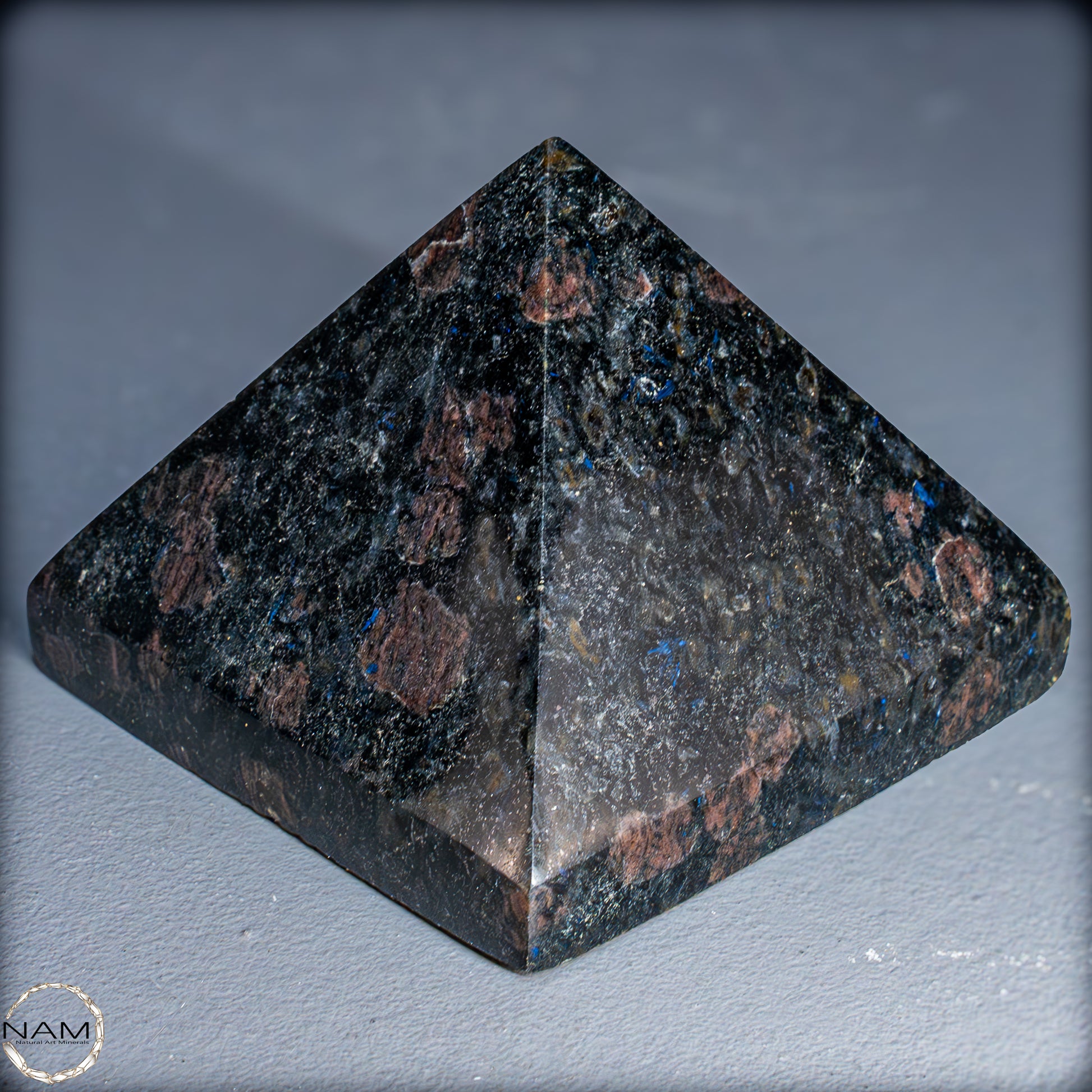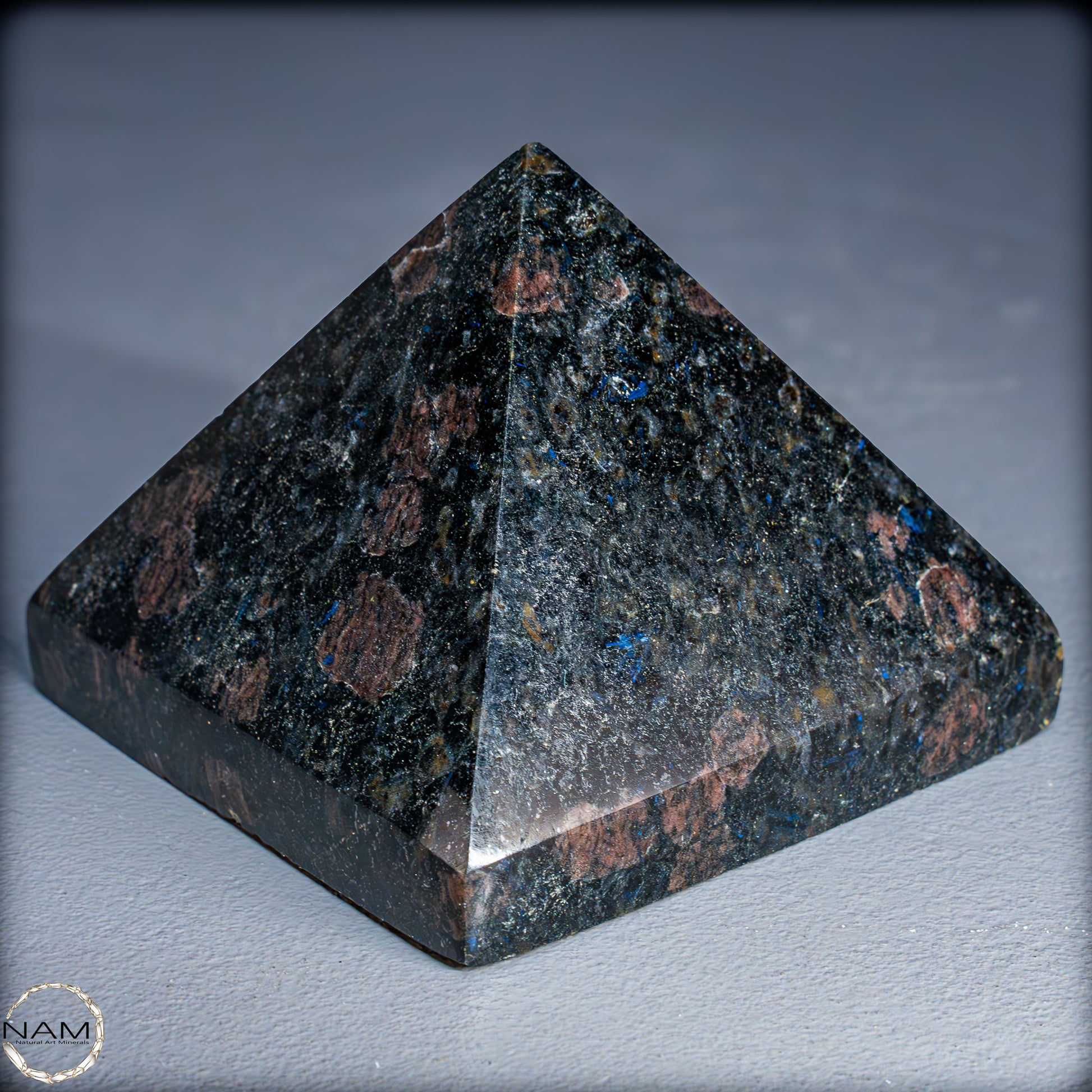 Diese Pyramide aus Arfvedsonit beeindruckt mit ihrem tiefdunklen Grundton, durchzogen von schimmernden blauen Nadeln und feinen rötlich-braunen Einschlüssen. Das harmonische Zusammenspiel der Farben erzeugt Tiefe und Lebendigkeit, sodass die Pyramide je nach Lichteinfall unterschiedlich wirkt – mal geheimnisvoll dunkel, mal fast funkelnd.
