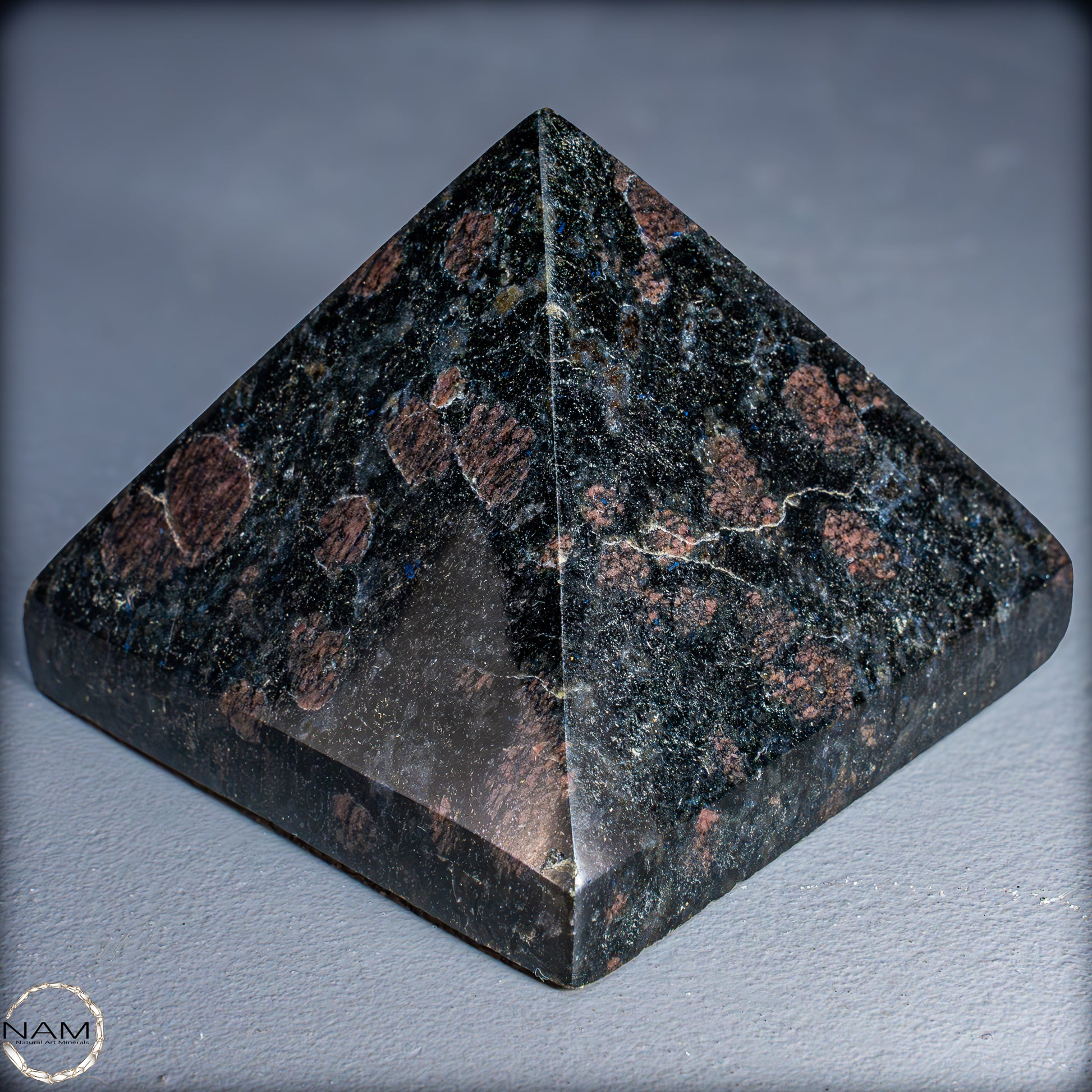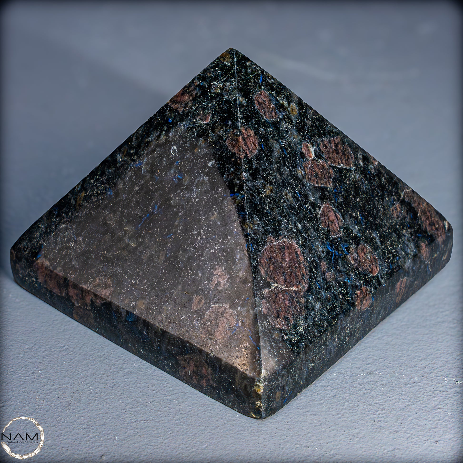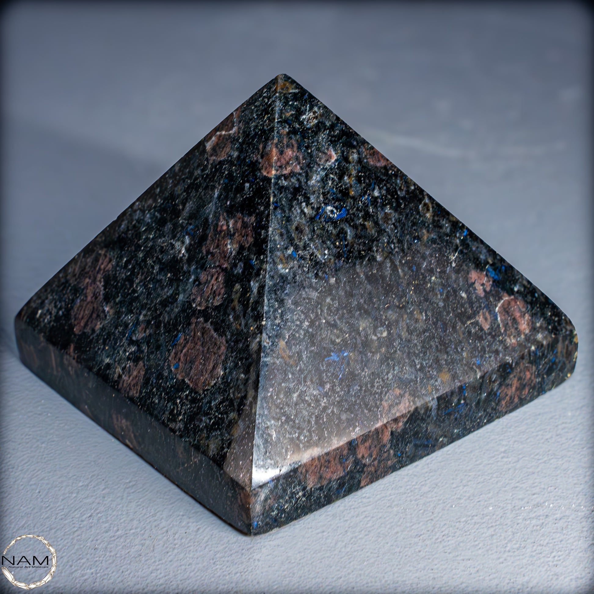 Diese Pyramide aus Arfvedsonit beeindruckt mit ihrem tiefdunklen Grundton, durchzogen von schimmernden blauen Nadeln und feinen rötlich-braunen Einschlüssen. Das harmonische Zusammenspiel der Farben erzeugt Tiefe und Lebendigkeit, sodass die Pyramide je nach Lichteinfall unterschiedlich wirkt – mal geheimnisvoll dunkel, mal fast funkelnd.