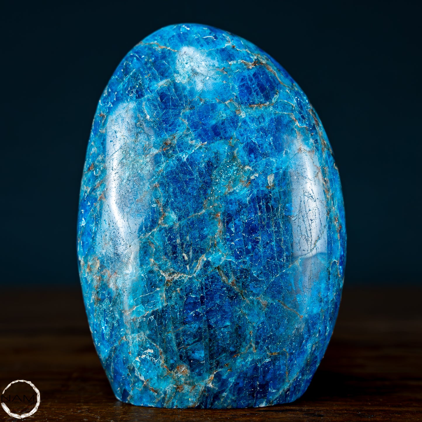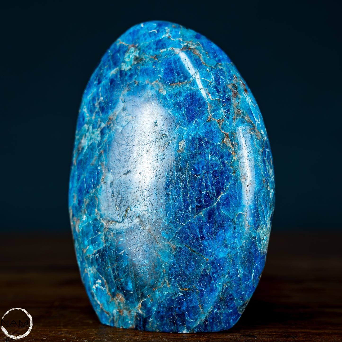 Wunderschöner Apatit mit einzigartigen Mustern und petrolfarbenen Facetten. Man sagt dem Apatit nach er stärke das Selbstbewusstsein, gibt mehr Zielstrebigkeit, stärkt die Individualität und helfe somit aus Niedergeschlagenheit und Unmut heraus. Zunehmend sind Apatite auch für die Herstellung von Schmuckstücken von Bedeutung, besonders Schmucksteine mit Katzenaugeneffekt. Dieser Effekt wird durch den richtigen Schliff erzielt.