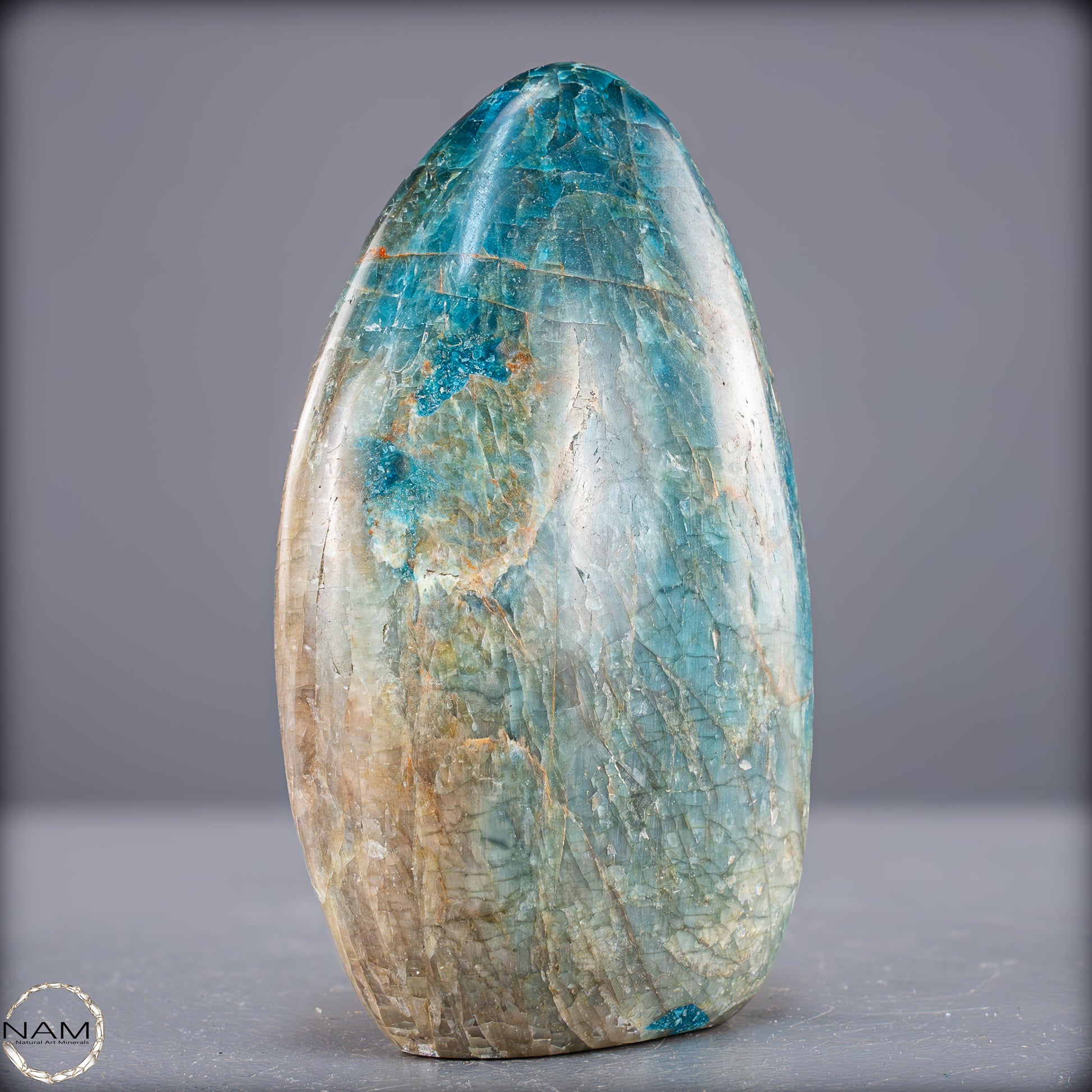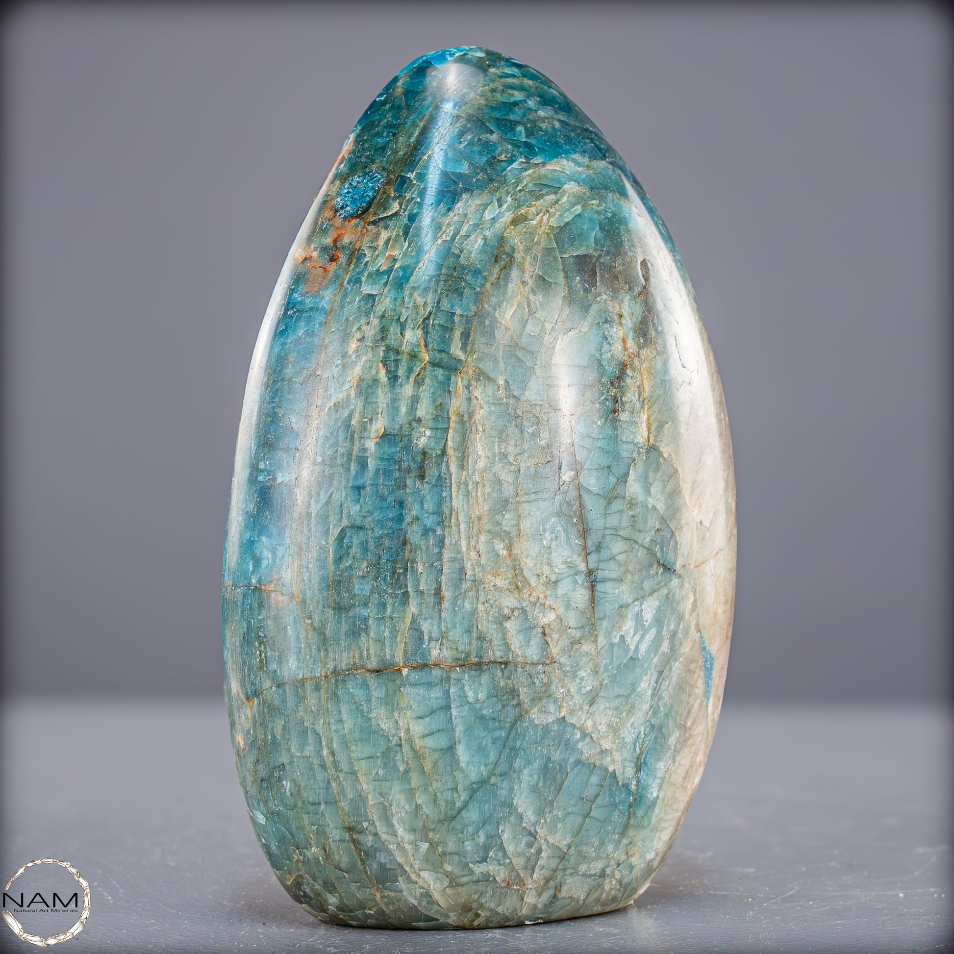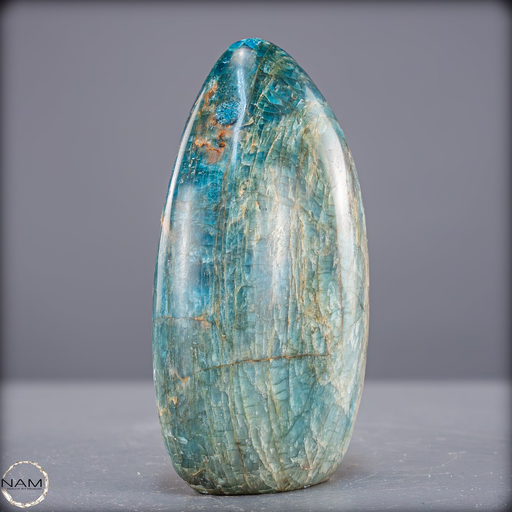 Wunderschöner Apatit mit einzigartigen Mustern und benzinfarbenen Facetten. Man sagt dem Apatit nach er Stärke das Selbstbewusstsein, gibt mehr Zielstrebigkeit, stärkt die Individualität und hilft somit aus Niedergeschlagenheit und Unmut herauszukommen. Zunehmend sind Apatite auch für die Herstellung von Schmuckstücken von Bedeutung, insbesondere Schmucksteine mit Katzenaugeneffekt. Dieser Effekt wird durch den richtigen Schliff erzielt.