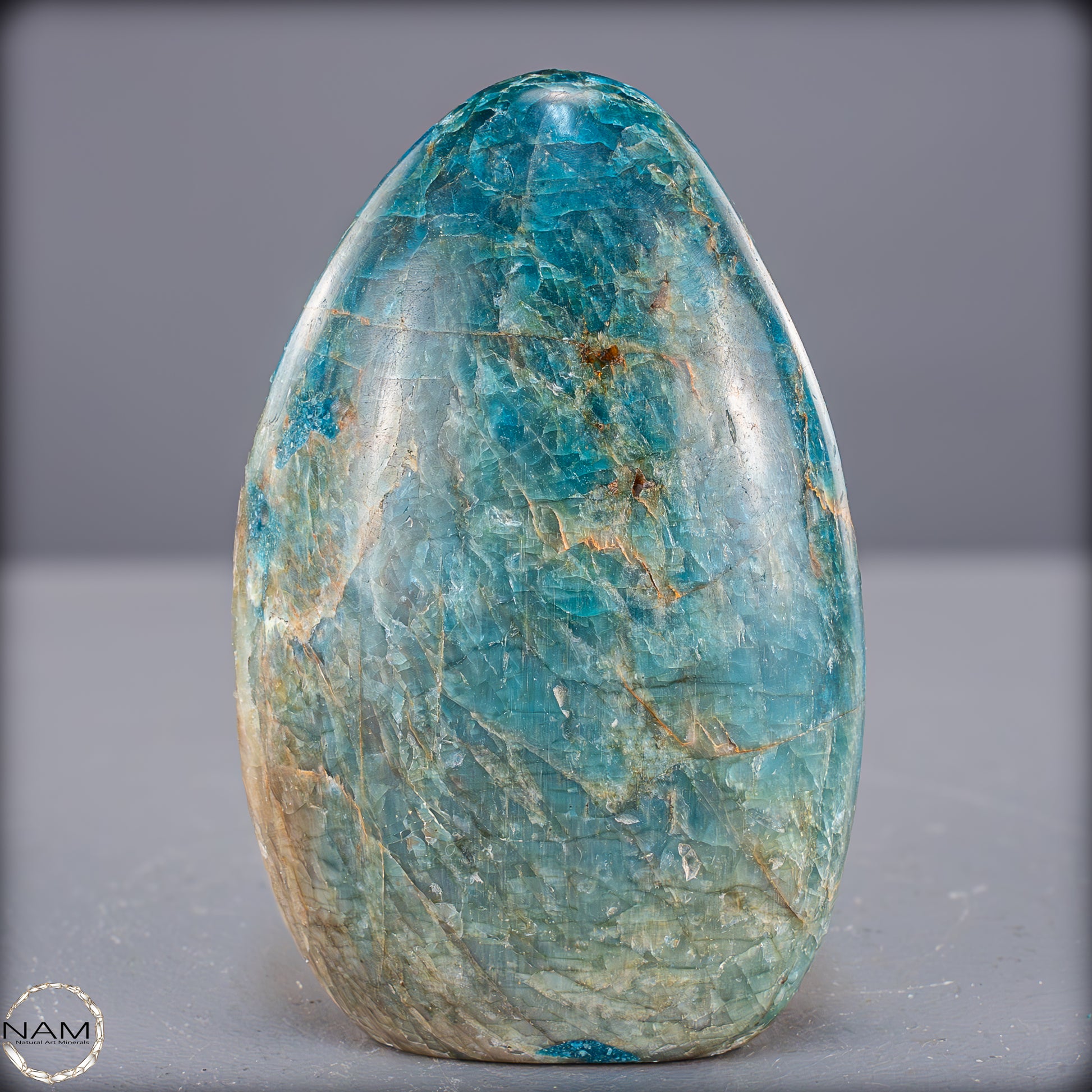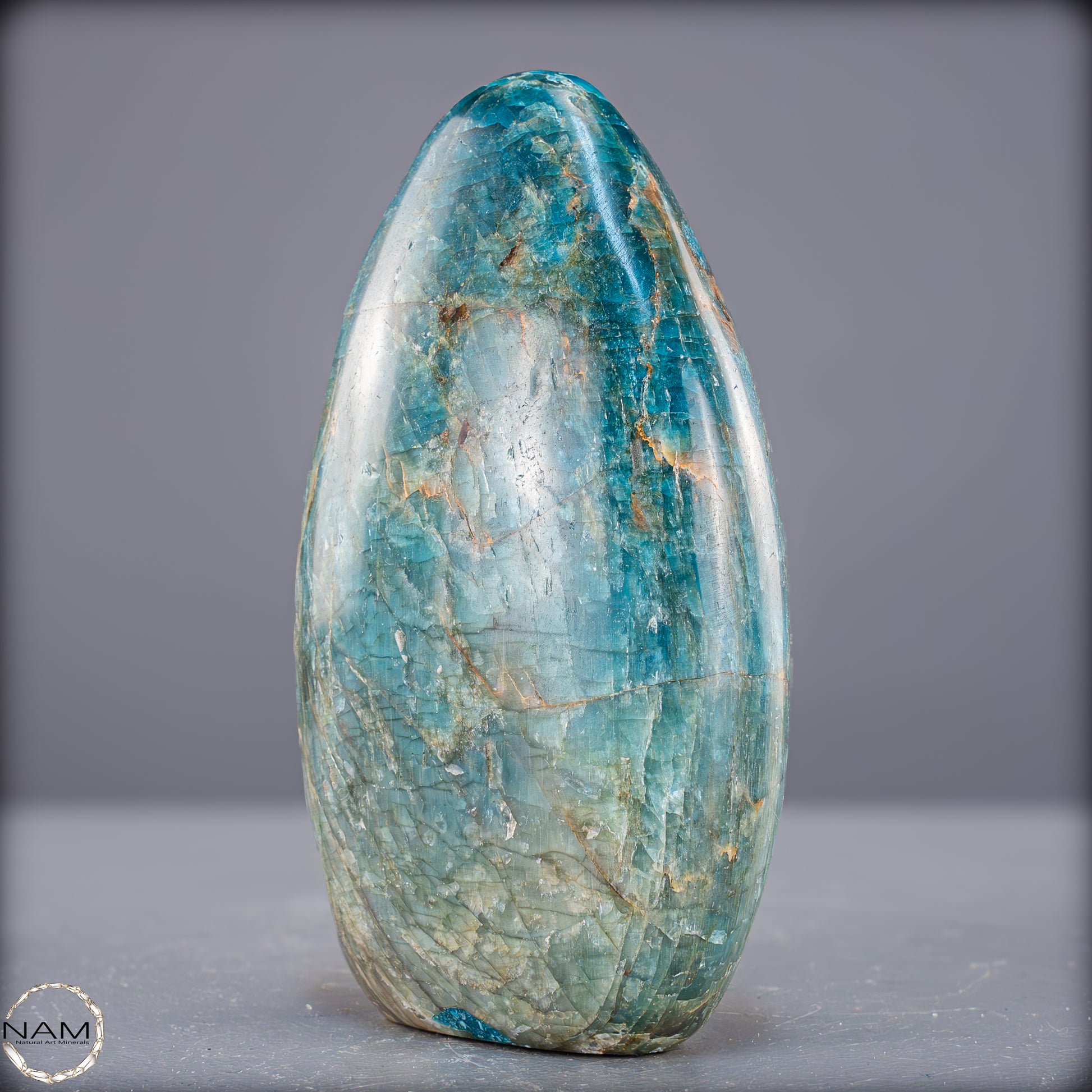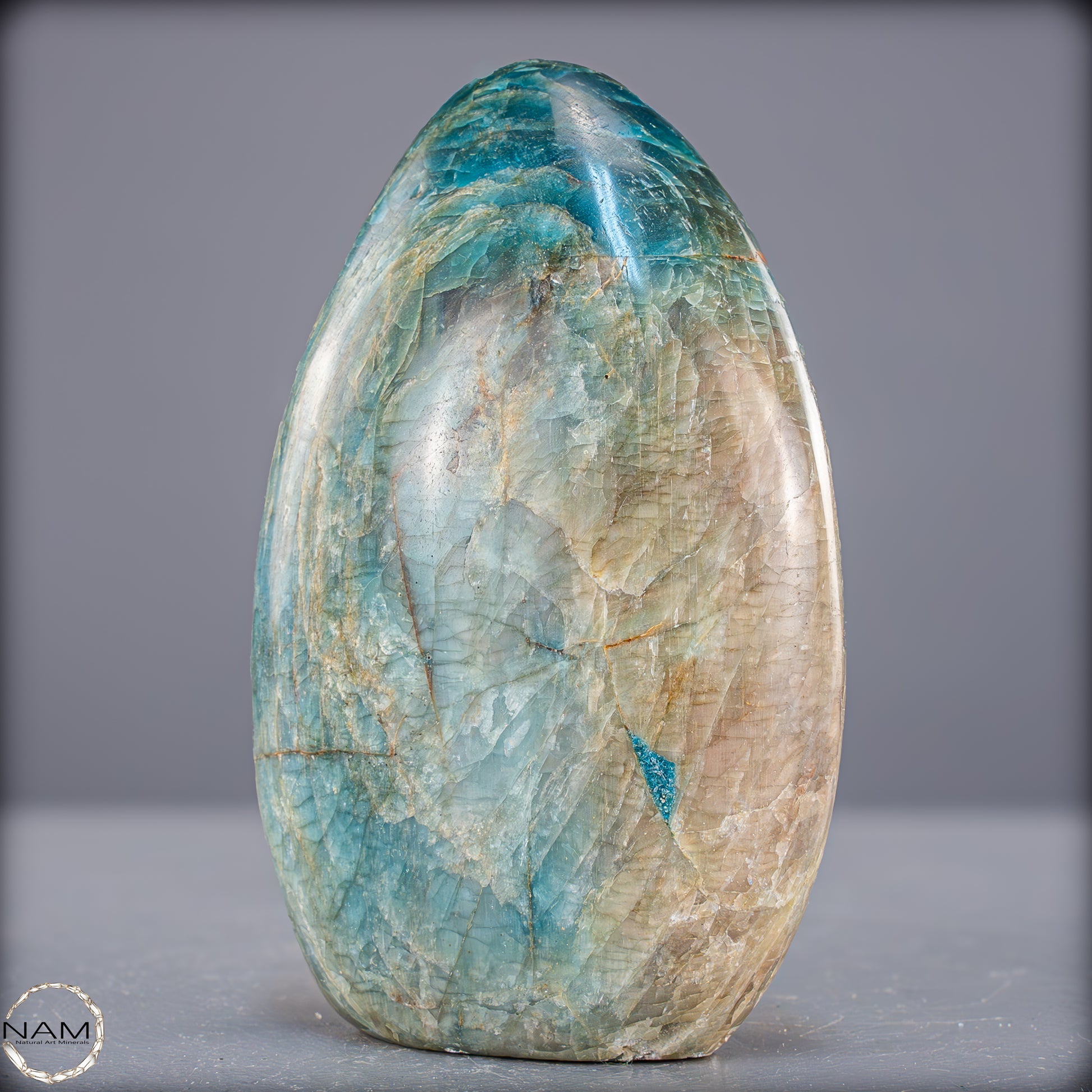 Wunderschöner Apatit mit einzigartigen Mustern und benzinfarbenen Facetten. Man sagt dem Apatit nach er Stärke das Selbstbewusstsein, gibt mehr Zielstrebigkeit, stärkt die Individualität und hilft somit aus Niedergeschlagenheit und Unmut herauszukommen. Zunehmend sind Apatite auch für die Herstellung von Schmuckstücken von Bedeutung, insbesondere Schmucksteine mit Katzenaugeneffekt. Dieser Effekt wird durch den richtigen Schliff erzielt.