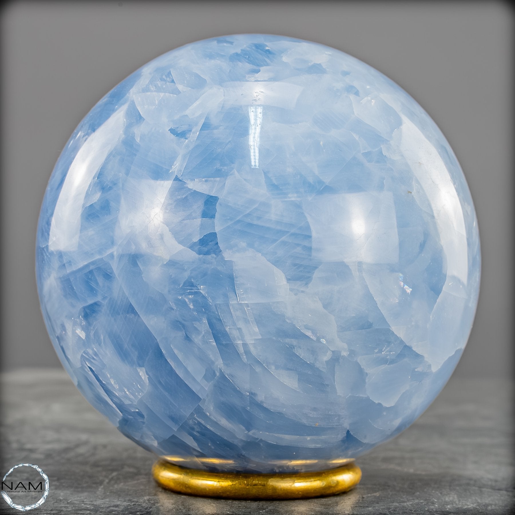 Tauchen Sie ein in die beruhigende Schönheit einer natürlichen himmelblauen Calcit Kugel, die direkt aus den reichen Mineralvorkommen Madagaskars stammt. Diese außergewöhnliche Kugel beeindruckt durch ihre zarte blaue Farbe, die an einen klaren Himmel erinnert, und ihre faszinierende Struktur, die Licht auf wunderschöne Weise einfängt und reflektiert.