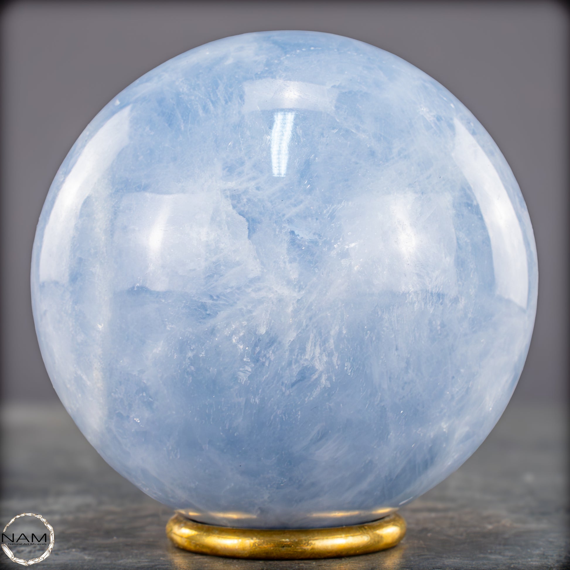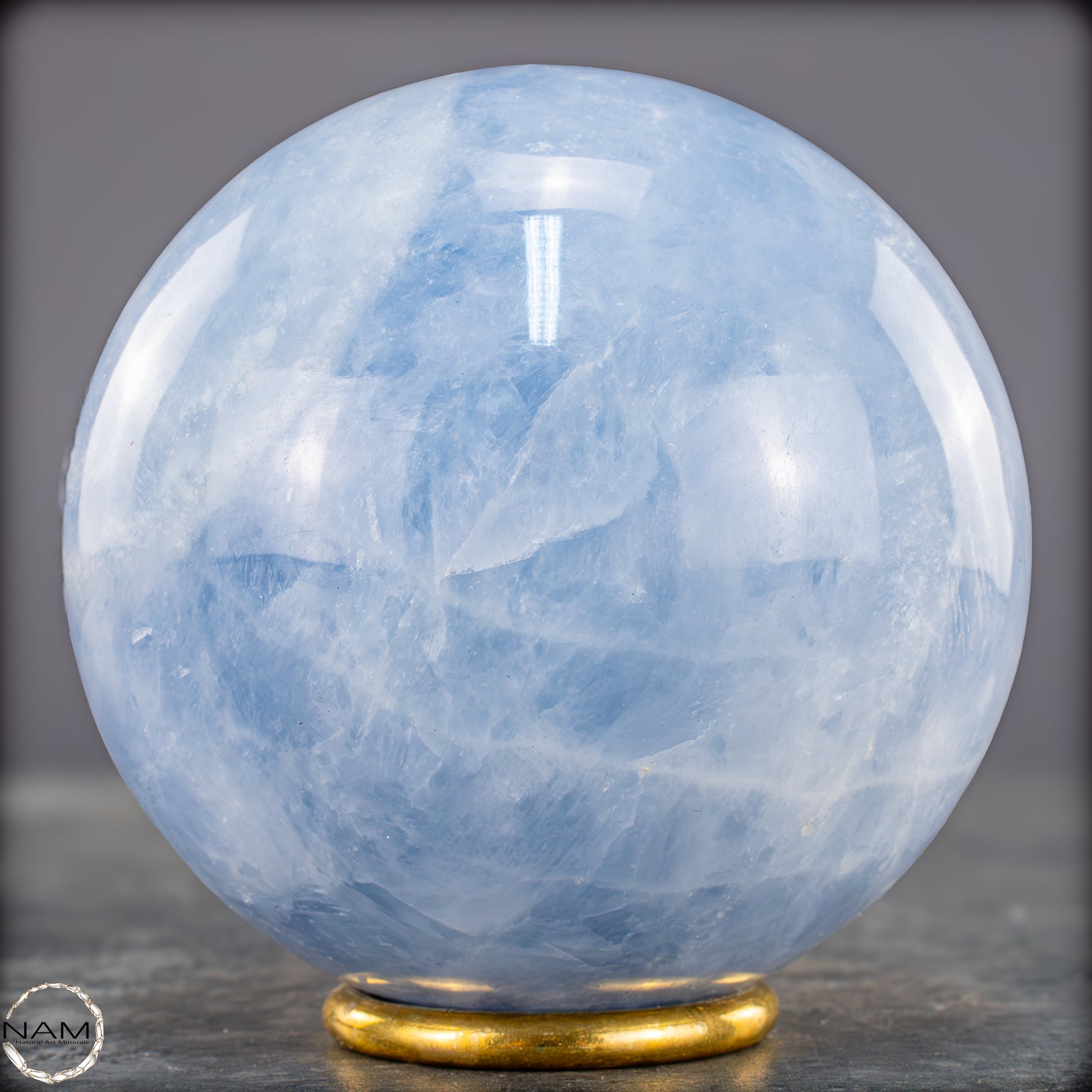 Tauchen Sie ein in die beruhigende Schönheit einer natürlichen himmelblauen Calcit Kugel, die direkt aus den reichen Mineralvorkommen Madagaskars stammt. Diese außergewöhnliche Kugel beeindruckt durch ihre zarte blaue Farbe, die an einen klaren Himmel erinnert, und ihre faszinierende Struktur, die Licht auf wunderschöne Weise einfängt und reflektiert.
