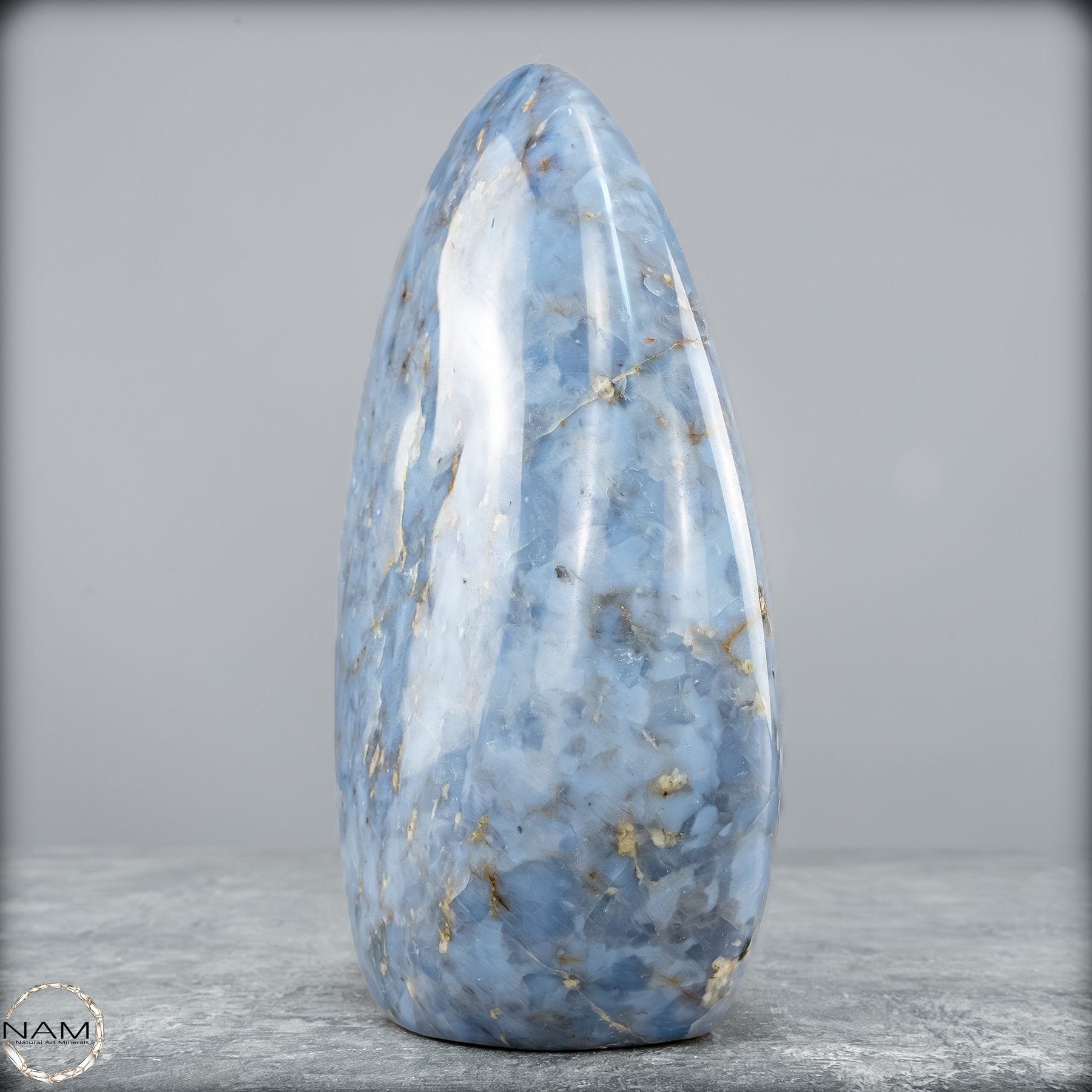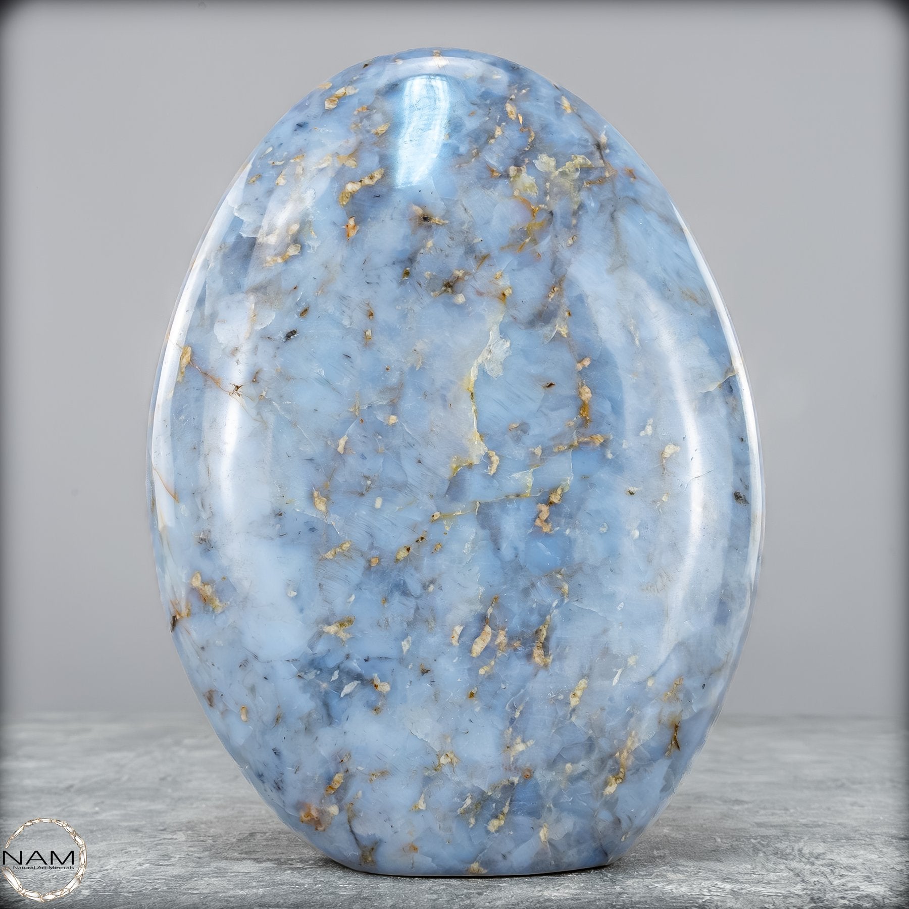 Diese außergewöhnliche Freiform aus blauem Quarz ist ein kraftvolles Naturkunstwerk, das mit seiner einzigartigen Farbgebung und organischen Struktur sofort ins Auge fällt. Die intensive, wolkenhafte Blaufärbung des Steins wird von goldenen, weißen und erdigen Einschlüssen durchzogen, die ihn wie eine abstrakte Landschaft wirken lassen – lebendig, tiefgründig und harmonisch zugleich.