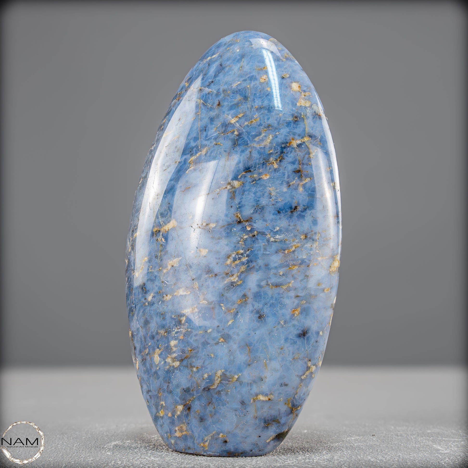 Diese außergewöhnliche Freiform aus blauem Quarz ist ein kraftvolles Naturkunstwerk, das mit seiner einzigartigen Farbgebung und organischen Struktur sofort ins Auge fällt. Die intensive, wolkenhafte Blaufärbung des Steins wird von goldenen, weißen und erdigen Einschlüssen durchzogen, die ihn wie eine abstrakte Landschaft wirken lassen – lebendig, tiefgründig und harmonisch zugleich.