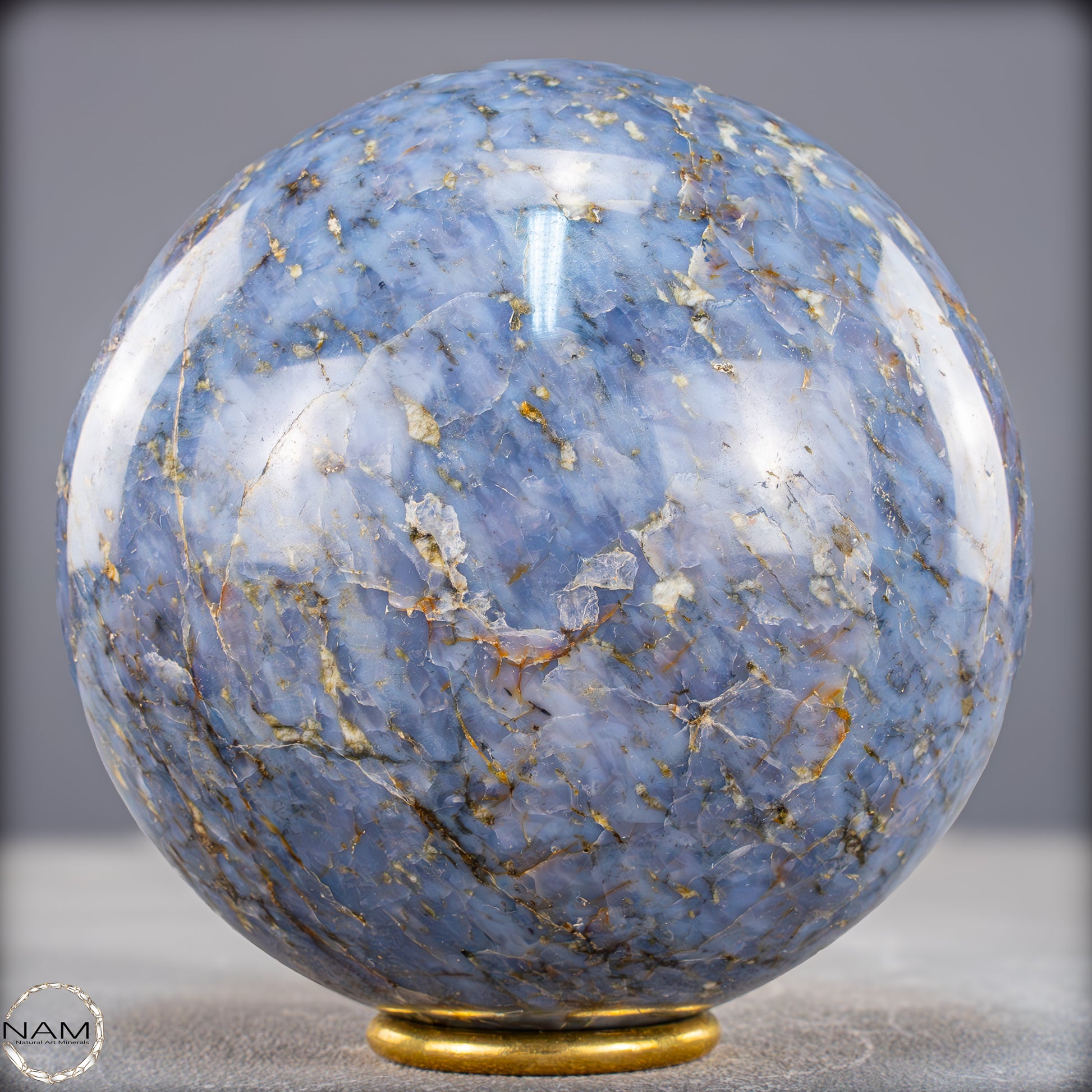Diese Kugel aus blauem Quarz fasziniert durch ihre sanfte, doch zugleich kraftvolle Farbwirkung. Der Stein zeigt ein Spektrum aus zarten bis intensiven Blautönen, die von feinen, wolkigen Strukturen durchzogen sind. Eingestreute goldene und weiße Adern durchbrechen das gleichmäßige Blau und verleihen der Oberfläche Lebendigkeit sowie eine beinahe malerische Tiefe.