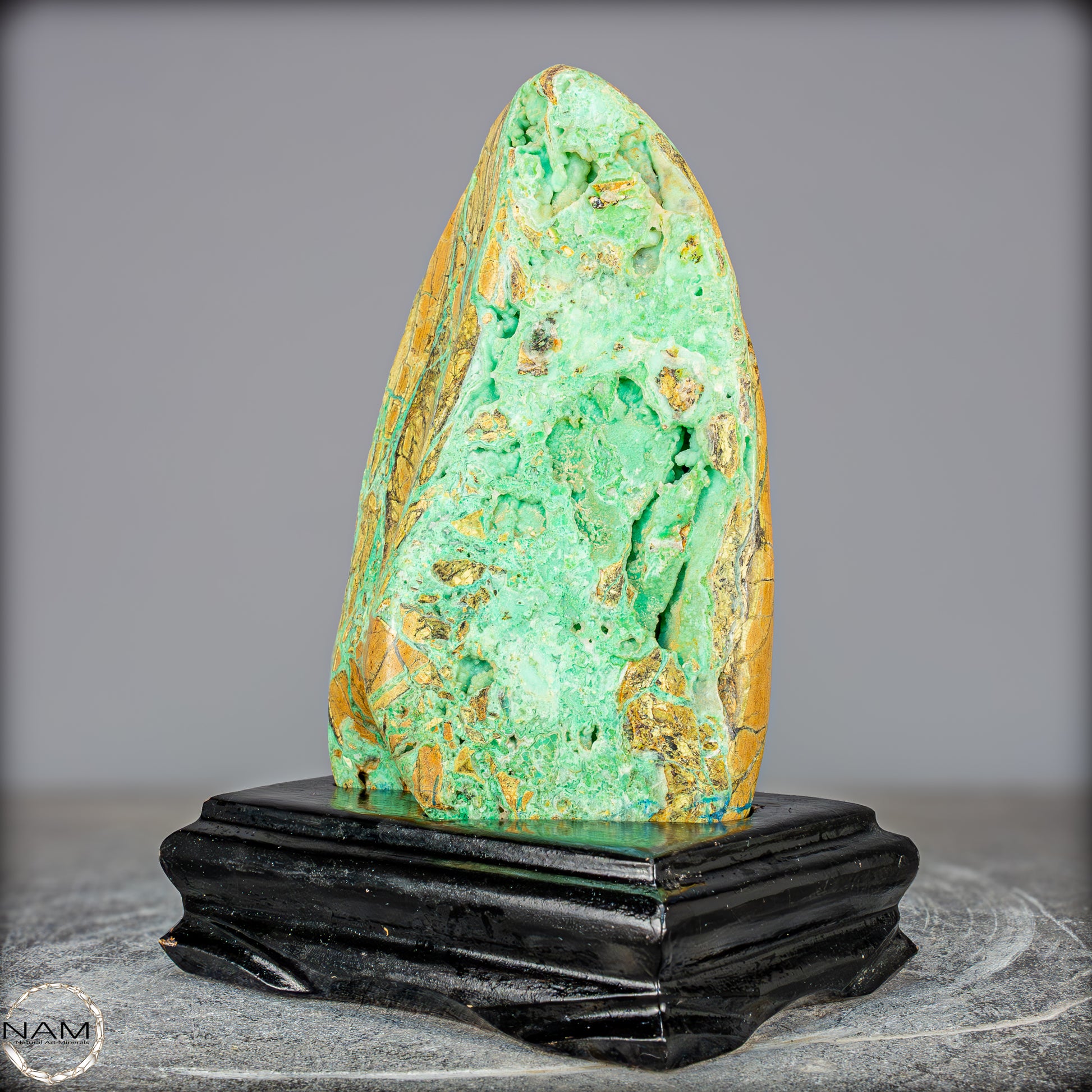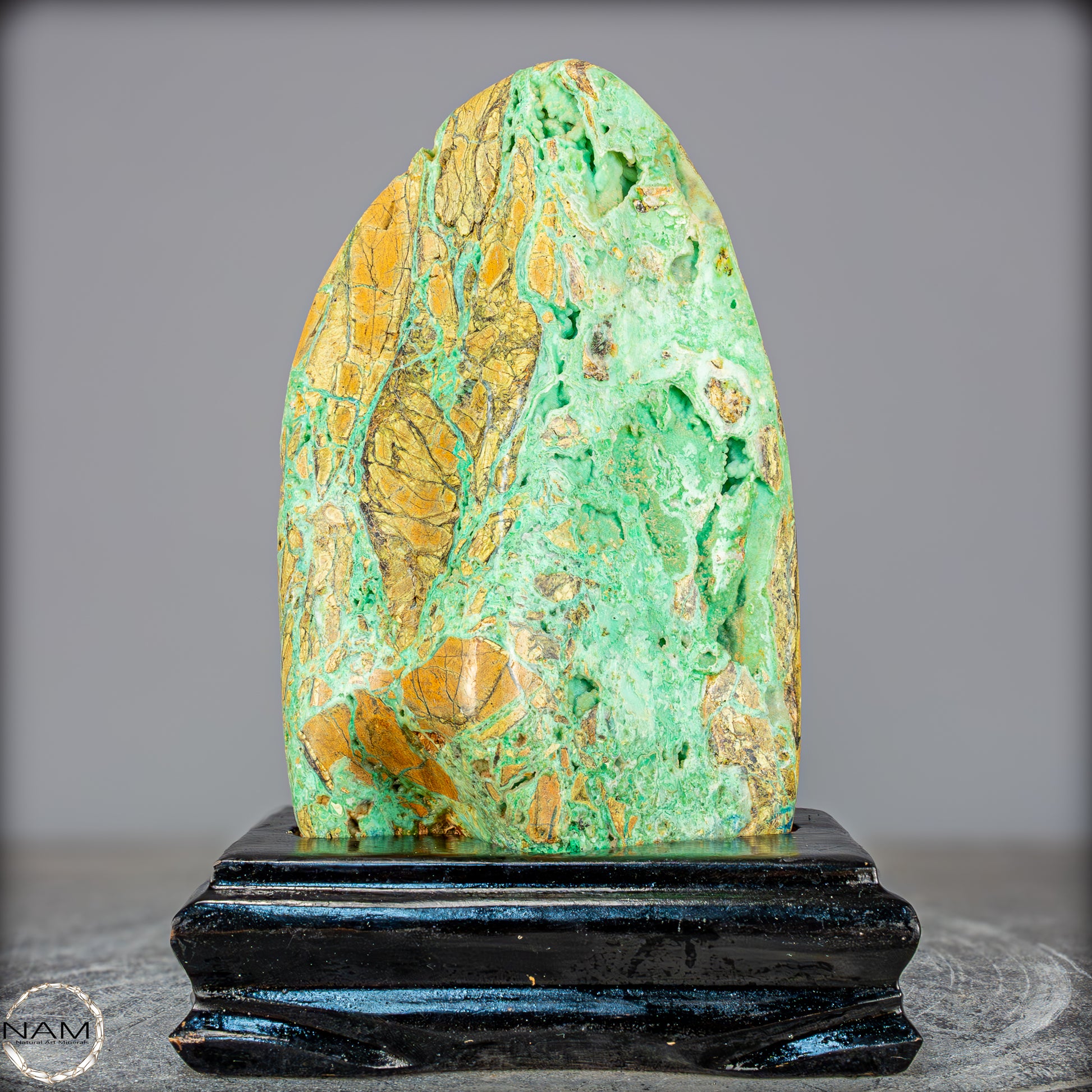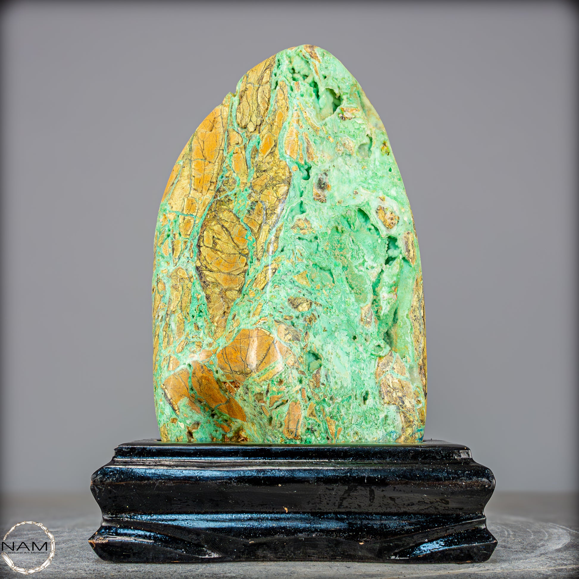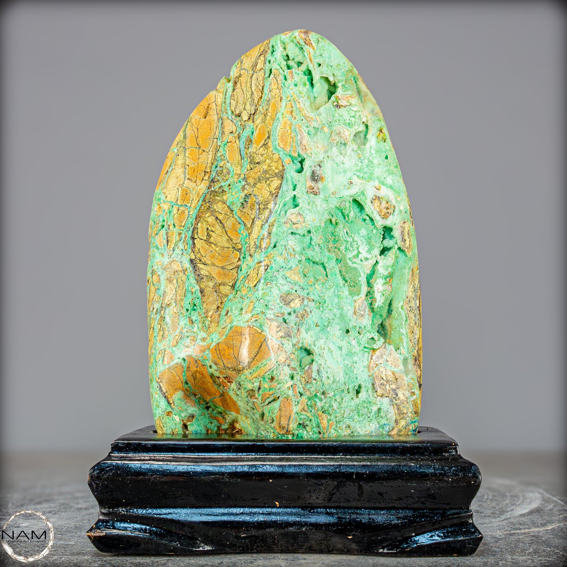 Natürliche Chrysopras-Freiform, die auf einem handgefertigten Holzständer präsentiert wird. Der Chrysopras hat eine beeindruckende grüne Färbung, die typisch für diesen Halbedelstein ist. Die Struktur des Steins zeigt die natürlichen Einschlüsse und Maserungen, die dem Chrysopras seinen einzigartigen Charakter verleihen. Der Holzständer, der den Stein hält, ergänzt das natürliche Erscheinungsbild und hebt die Schönheit des Steins hervor. Dieses dekorative Stück ist sowohl ästhetisch ansprechend als auch symbolisch wertvoll, da Chrysopras oft als Stein der Heilung und des inneren Friedens betrachtet wird.