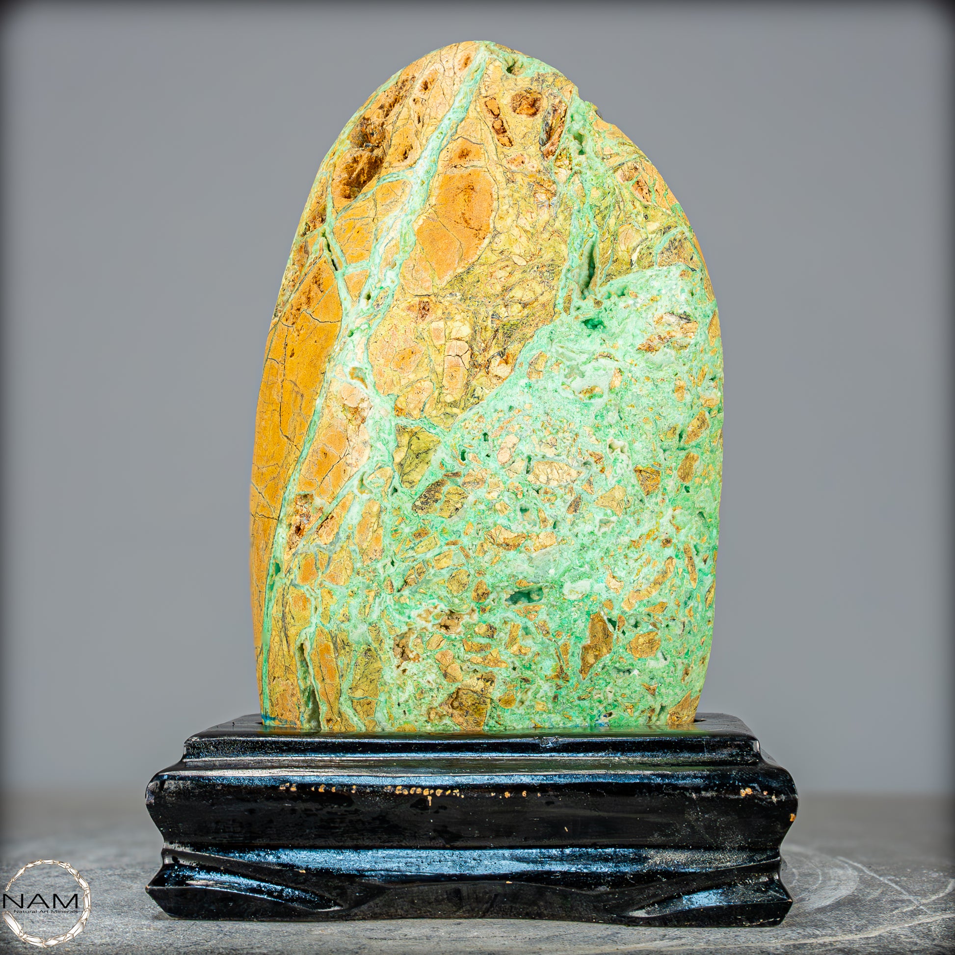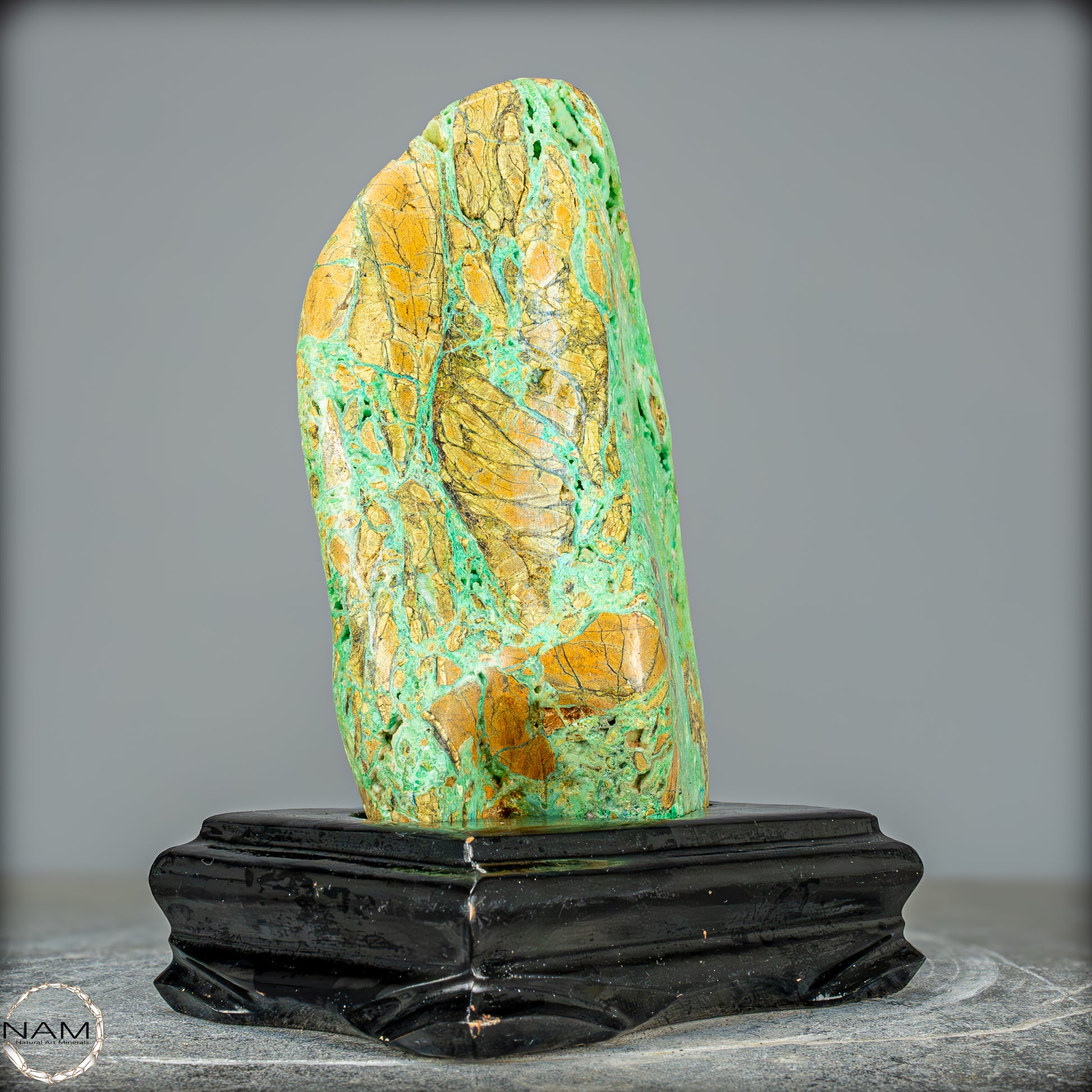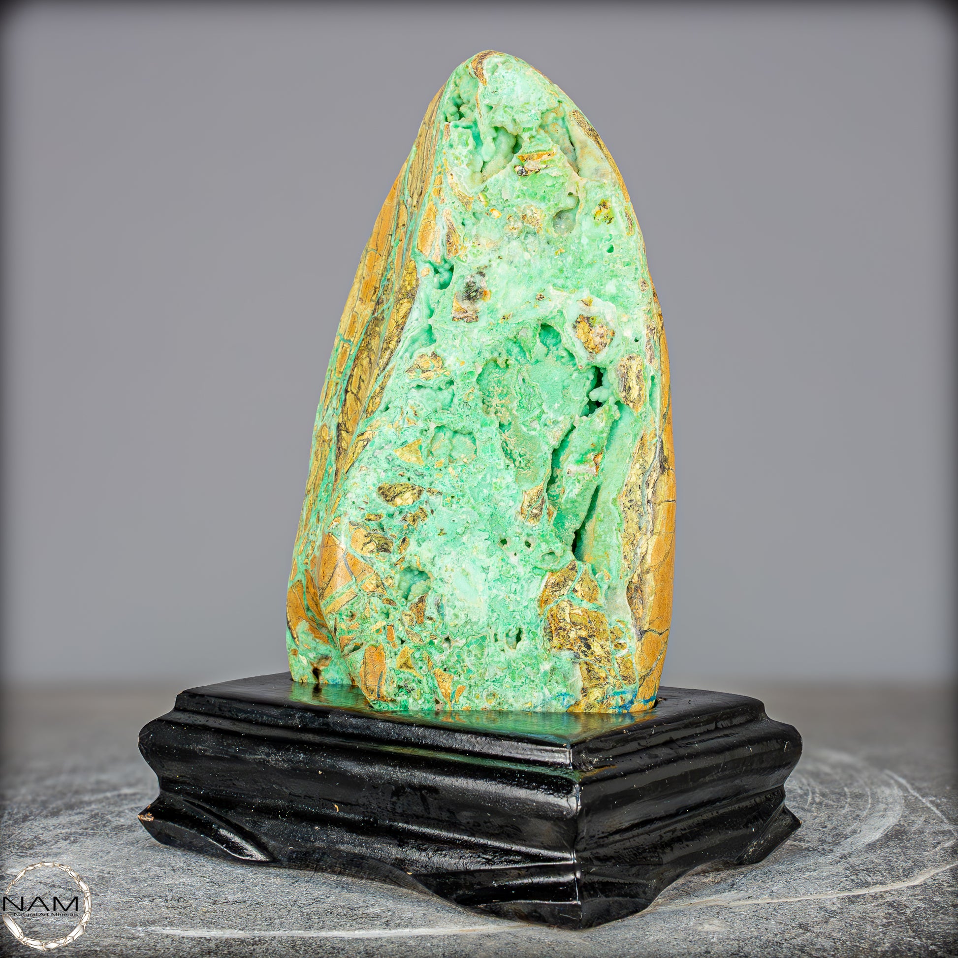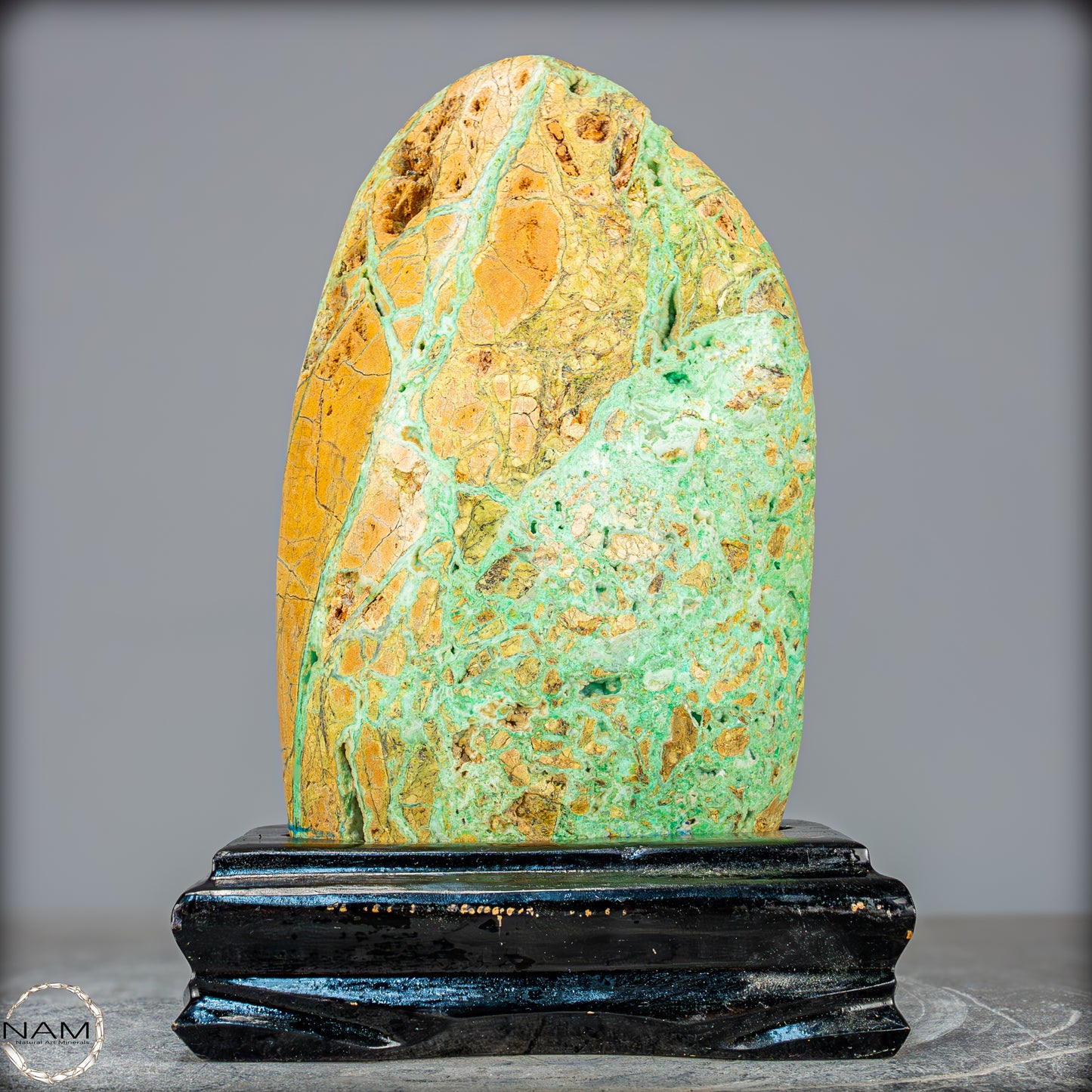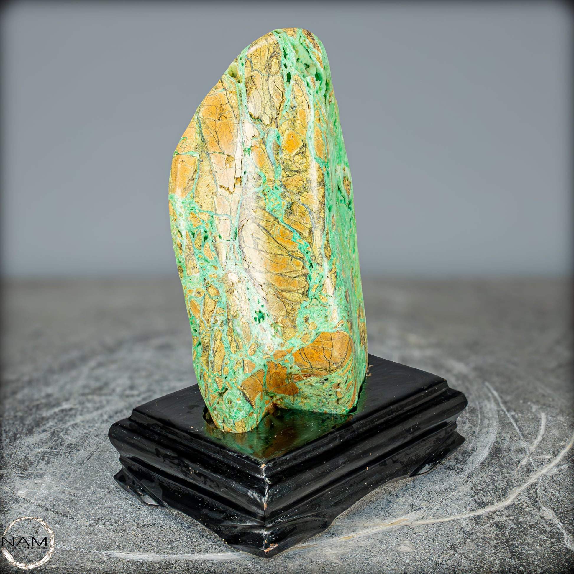 Natürliche Chrysopras-Freiform, die auf einem handgefertigten Holzständer präsentiert wird. Der Chrysopras hat eine beeindruckende grüne Färbung, die typisch für diesen Halbedelstein ist. Die Struktur des Steins zeigt die natürlichen Einschlüsse und Maserungen, die dem Chrysopras seinen einzigartigen Charakter verleihen. Der Holzständer, der den Stein hält, ergänzt das natürliche Erscheinungsbild und hebt die Schönheit des Steins hervor. Dieses dekorative Stück ist sowohl ästhetisch ansprechend als auch symbolisch wertvoll, da Chrysopras oft als Stein der Heilung und des inneren Friedens betrachtet wird.