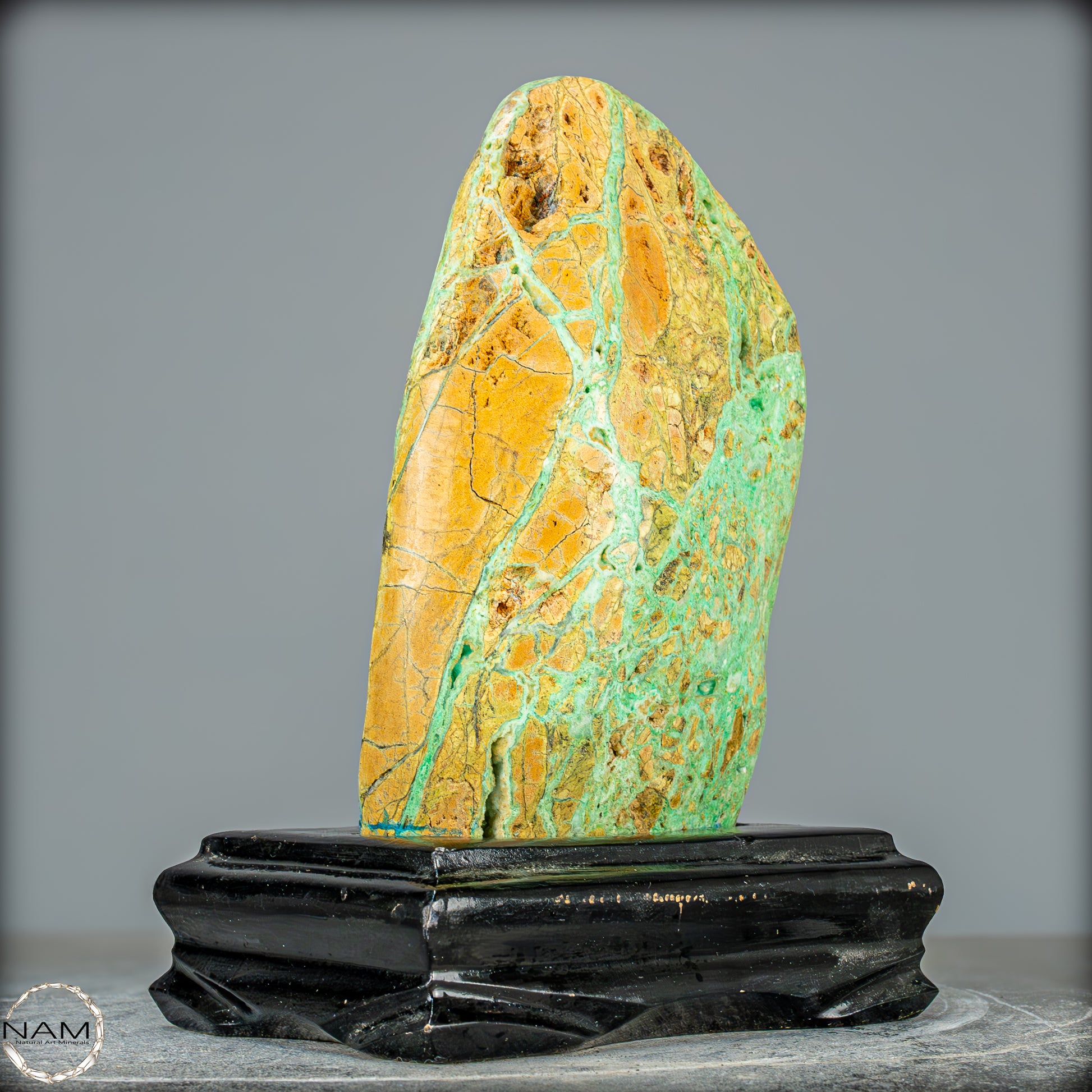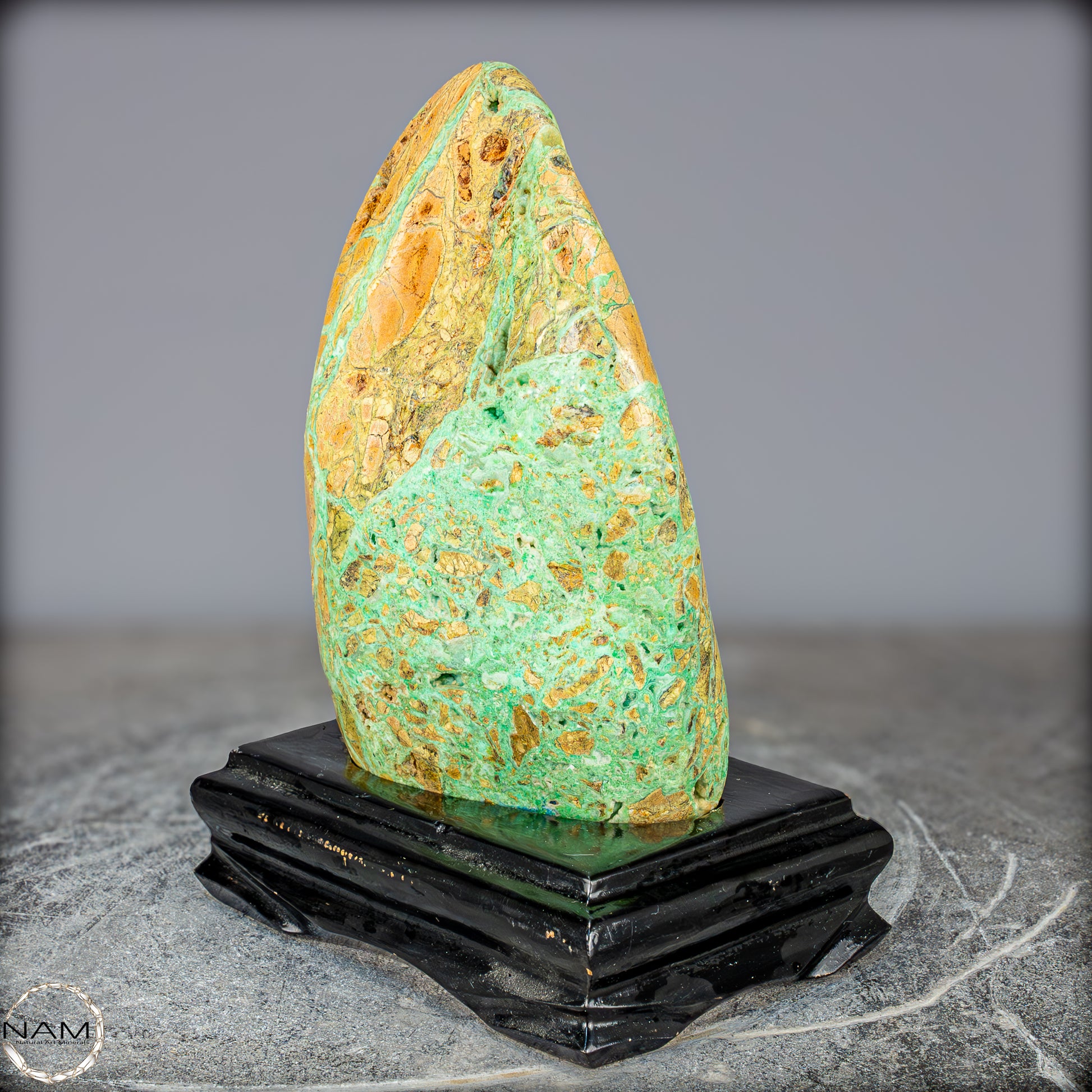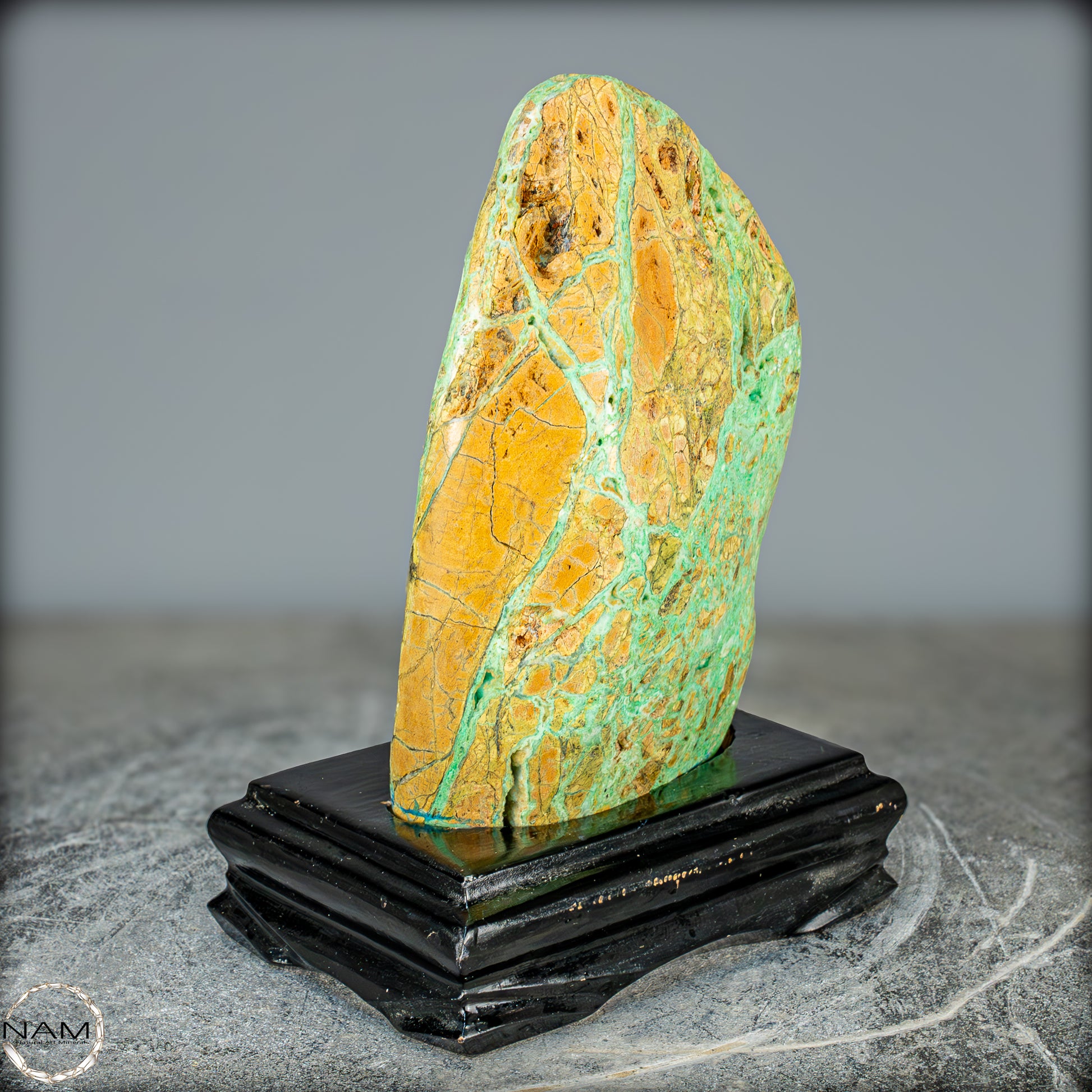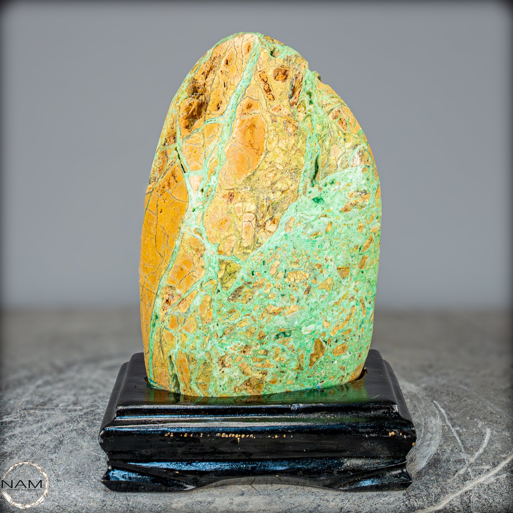 Natürliche Chrysopras-Freiform, die auf einem handgefertigten Holzständer präsentiert wird. Der Chrysopras hat eine beeindruckende grüne Färbung, die typisch für diesen Halbedelstein ist. Die Struktur des Steins zeigt die natürlichen Einschlüsse und Maserungen, die dem Chrysopras seinen einzigartigen Charakter verleihen. Der Holzständer, der den Stein hält, ergänzt das natürliche Erscheinungsbild und hebt die Schönheit des Steins hervor. Dieses dekorative Stück ist sowohl ästhetisch ansprechend als auch symbolisch wertvoll, da Chrysopras oft als Stein der Heilung und des inneren Friedens betrachtet wird.