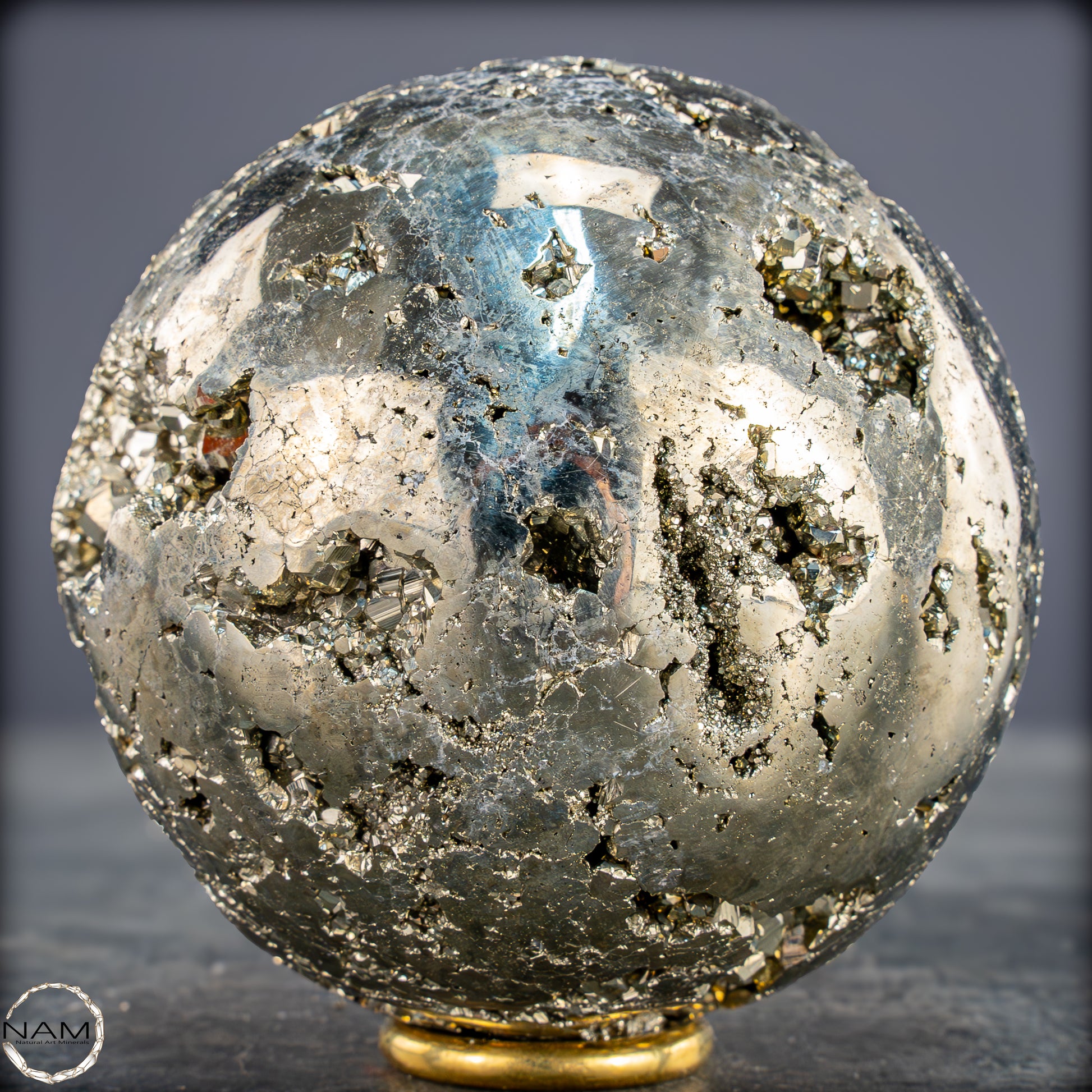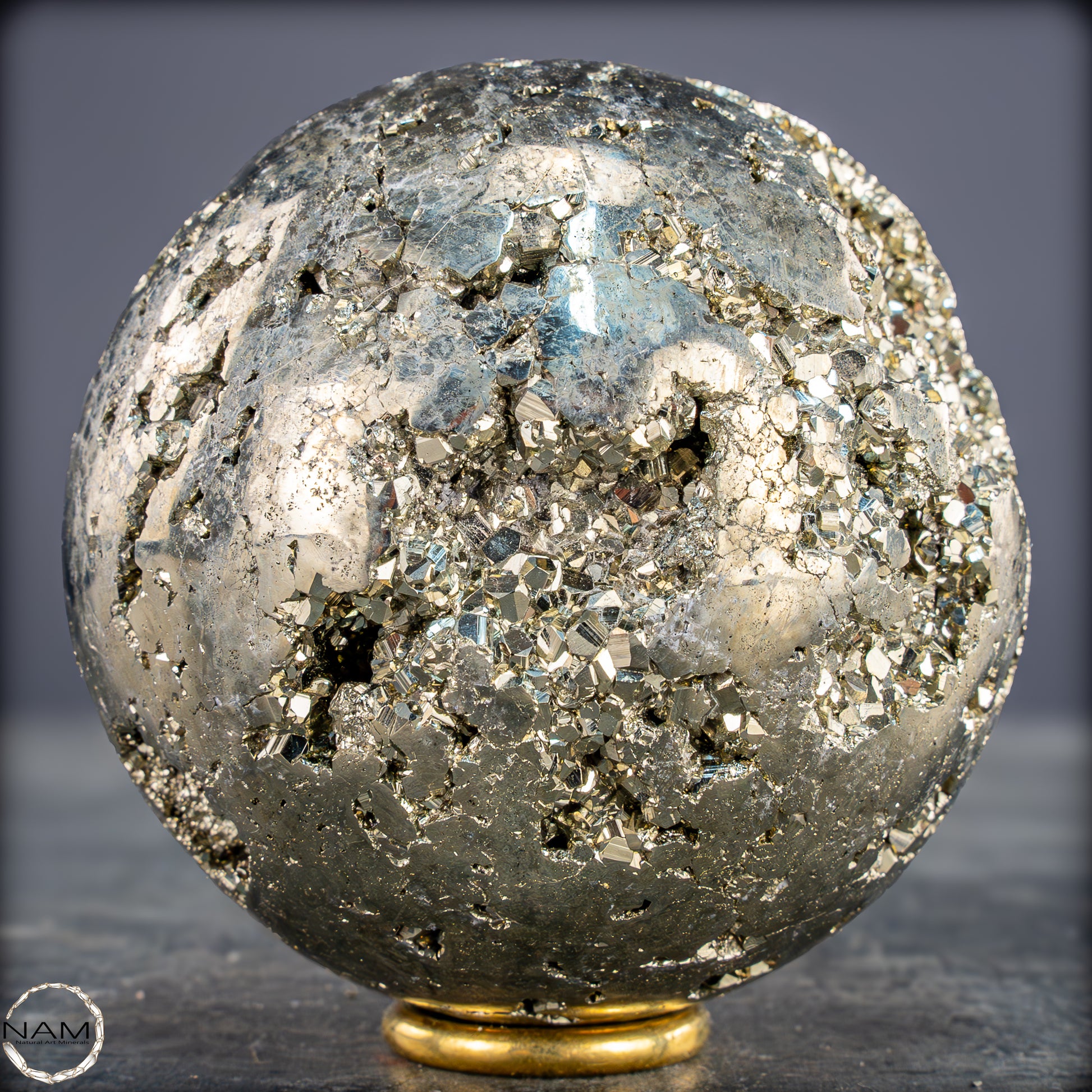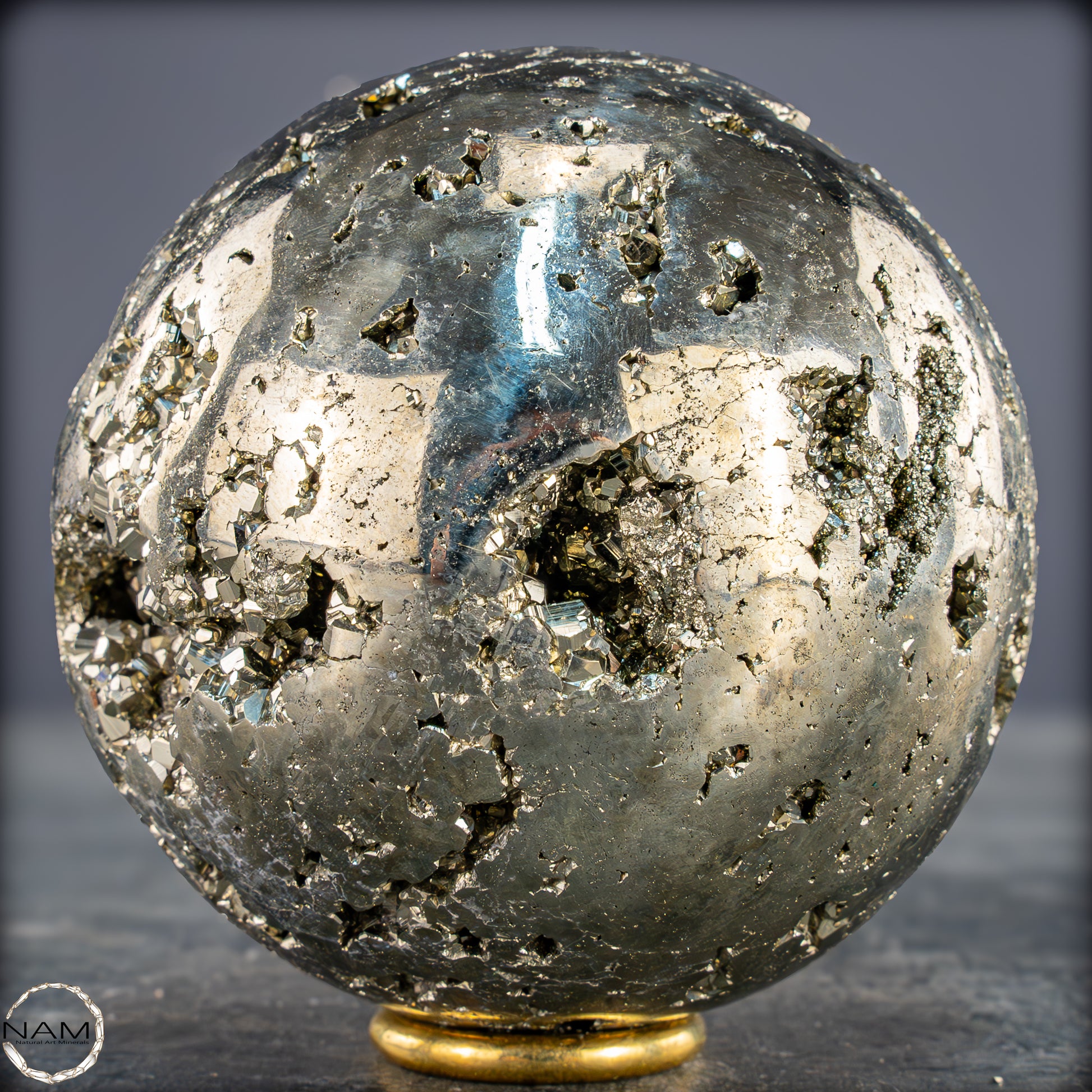 Wunderschönes Exemplar aus kubischem Pyrit, das so bearbeitet wurde, dass es eine Kugelform erhält, dem durch das Vorhandensein von Hohlräumen auf der Oberfläche ein zusätzlicher Wert zugeschrieben wird, der es Ihnen ermöglicht, Teile der gebildeten Geode zu bewundern.