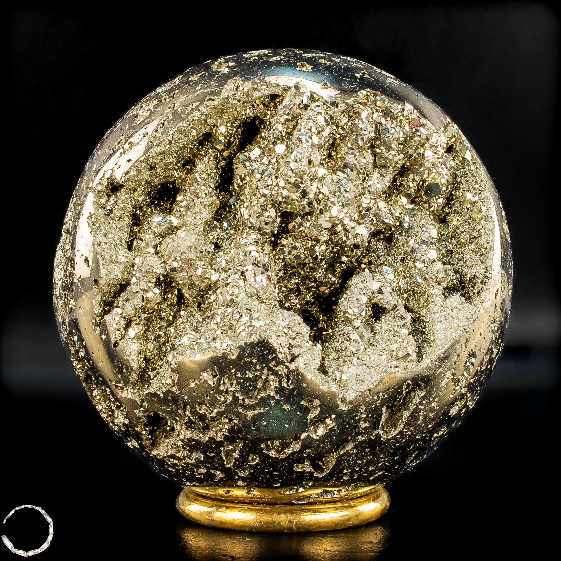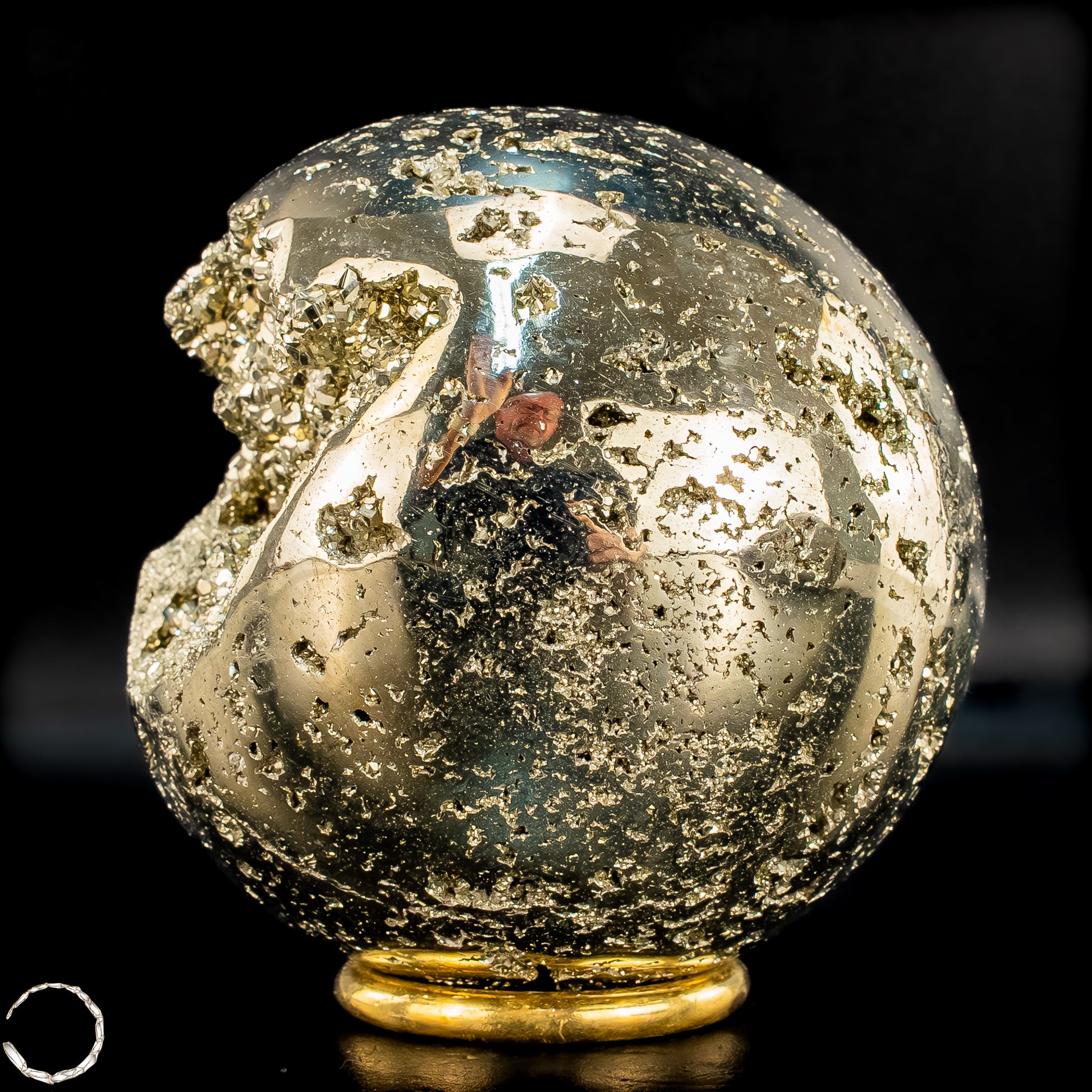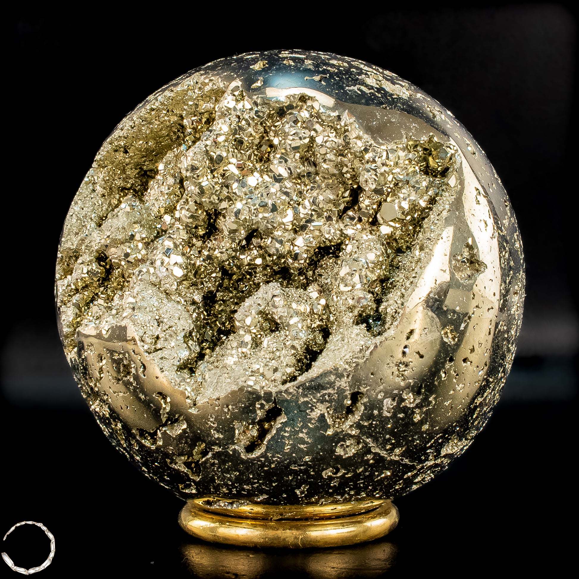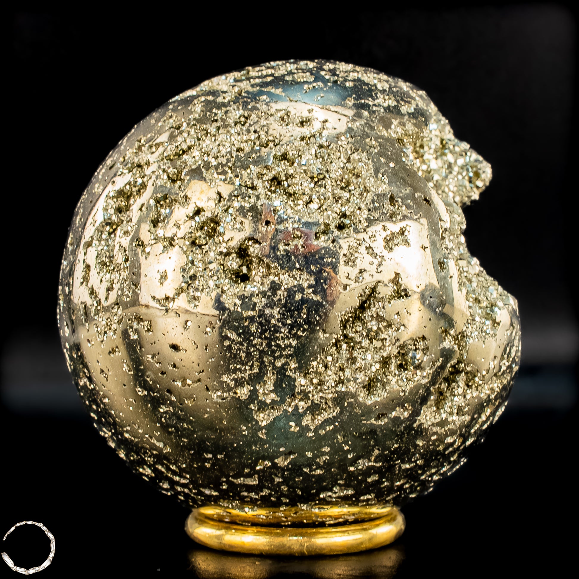 Wunderschönes Exemplar aus kubischem Pyrit, das so bearbeitet wurde, dass es eine Kugelform erhält, dem durch das Vorhandensein von Hohlräumen auf der Oberfläche ein zusätzlicher Wert zugeschrieben wird, der es Ihnen ermöglicht, Teile der gebildeten Geode zu bewundern.