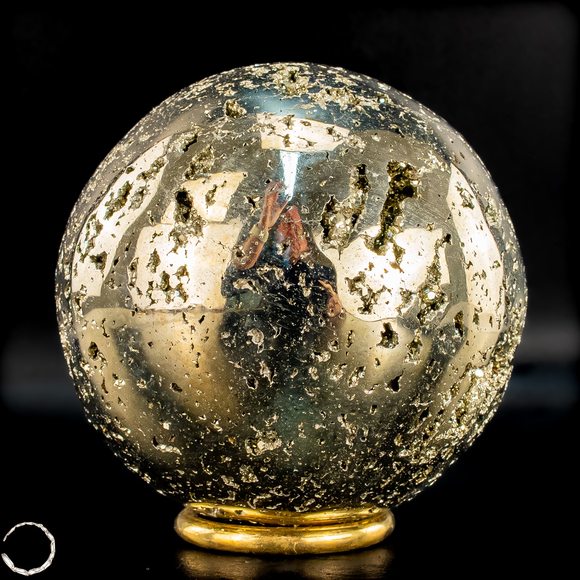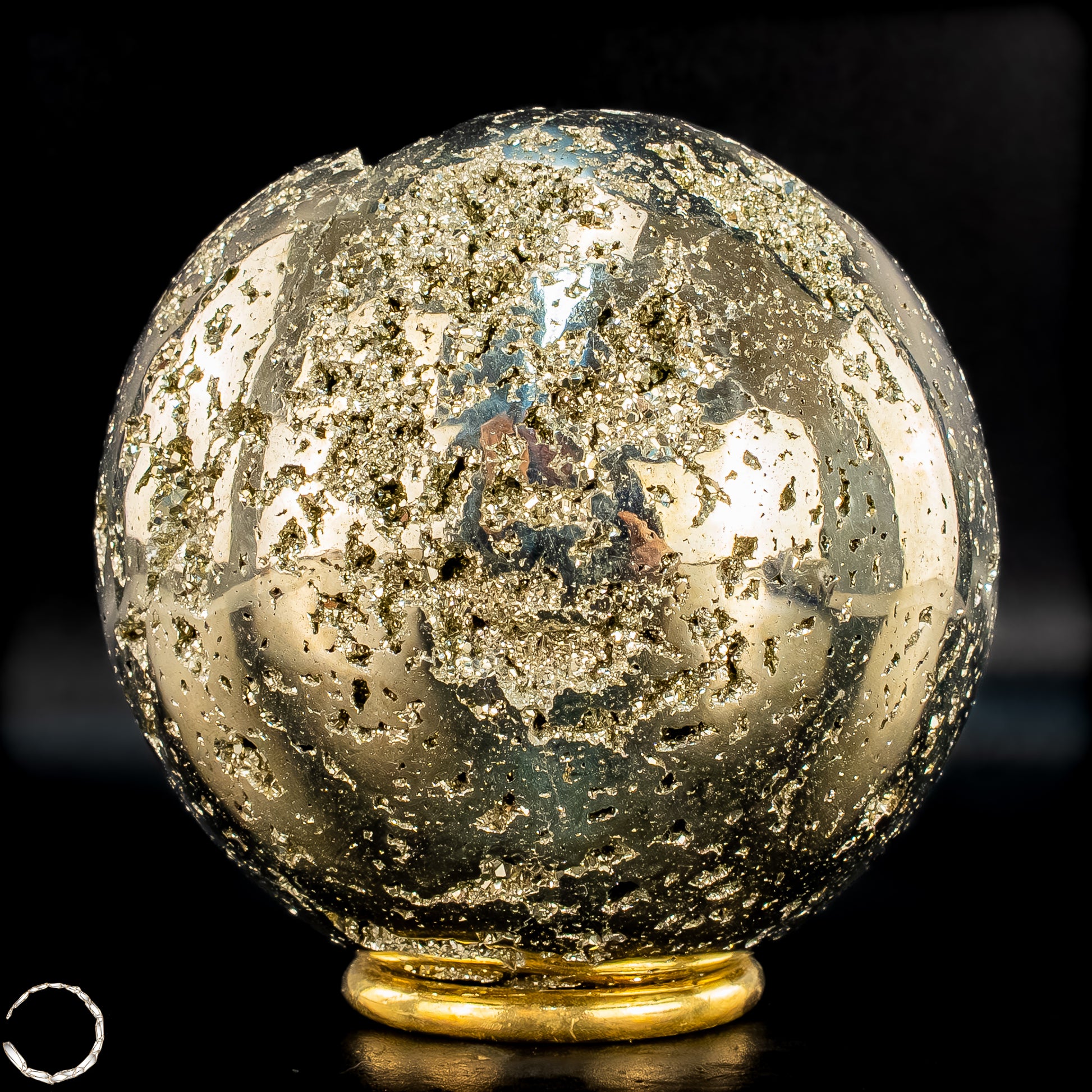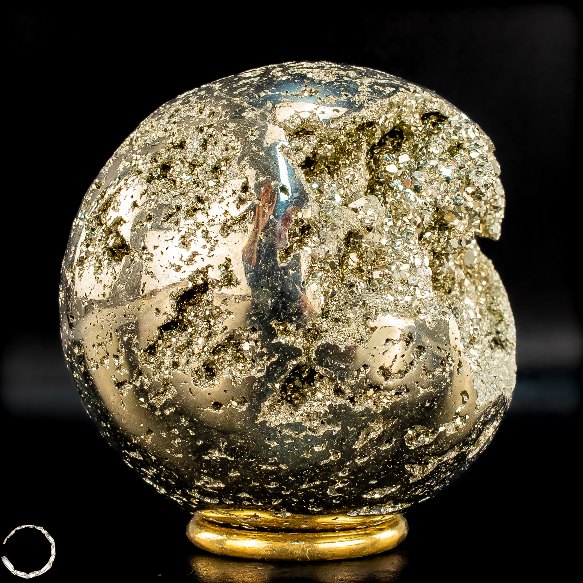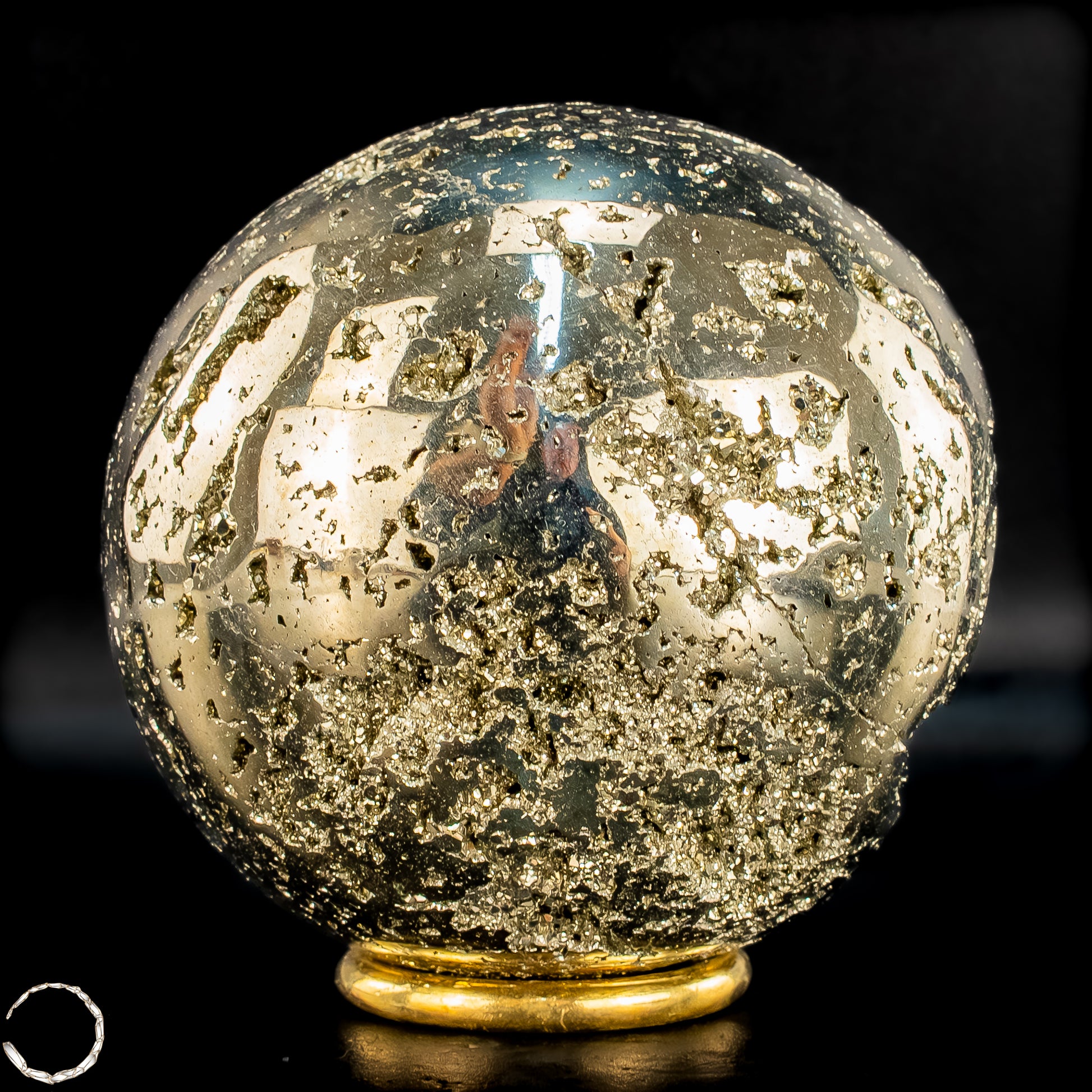 Wunderschönes Exemplar aus kubischem Pyrit, das so bearbeitet wurde, dass es eine Kugelform erhält, dem durch das Vorhandensein von Hohlräumen auf der Oberfläche ein zusätzlicher Wert zugeschrieben wird, der es Ihnen ermöglicht, Teile der gebildeten Geode zu bewundern.