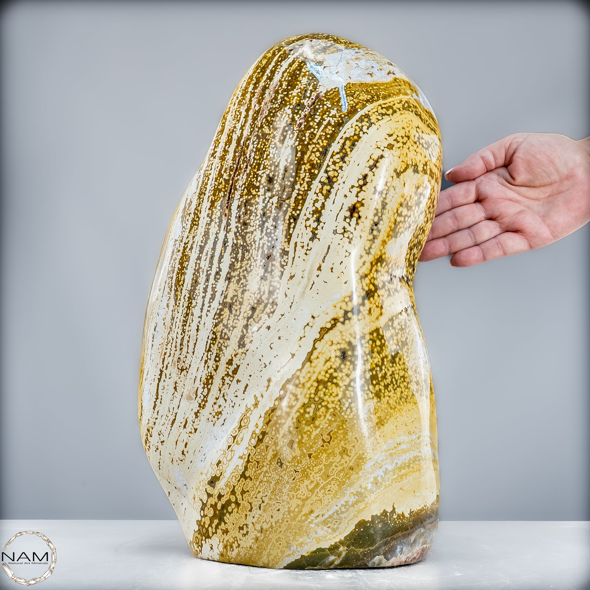 Dieses Stück ist nicht nur ein visueller Genuss, sondern auch ein energetisches Meisterwerk, das die Vorteile des Ocean Achats in perfekter Form zur Geltung bringt. Ein wahres Schmuckstück aus der Natur, das in keinem Raum fehlen darf.
