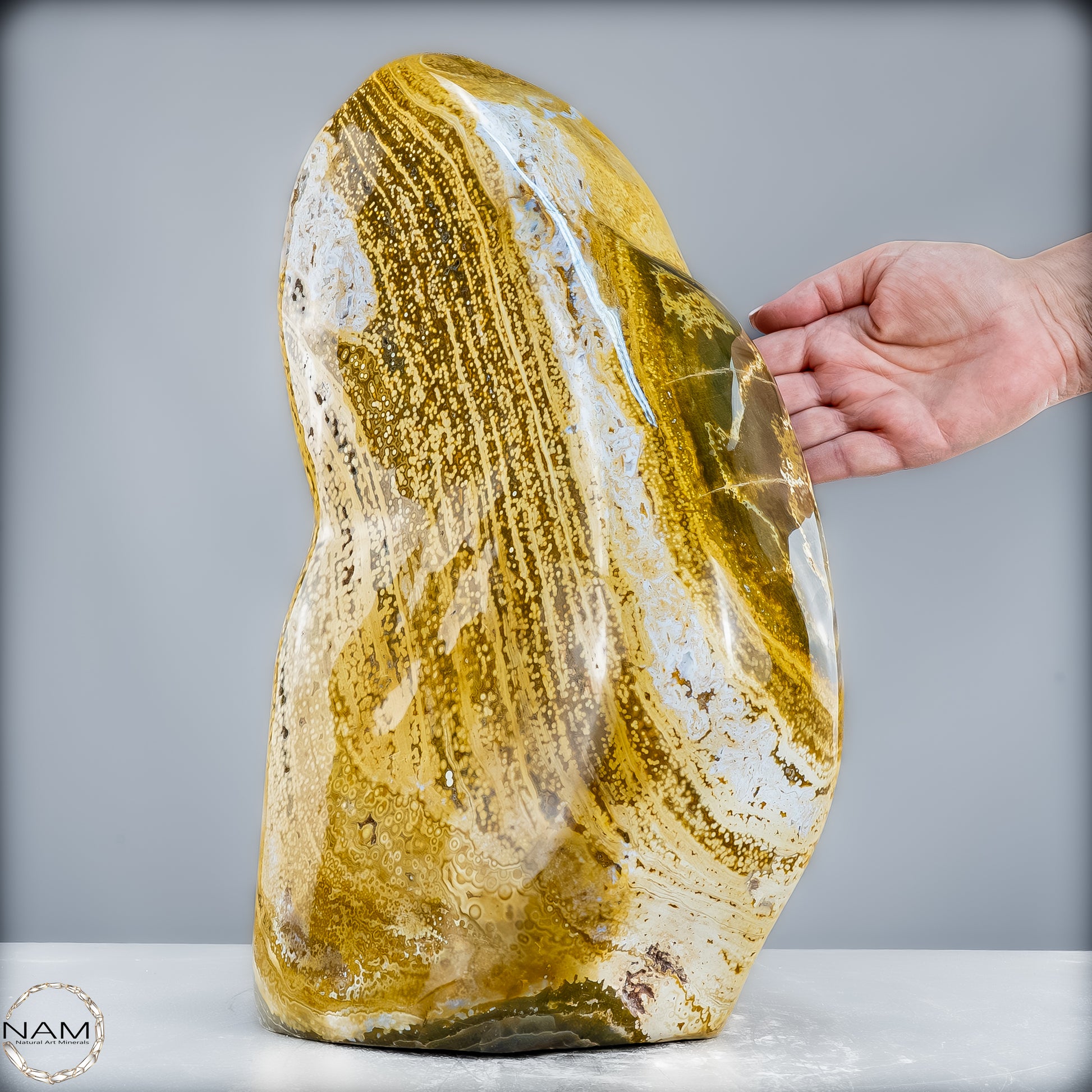 Mit ihrer imposanten Größe und der makellosen Oberfläche ist diese Ocean Achat Freiform ein absolutes Highlight für Sammler und Liebhaber von Edelsteinen. Sie kann als außergewöhnliches Dekorationsobjekt in einem modernen Zuhause oder als kraftvolle energetische Quelle in spirituellen Räumen genutzt werden. Ihre Größe und Schönheit ziehen alle Blicke auf sich und schaffen eine Atmosphäre der Ruhe und positiven Energie.
