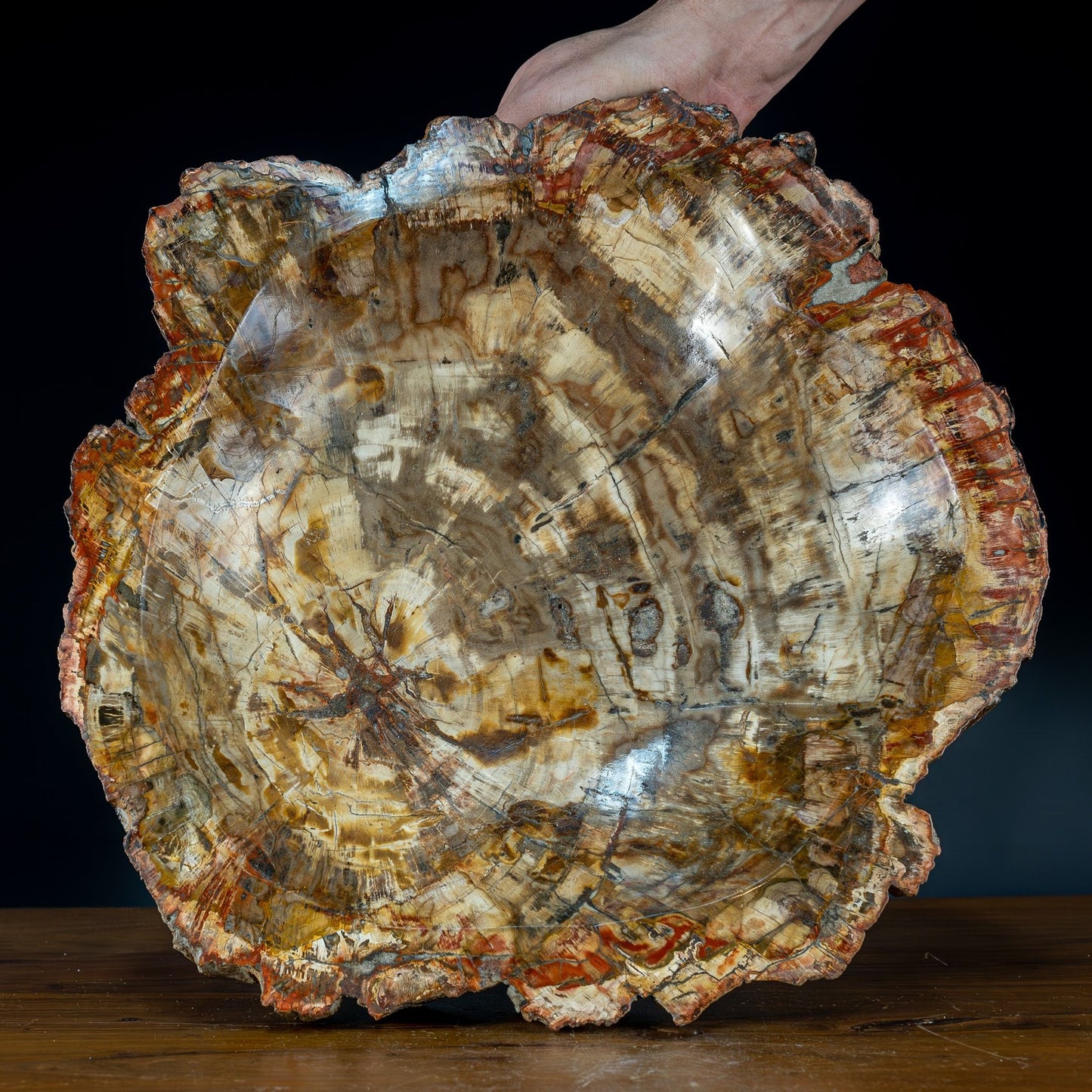 Diese beeindruckende Schüssel besteht aus versteinertem Holz, das einst lebendig war und im Laufe von Millionen Jahren durch natürliche Prozesse in Stein umgewandelt wurde. Versteinertes Holz entsteht, wenn pflanzliches Material unter einer Schicht von Sedimenten begraben wird und im Laufe der Zeit durch Mineralien wie Quarz ersetzt wird, wobei die ursprüngliche Struktur des Holzes erhalten bleibt.