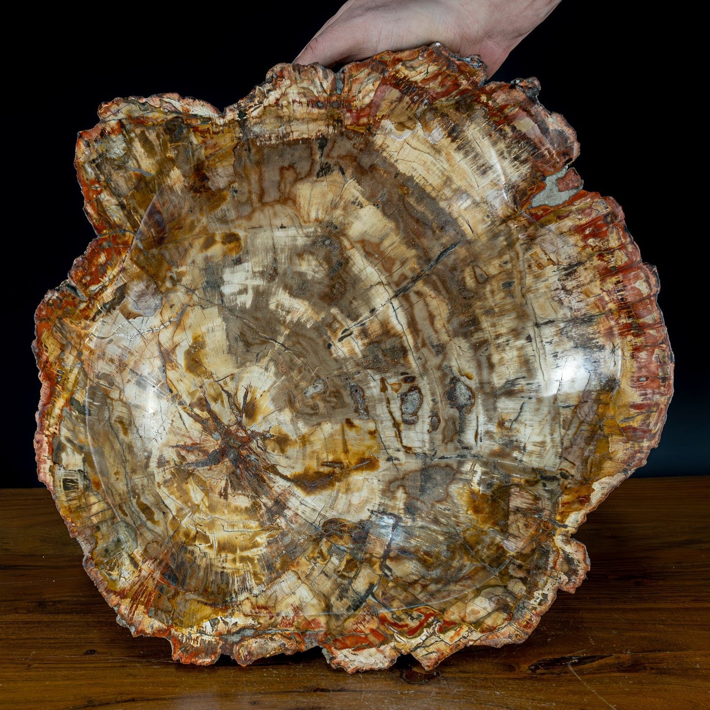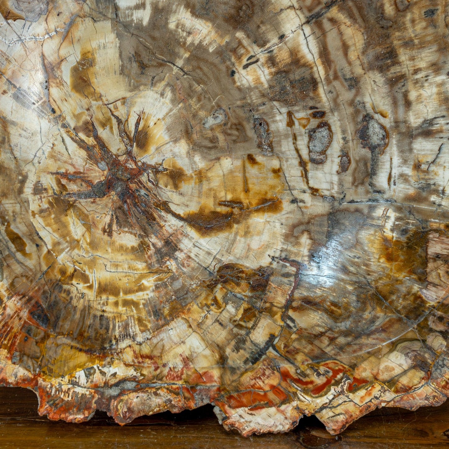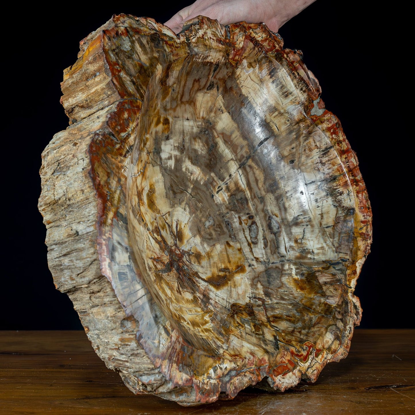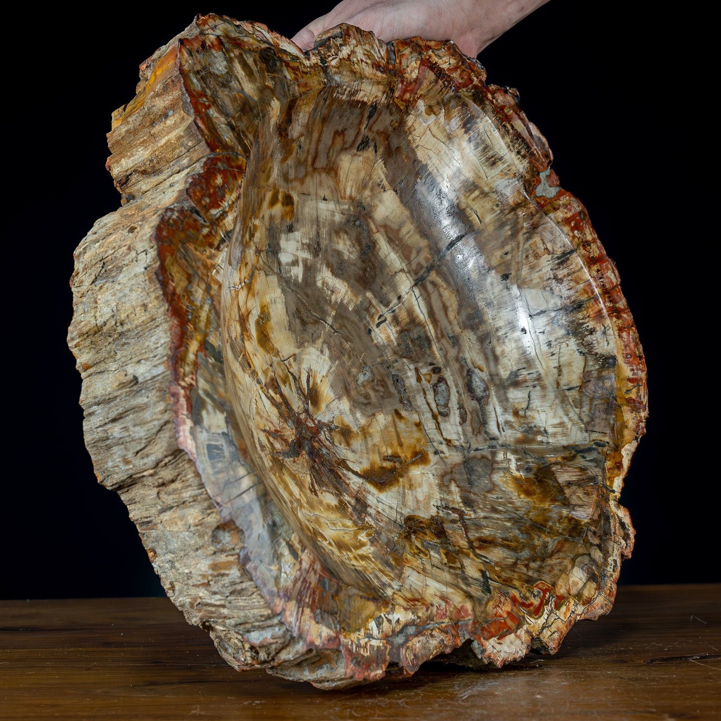 Diese Schüssel zeigt eine reiche Palette von erdigen Farbtönen, darunter Brauntöne, Rot, Gelb und Grau. Die Maserung und die Textur des versteinerten Holzes sind deutlich sichtbar und verleihen der Schüssel eine natürliche, rustikale Schönheit. Die Schüssel hat eine organische Form, die die natürliche Kontur des ursprünglichen Holzstücks respektiert und hervorhebt.