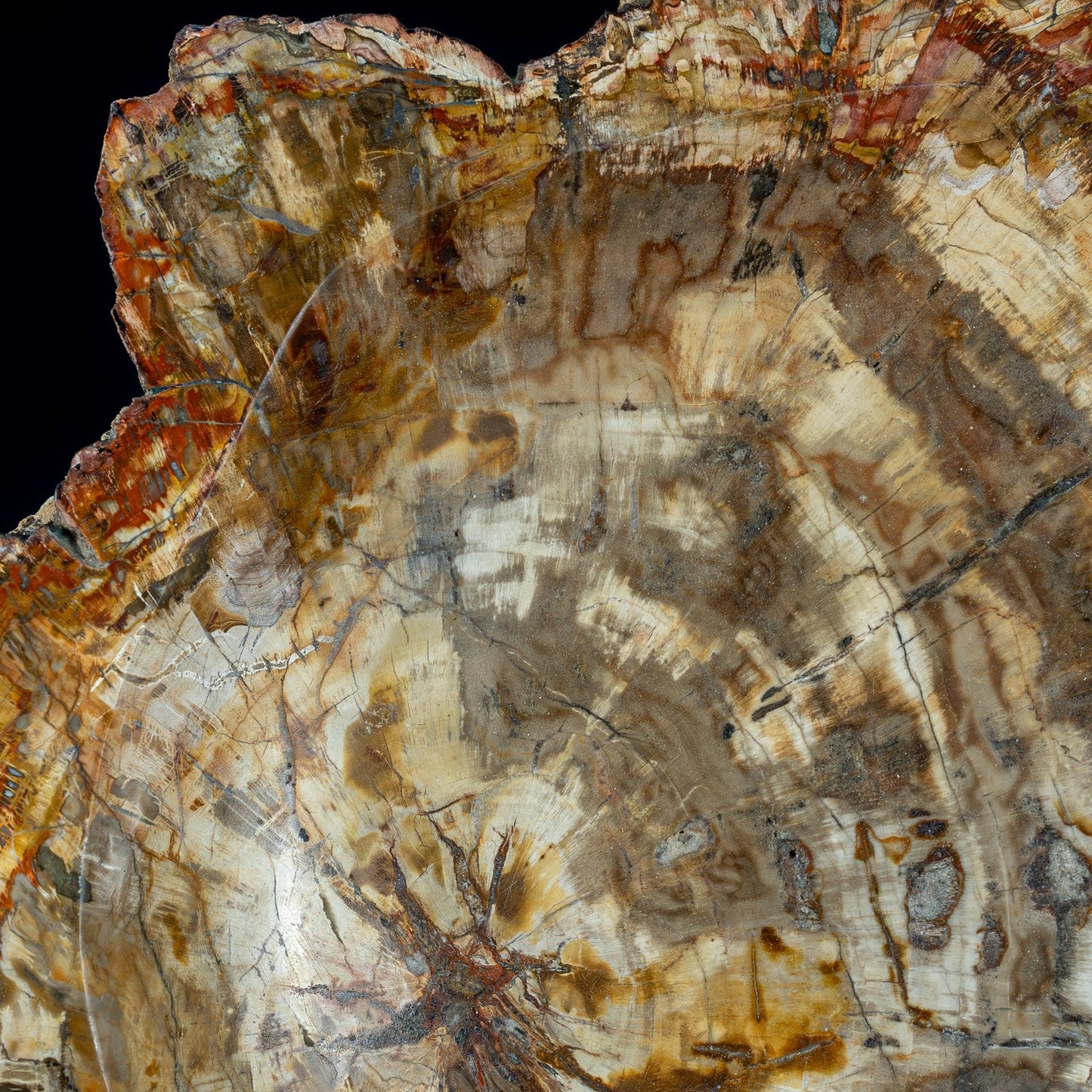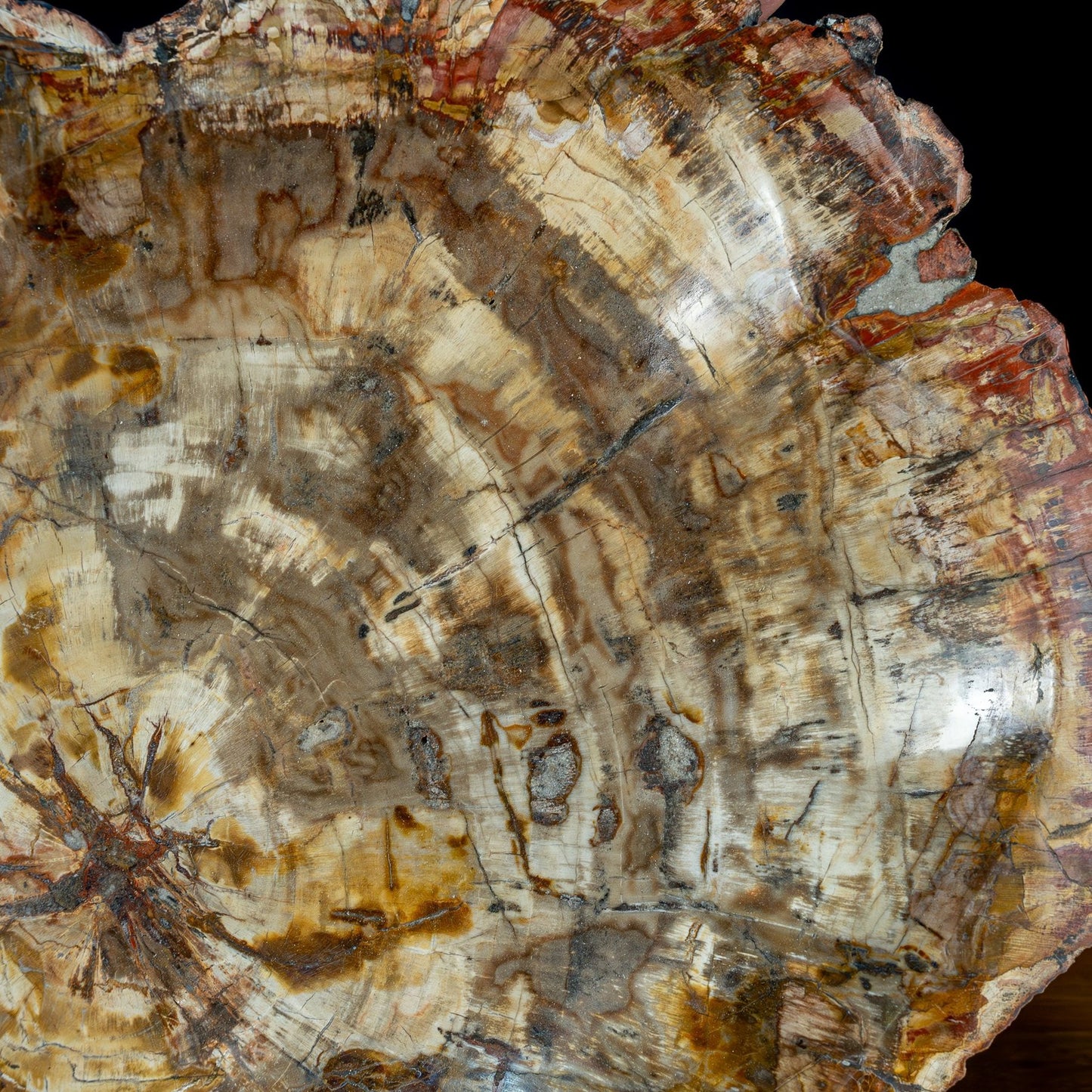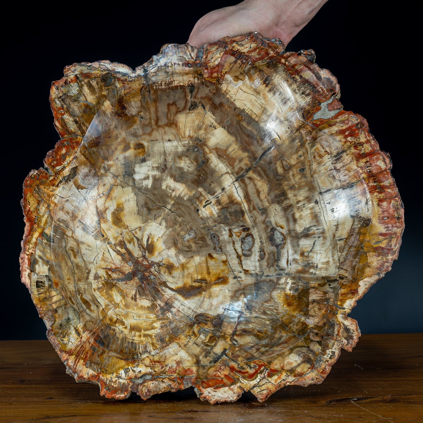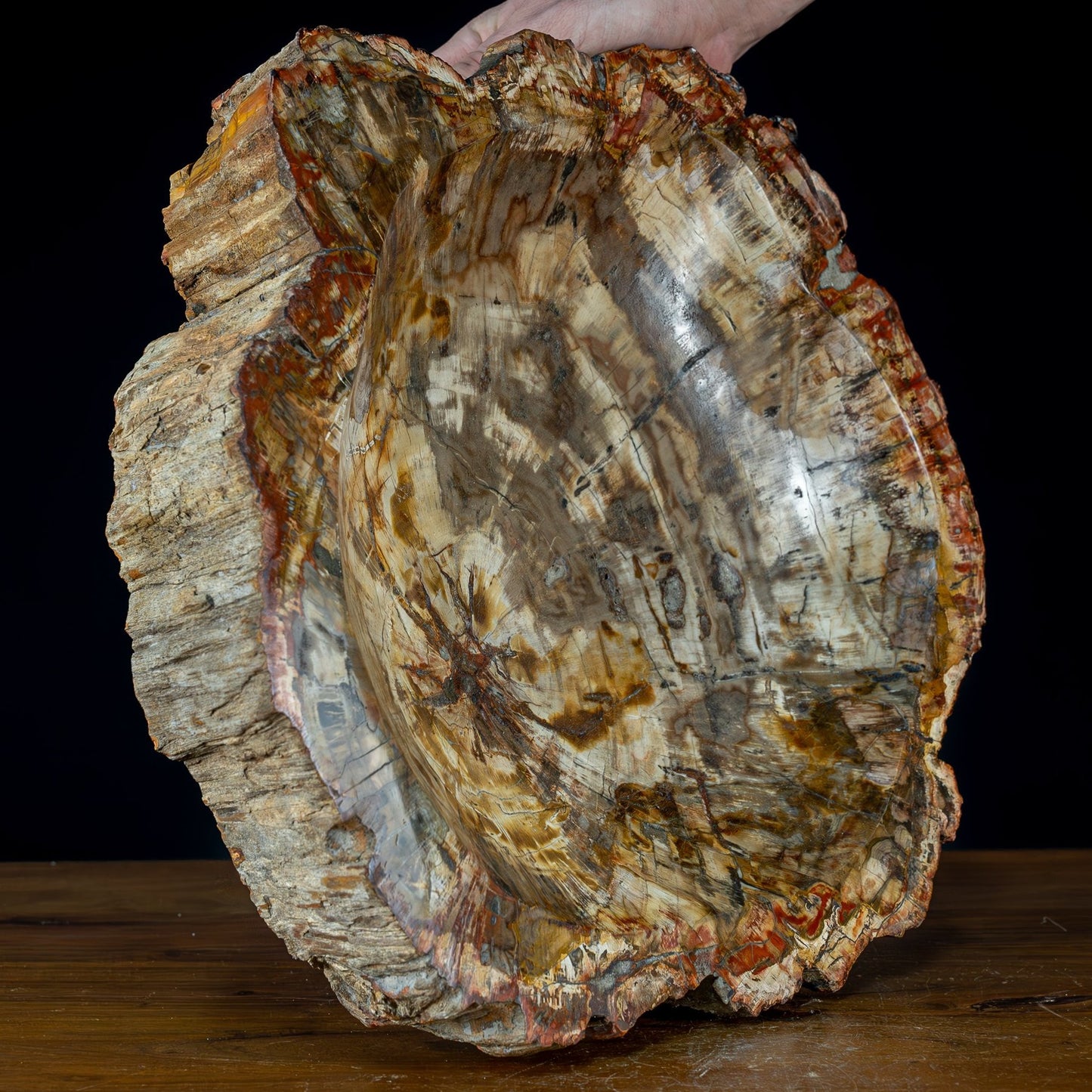 Diese Schüssel zeigt eine reiche Palette von erdigen Farbtönen, darunter Brauntöne, Rot, Gelb und Grau. Die Maserung und die Textur des versteinerten Holzes sind deutlich sichtbar und verleihen der Schüssel eine natürliche, rustikale Schönheit. Die Schüssel hat eine organische Form, die die natürliche Kontur des ursprünglichen Holzstücks respektiert und hervorhebt.