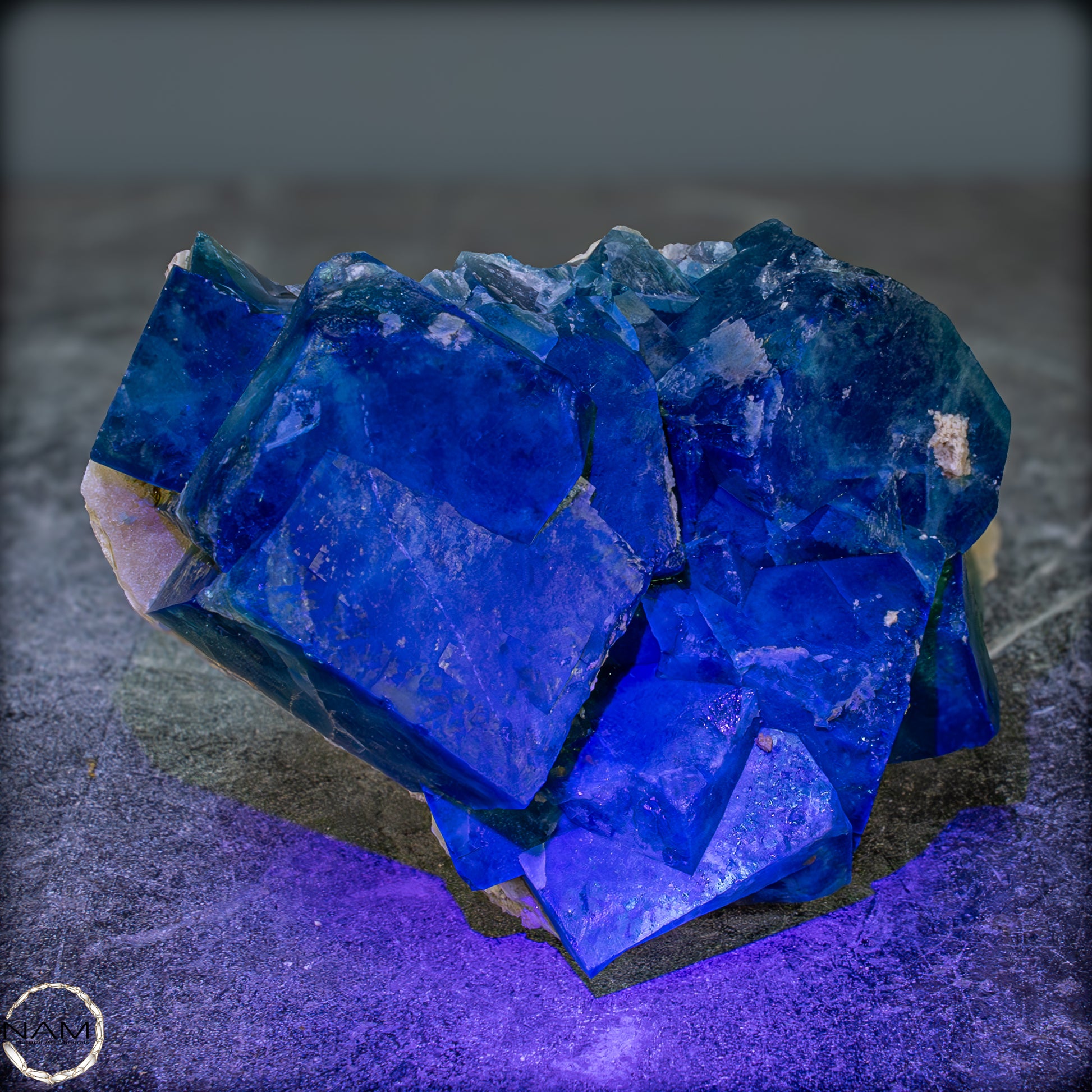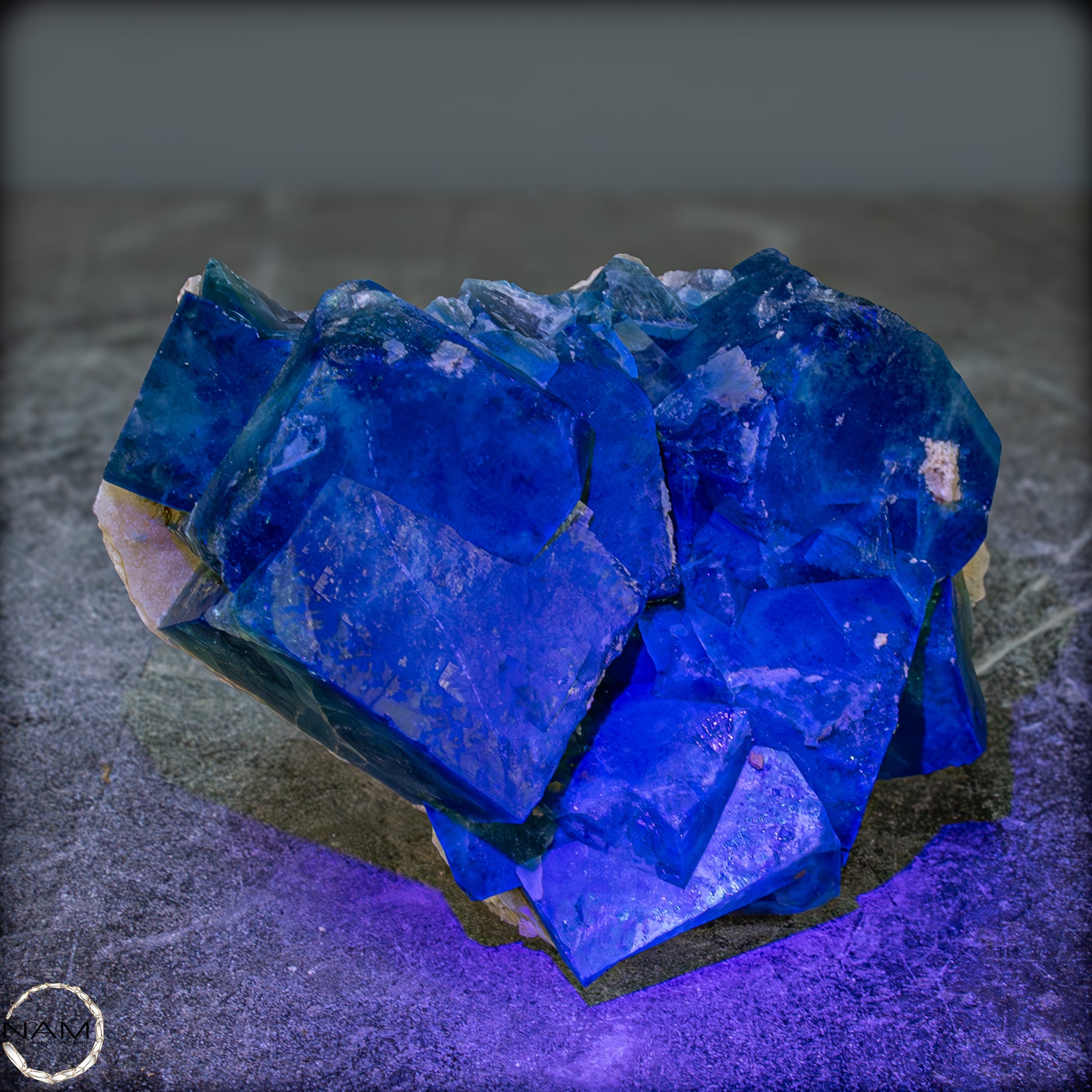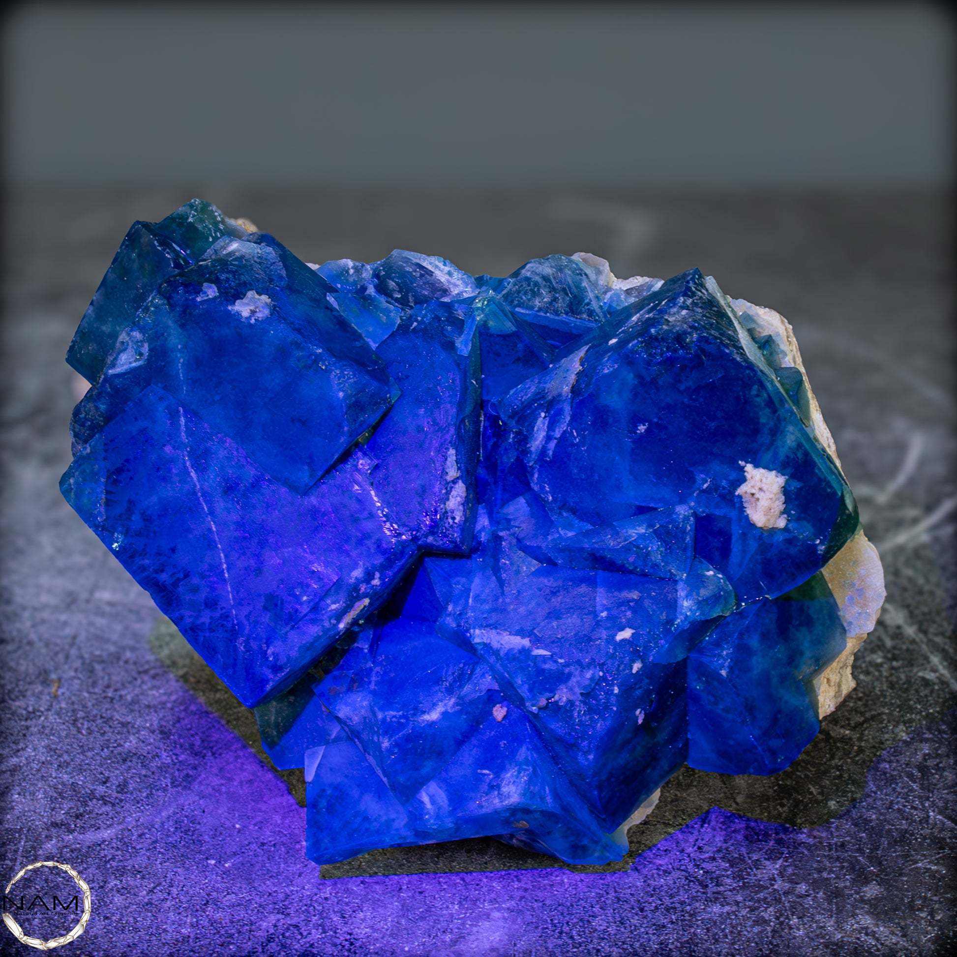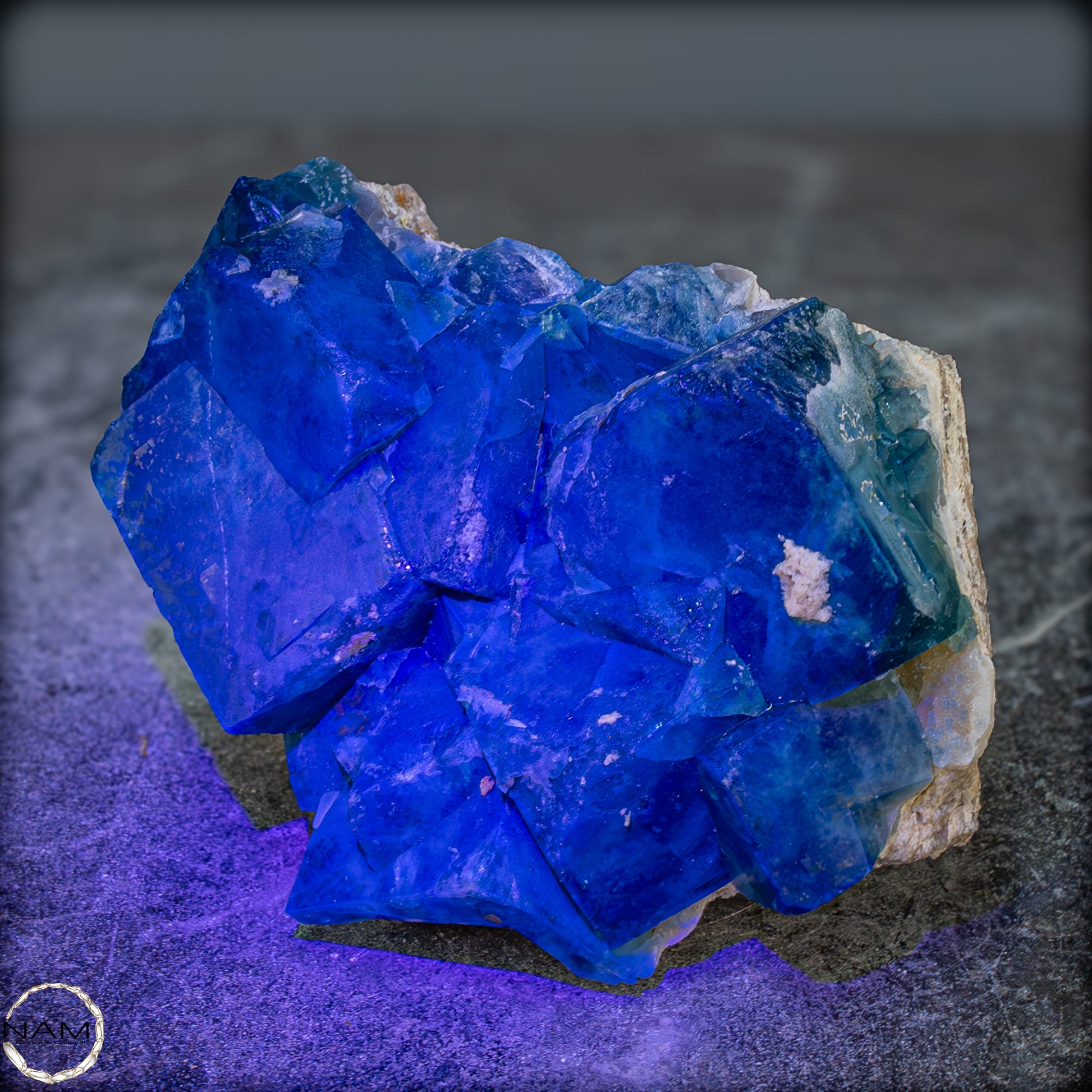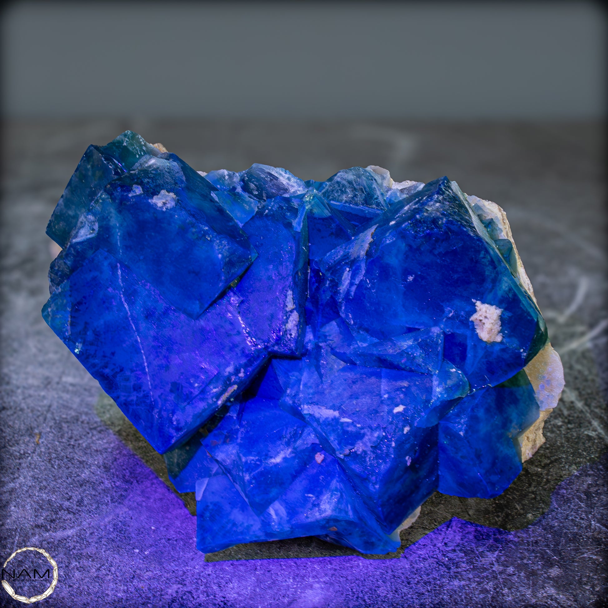 Unter UV-Licht offenbart sich ein spektakuläres Schauspiel: Die Fluoritkristalle beginnen intensiv in einem leuchtenden Blau zu fluoreszieren, das die grüne Grundfarbe vollständig überstrahlt. Dieses Wechselspiel zwischen sichtbarem und UV-Licht macht die Stufe zu einem echten Highlight in jeder Sammlung – sei es in einer Vitrine, bei gezielter Beleuchtung oder als dekoratives Schaustück.