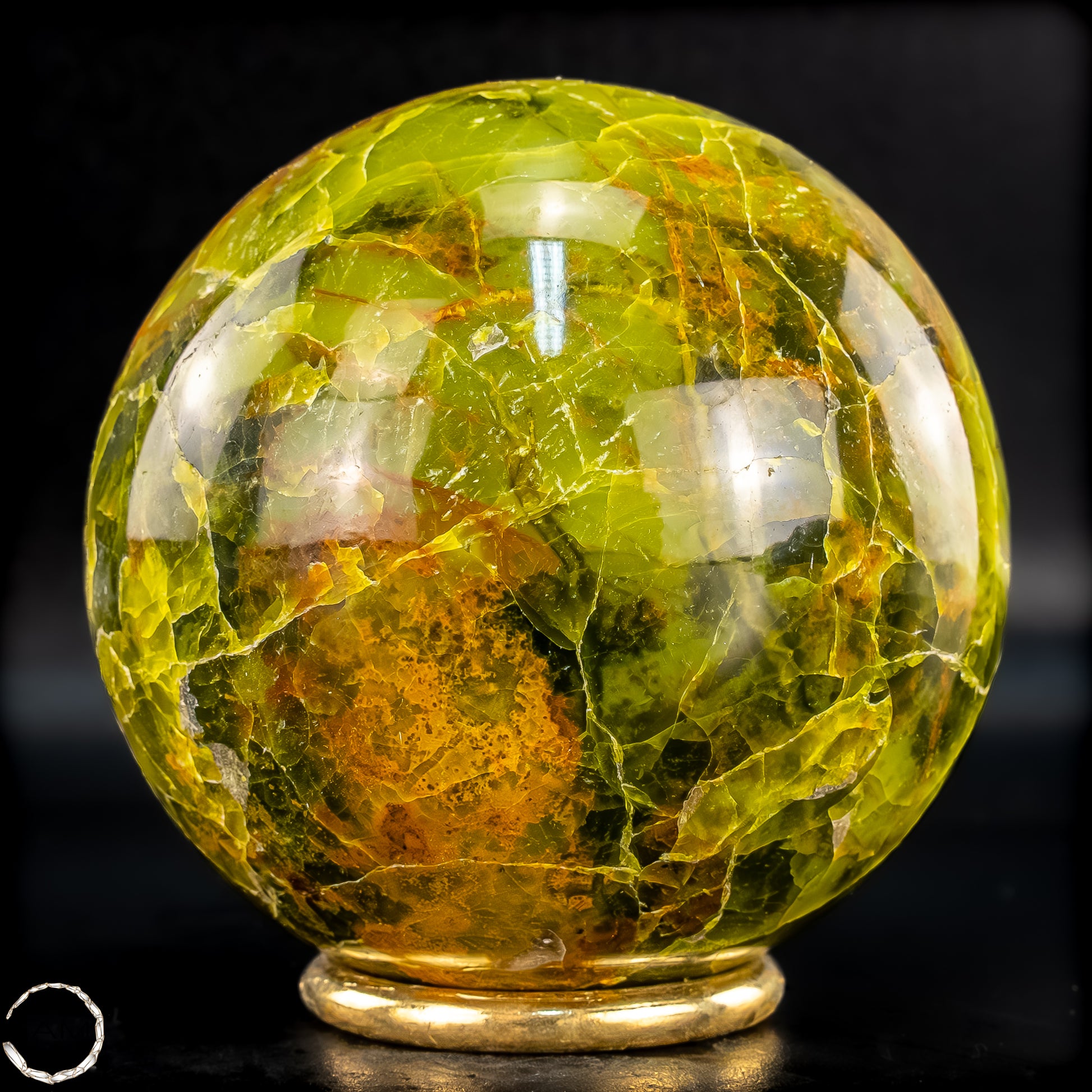Diese Kugel aus grünem Opal zeigt eine faszinierende Tiefe und ein intensives Farbspiel aus lebhaftem Gelbgrün, Oliv- und Moosgrün, durchzogen von feinen, weißlichen Adern und leuchtenden Einschlüssen in Ocker- und Bernsteinfarben. Die polierte Oberfläche verstärkt den schimmernden Charakter des Steins und offenbart eine fast pflanzlich wirkende Struktur, die an ein filigranes Netz aus Blattadern erinnert.