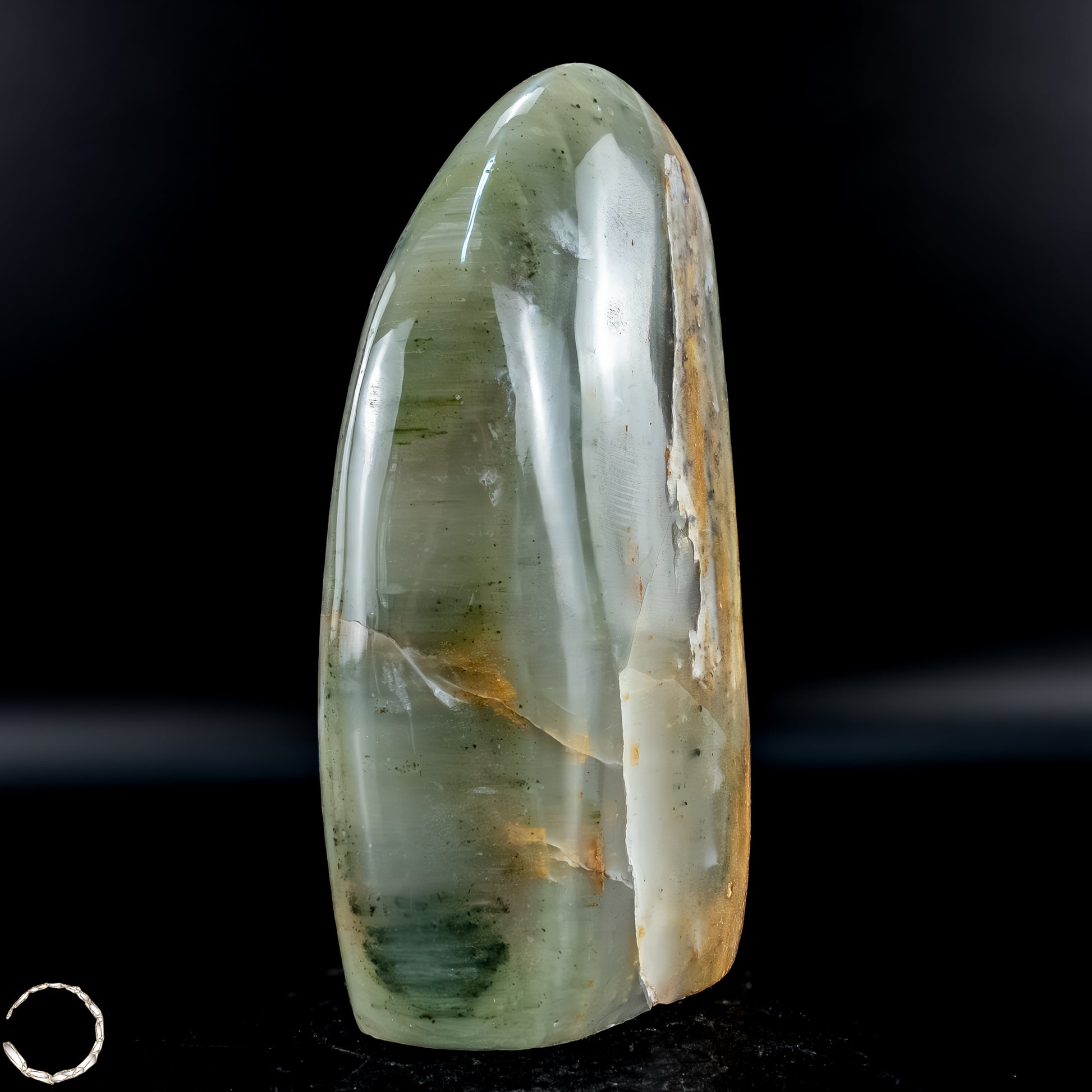 Diese elegante Freiform aus Gartenquarz besticht durch ihre faszinierende Transparenz und die natürliche Landschaft im Inneren des Steins. Der Quarz schimmert in zarten Grün- und Grautönen, durchzogen von mineralischen Einschlüssen in warmen Erdtönen, die wie moosbewachsene Felsen oder urzeitliche Gesteinsschichten wirken.