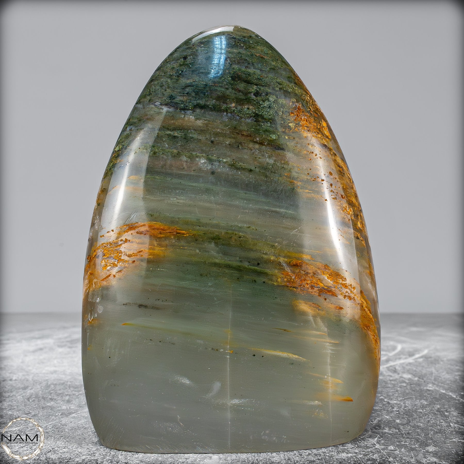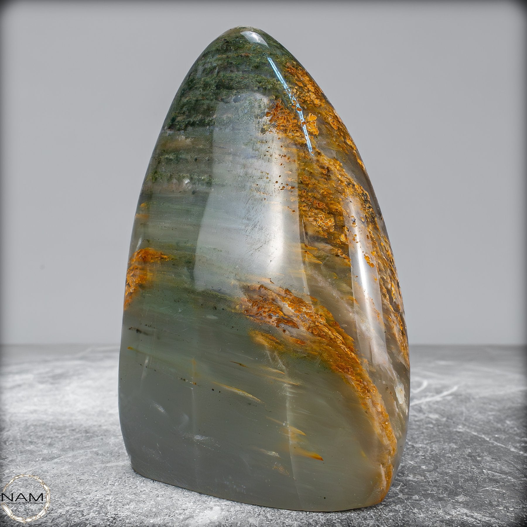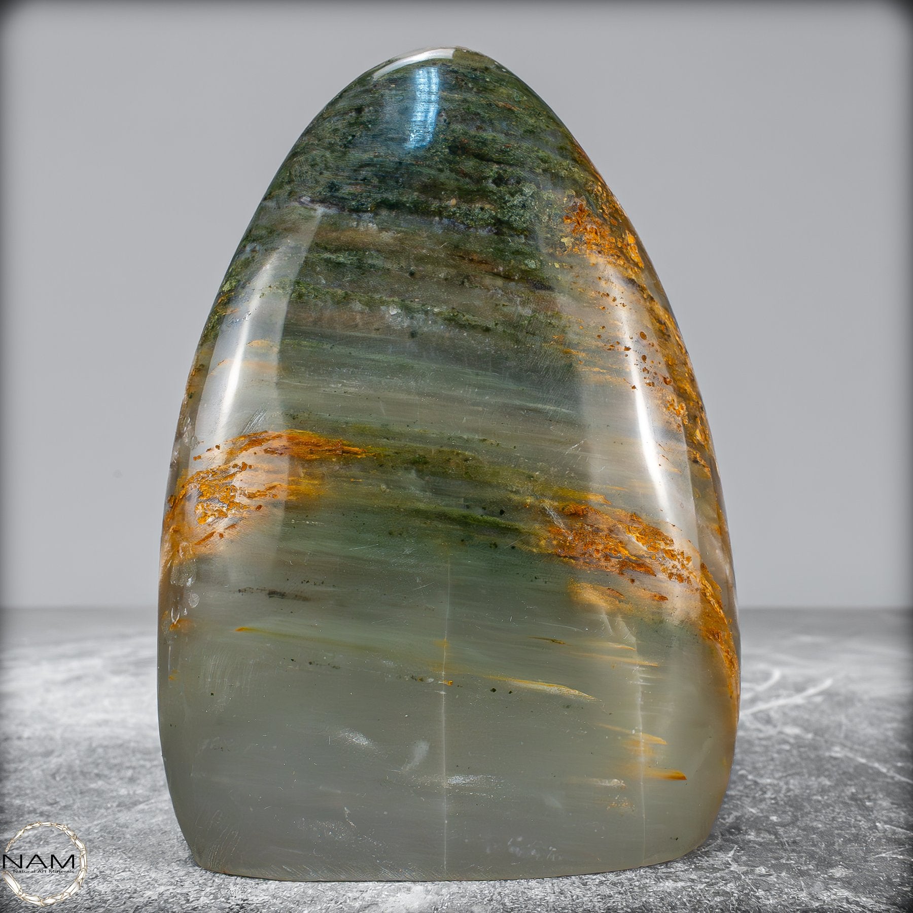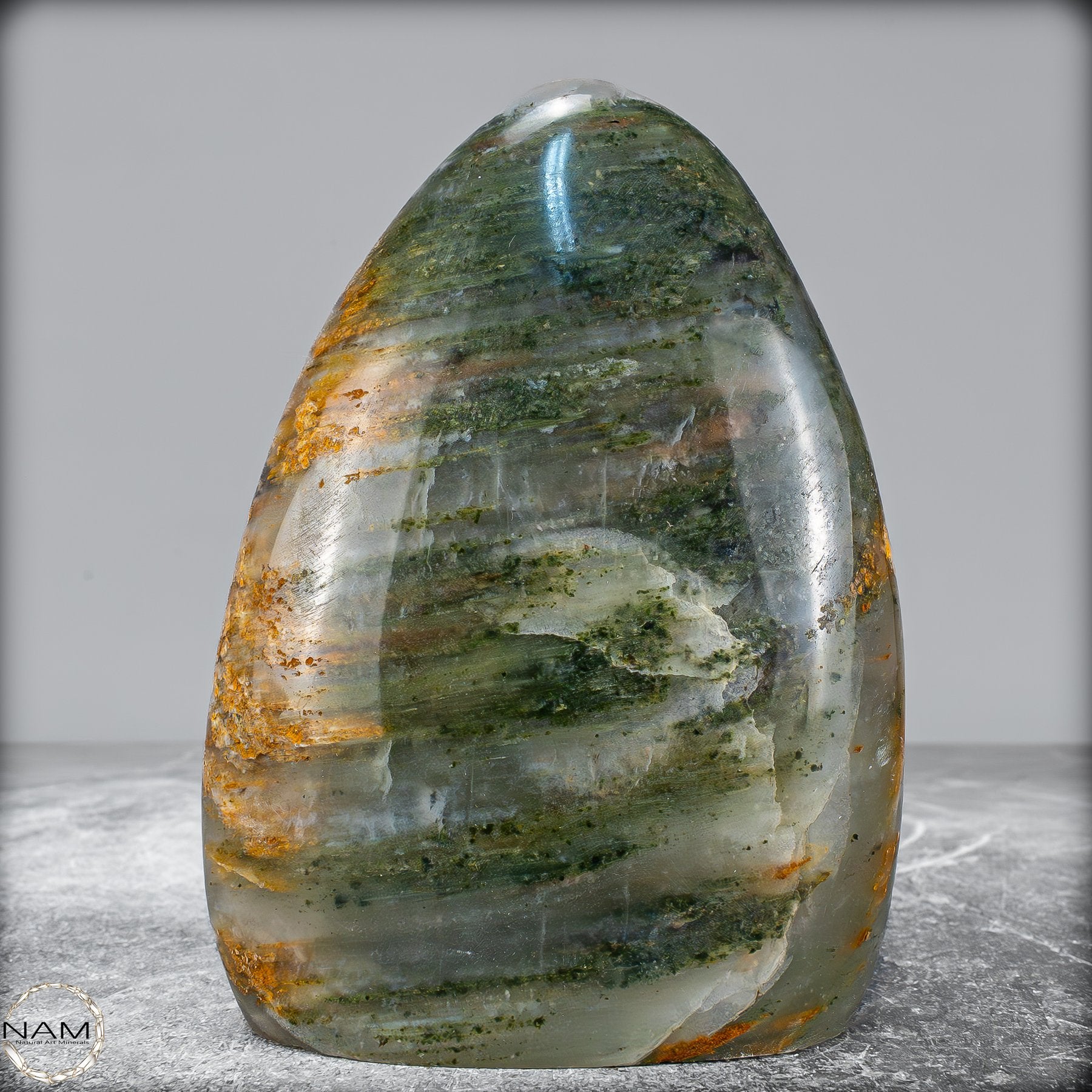 Diese elegante Freiform aus Gartenquarz besticht durch ihre faszinierende Transparenz und die natürliche Landschaft im Inneren des Steins. Der Quarz schimmert in zarten Grün- und Grautönen, durchzogen von mineralischen Einschlüssen in warmen Erdtönen, die wie moosbewachsene Felsen oder urzeitliche Gesteinsschichten wirken.