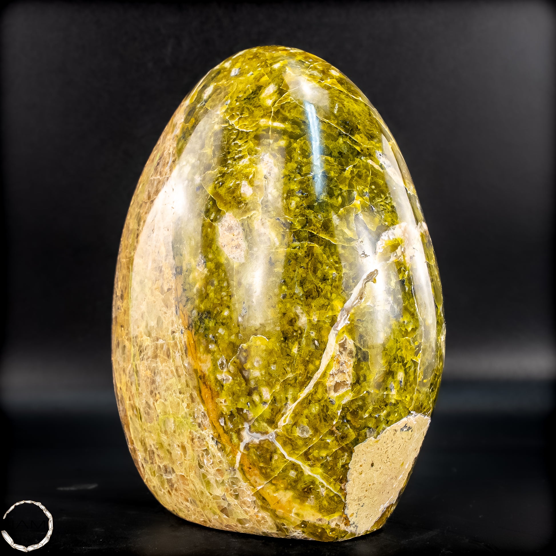 Der grüne Opal ist ein ausdrucksstarker Heil- und Schmuckstein, der mit seiner leuchtenden, lebendigen Farbvielfalt direkt an die Kraft der Natur erinnert. Die hier abgebildete, sorgfältig polierte Freiform besticht durch ein lebhaftes Spiel aus Grüntönen, Ocker, Braun und Einschlüssen aus Weiß oder Schwarz. Jede Struktur, Ader und Farbe erzählt eine eigene geologische Geschichte – eine perfekte Verbindung von Natürlichkeit und künstlerischer Form.