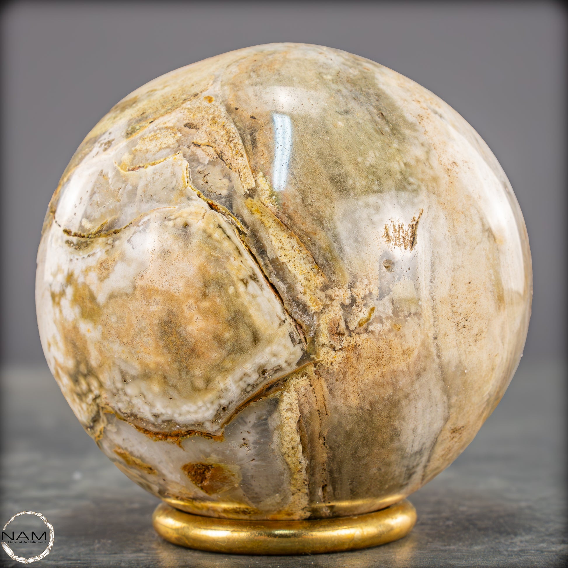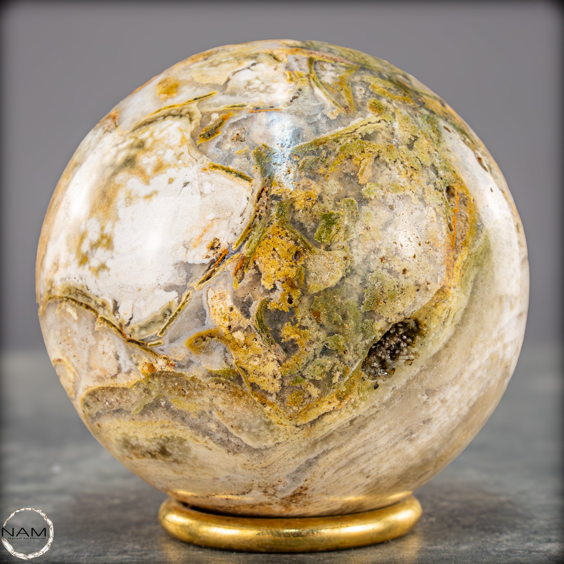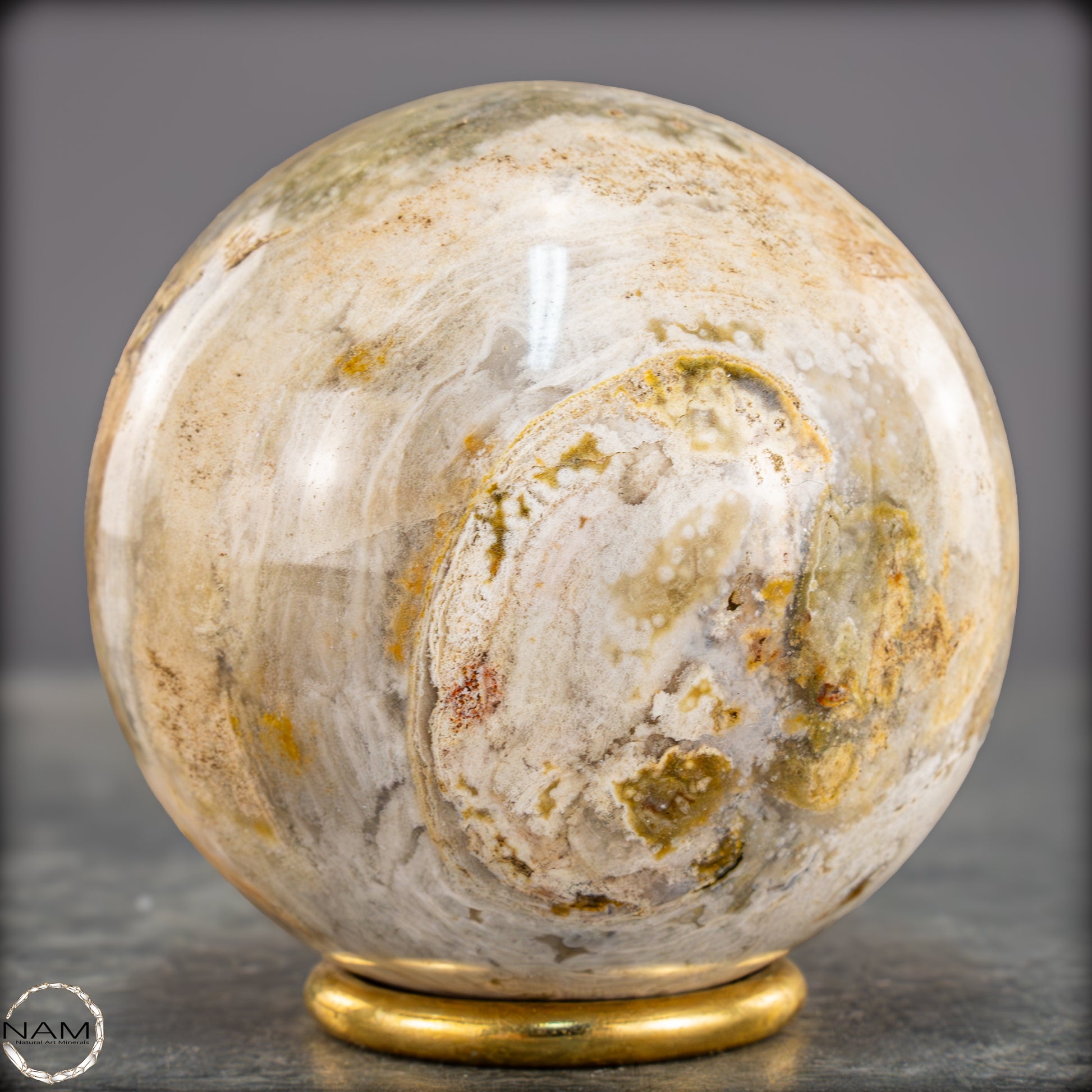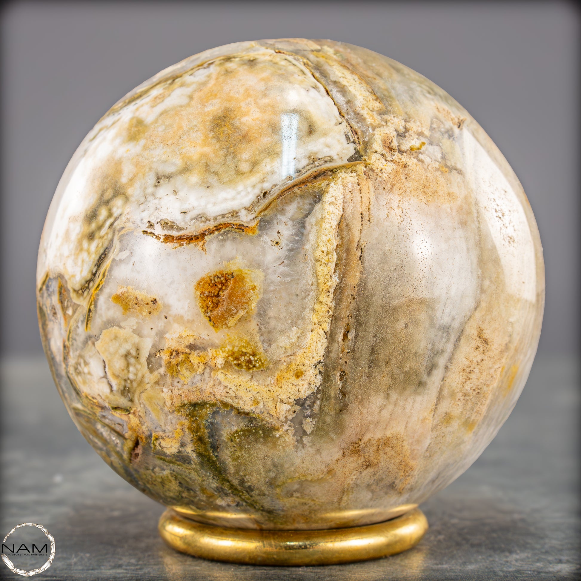 Diese ausdrucksstarke Jaspis-Achat-Kugel vereint erdige Farbtöne und organische Strukturen zu einem harmonischen Gesamtbild. Zarte Schichten in Creme, Ocker, Olivgrün und hellem Grau fließen ineinander und erinnern an eine Landschaftsaufnahme in Steinform.