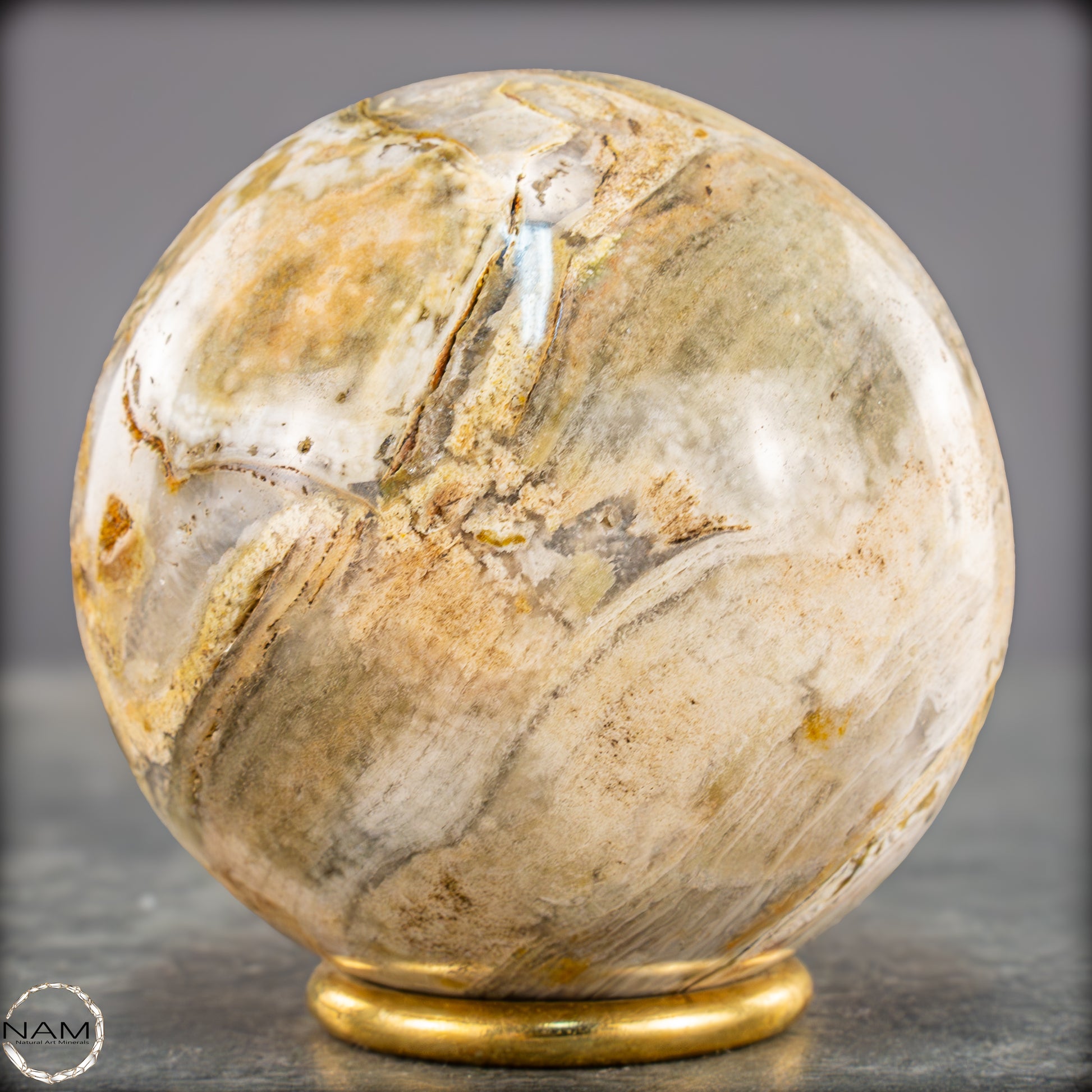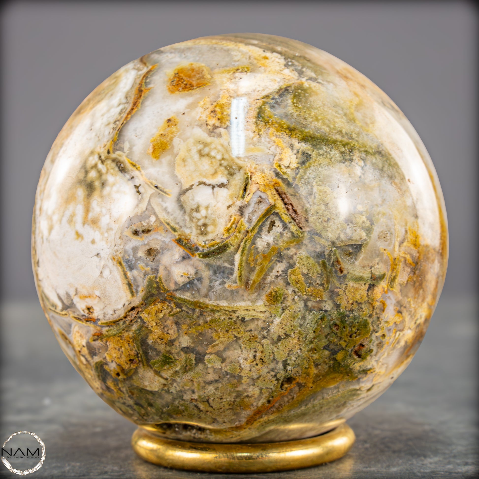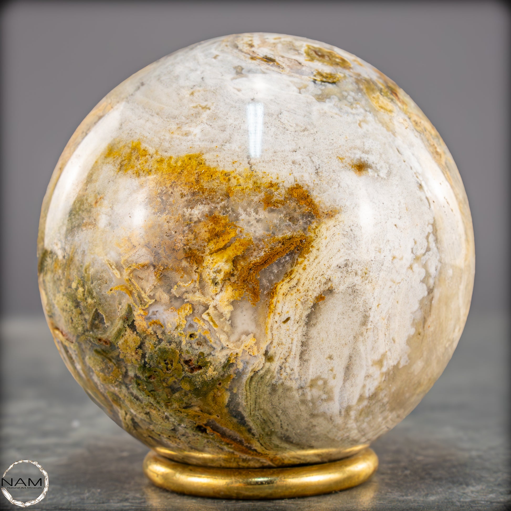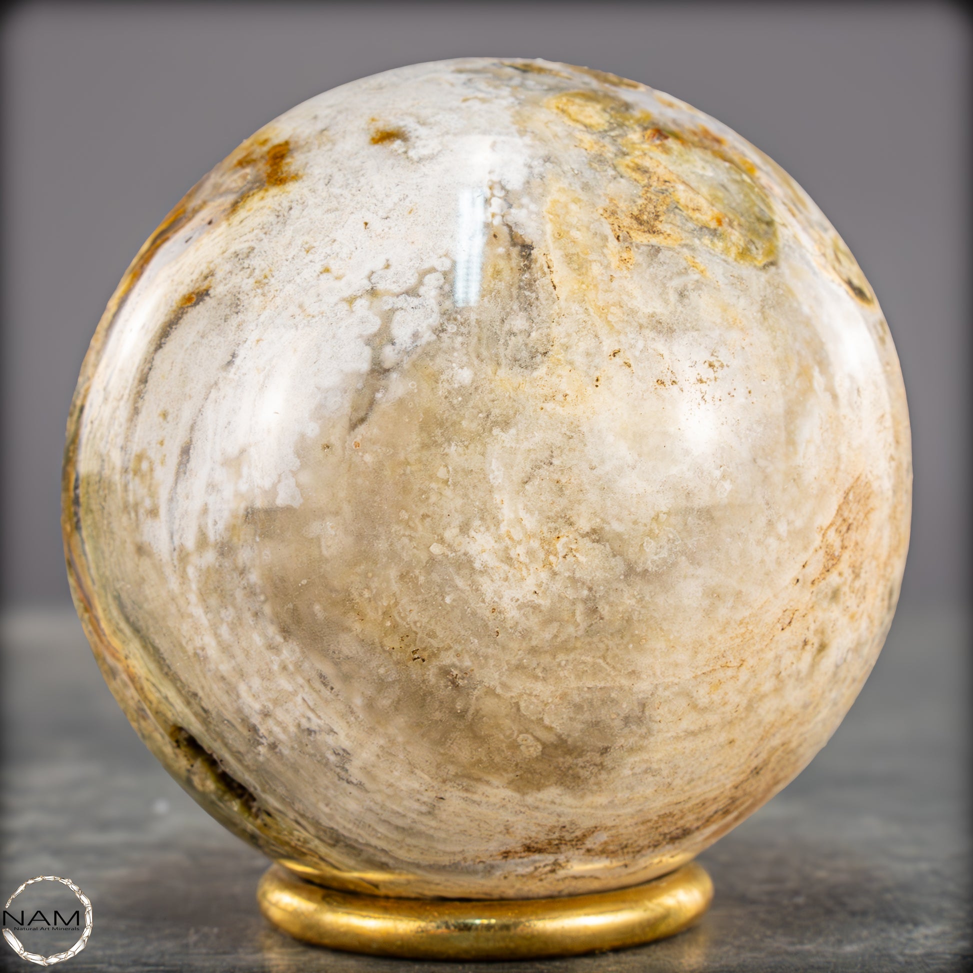 Diese ausdrucksstarke Jaspis-Achat-Kugel vereint erdige Farbtöne und organische Strukturen zu einem harmonischen Gesamtbild. Zarte Schichten in Creme, Ocker, Olivgrün und hellem Grau fließen ineinander und erinnern an eine Landschaftsaufnahme in Steinform.