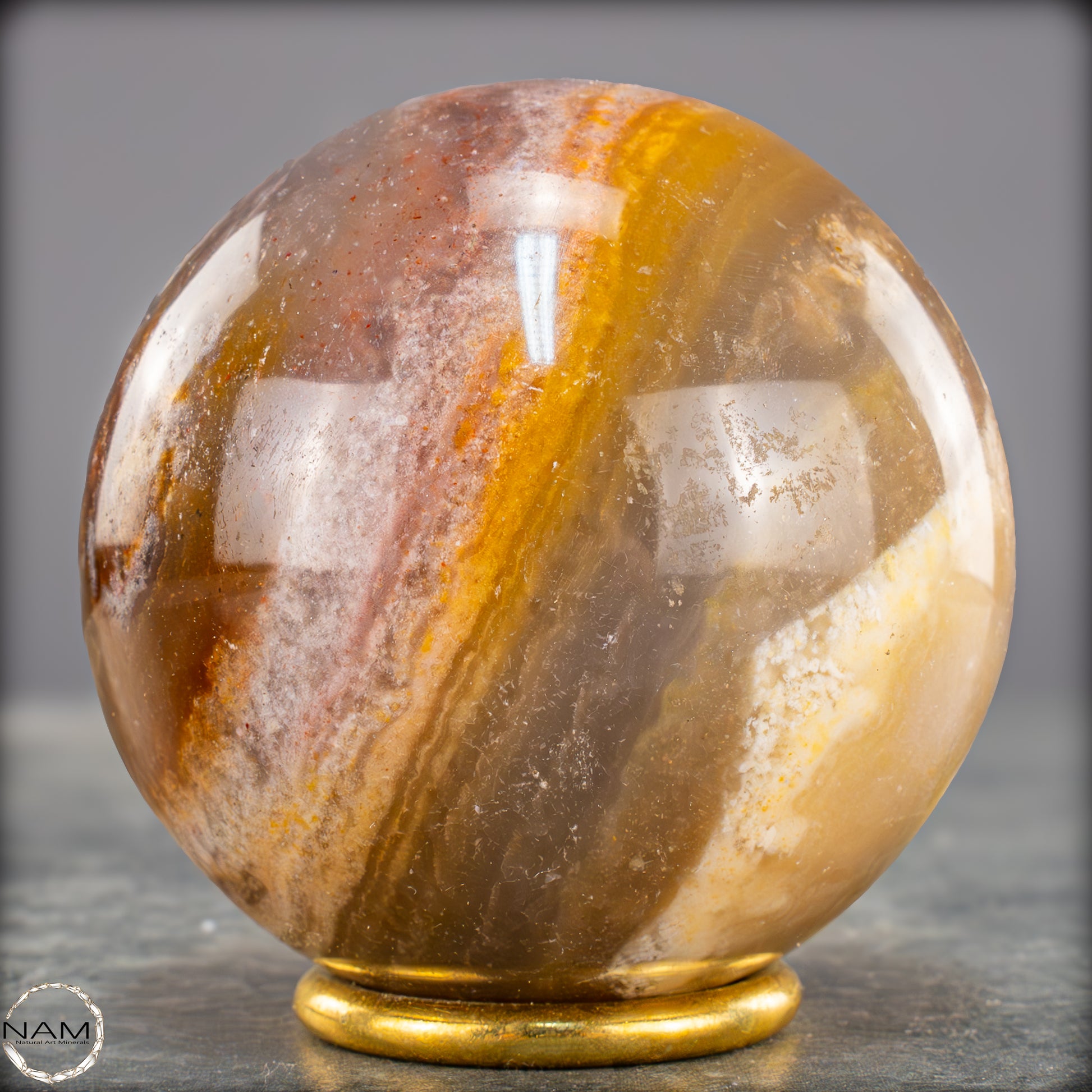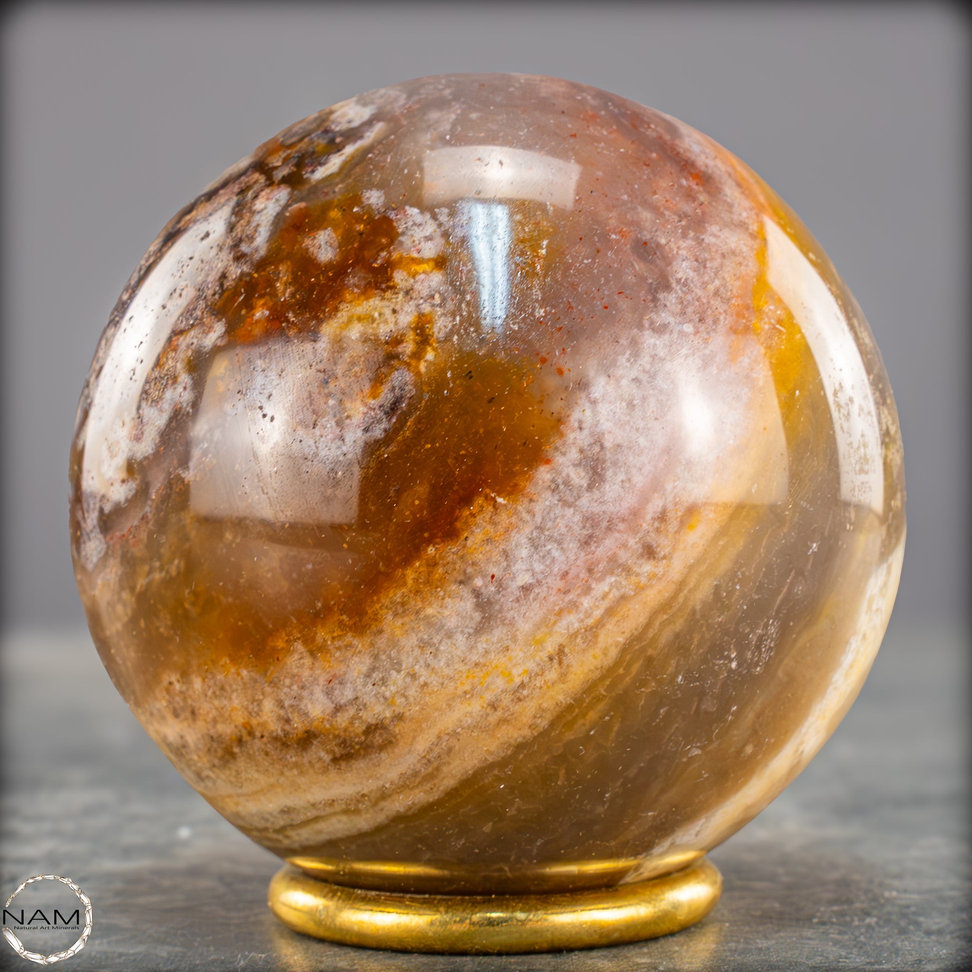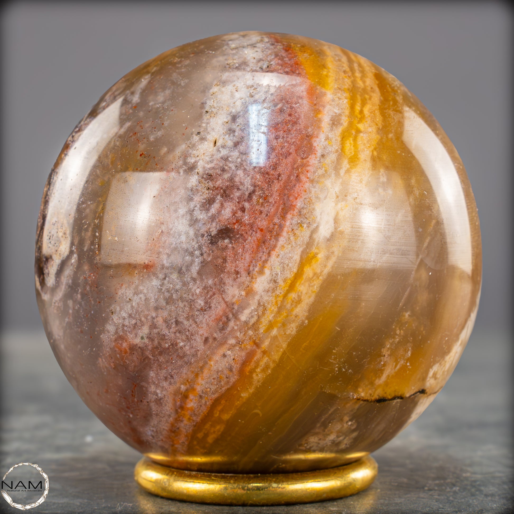 Diese Kugel aus Jasper-Achat besticht durch ihre harmonische Kombination aus warmen Erdtönen und feinen, durchscheinenden Strukturen. Goldgelbe, rötliche und cremefarbene Bänder verlaufen sanft ineinander und erzeugen eine natürliche Tiefe, die an versteinertes Landschaftsbild erinnert.