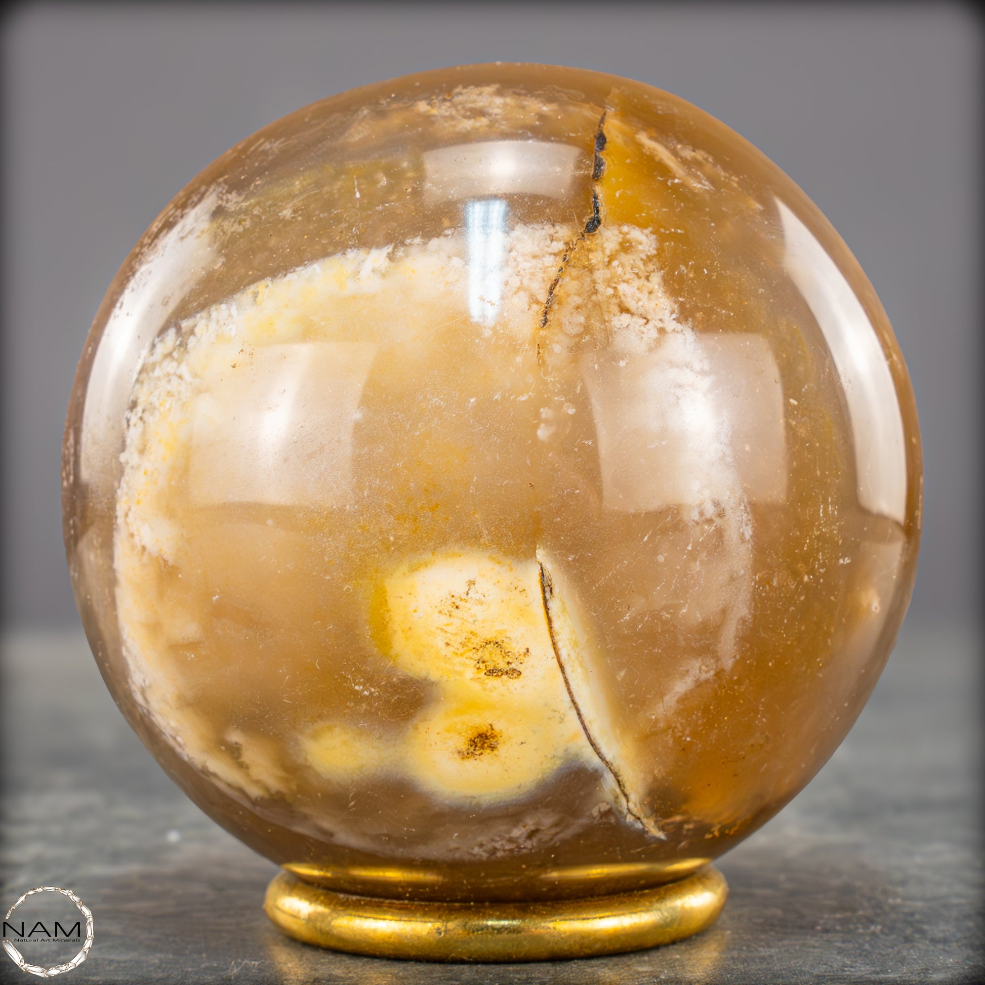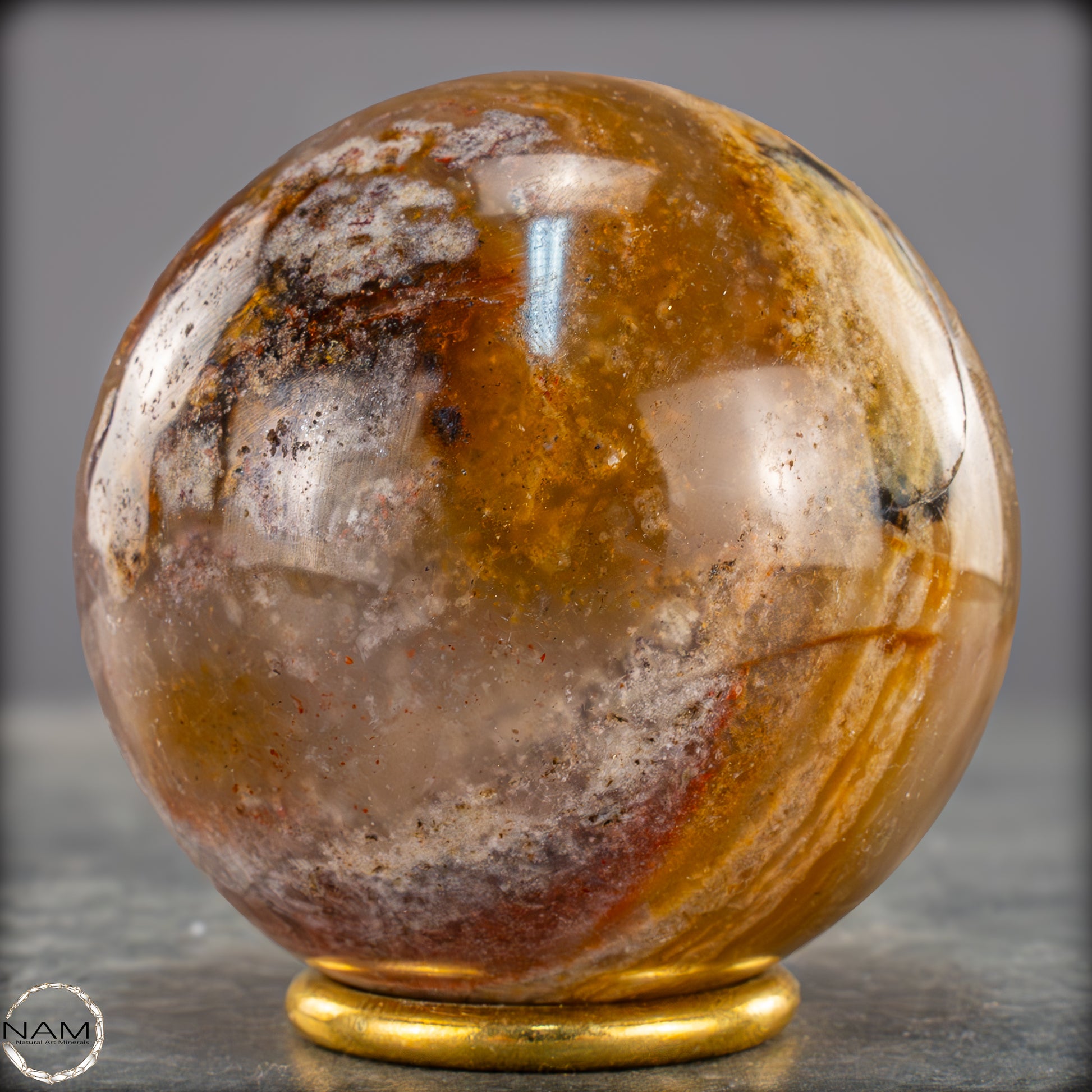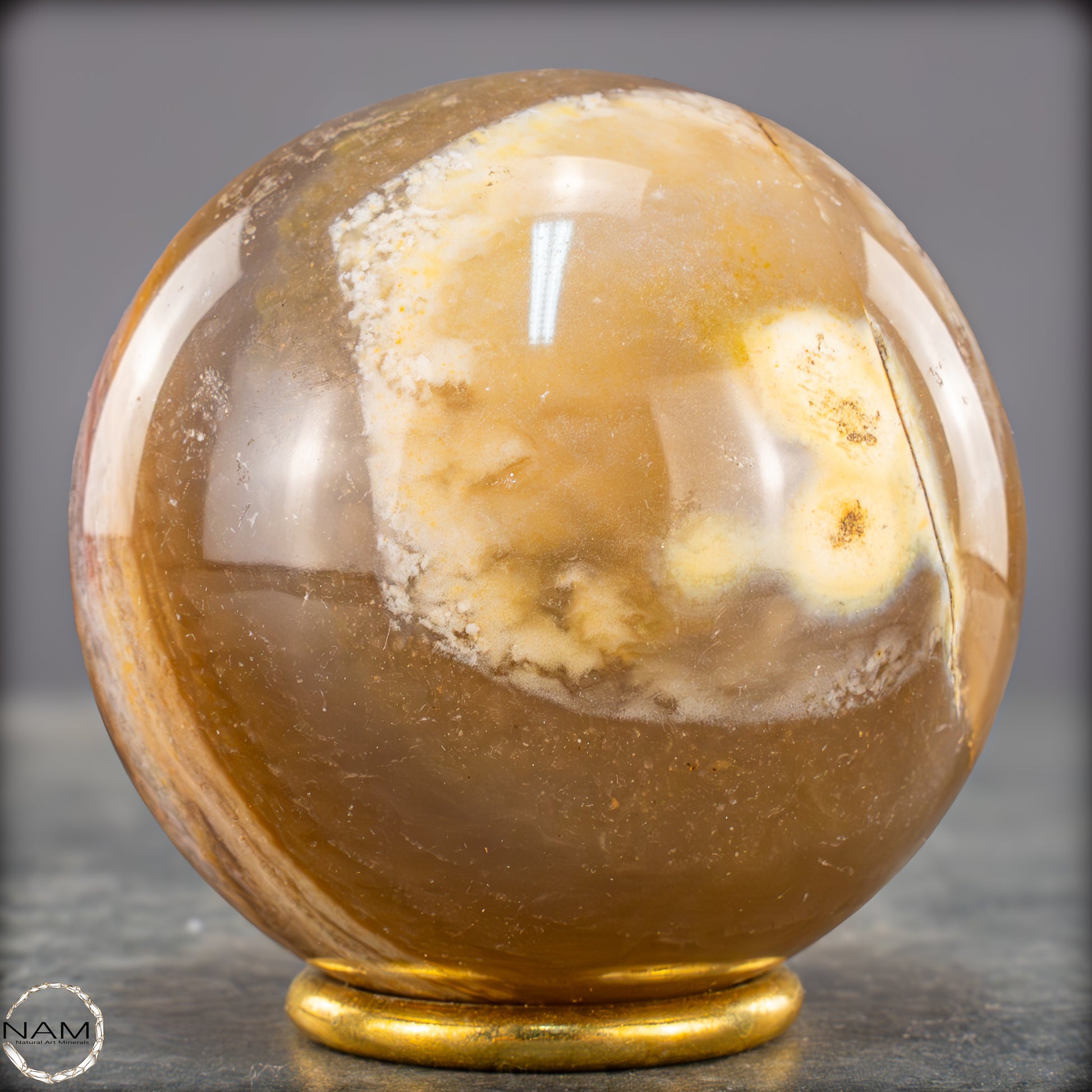 Diese Kugel aus Jasper-Achat besticht durch ihre harmonische Kombination aus warmen Erdtönen und feinen, durchscheinenden Strukturen. Goldgelbe, rötliche und cremefarbene Bänder verlaufen sanft ineinander und erzeugen eine natürliche Tiefe, die an versteinertes Landschaftsbild erinnert.