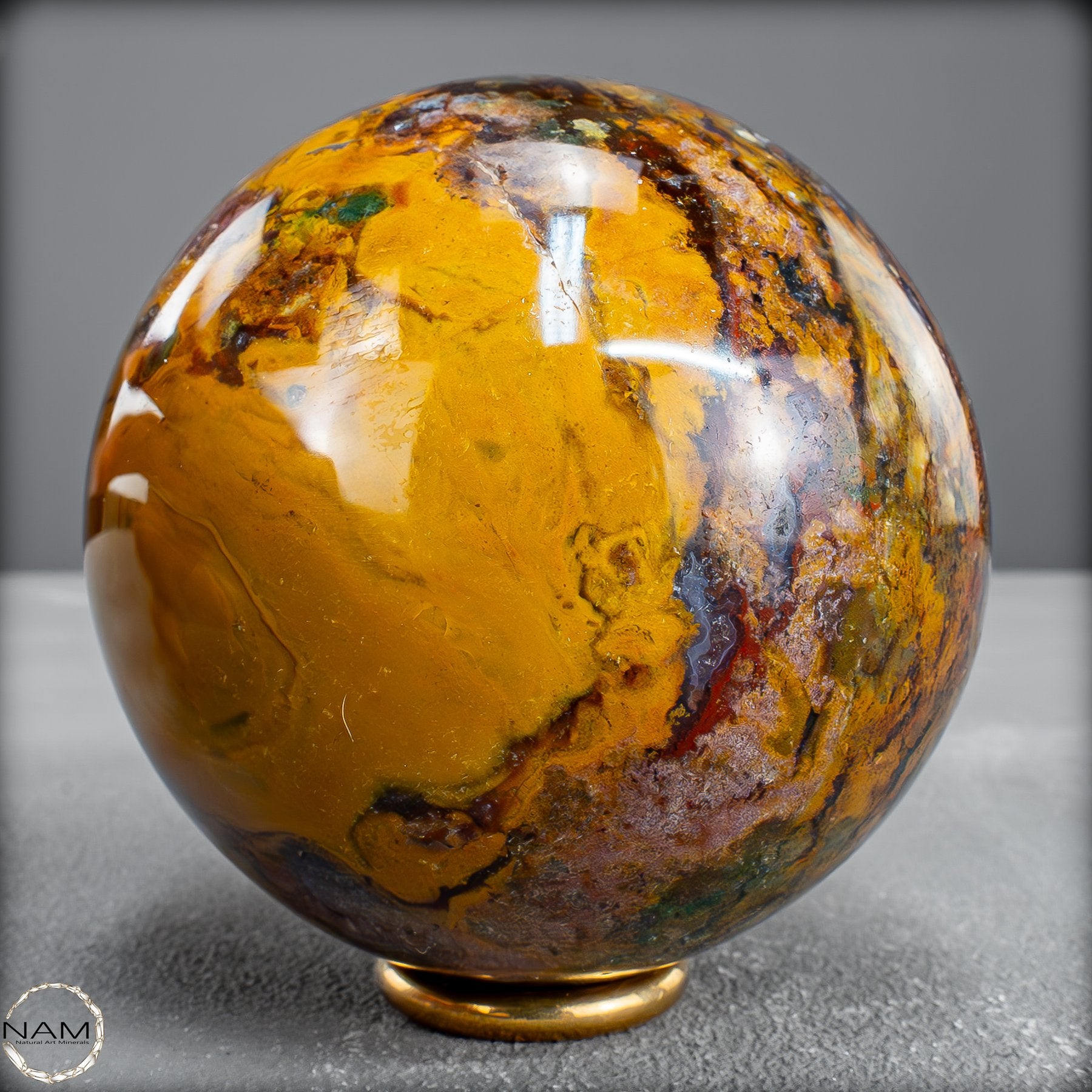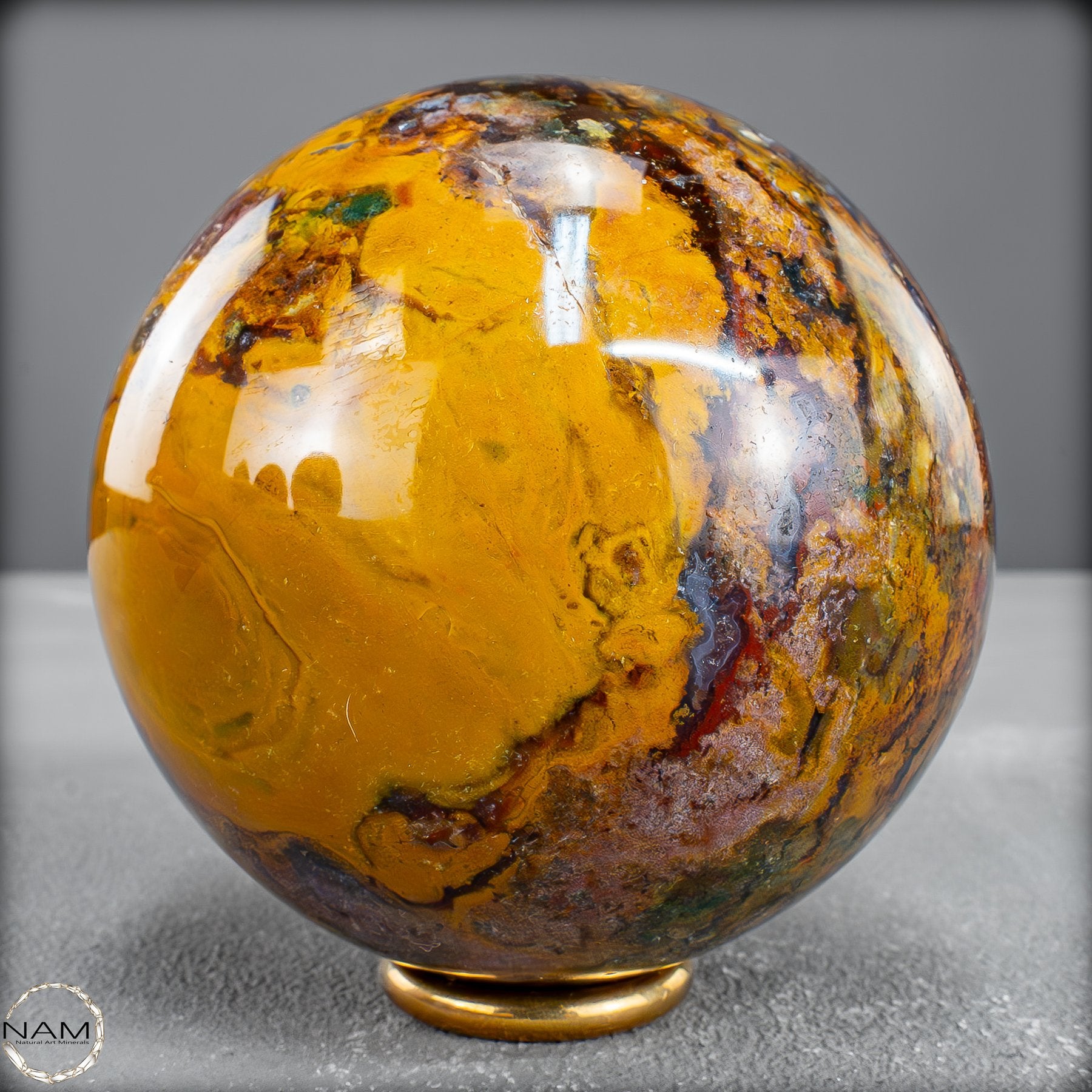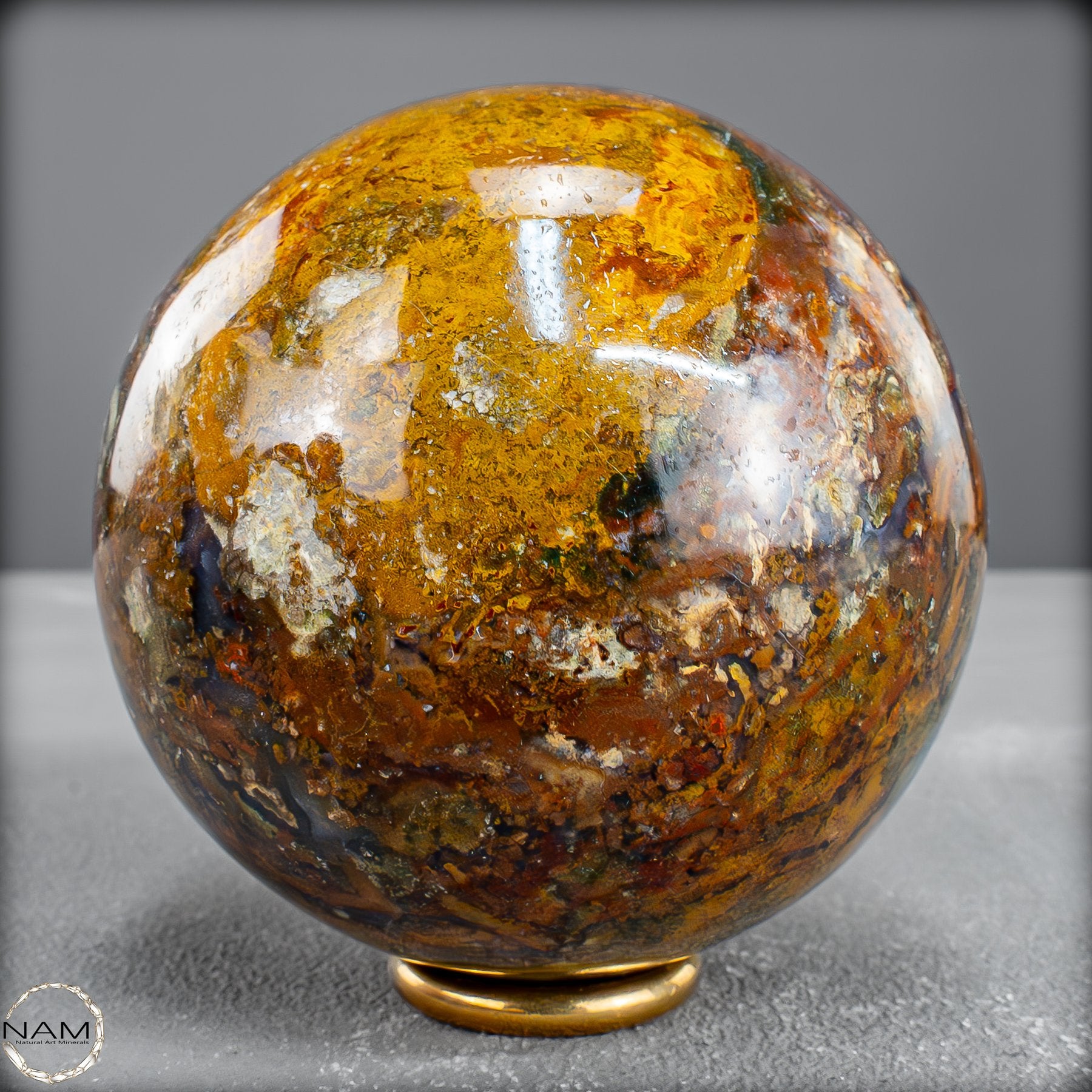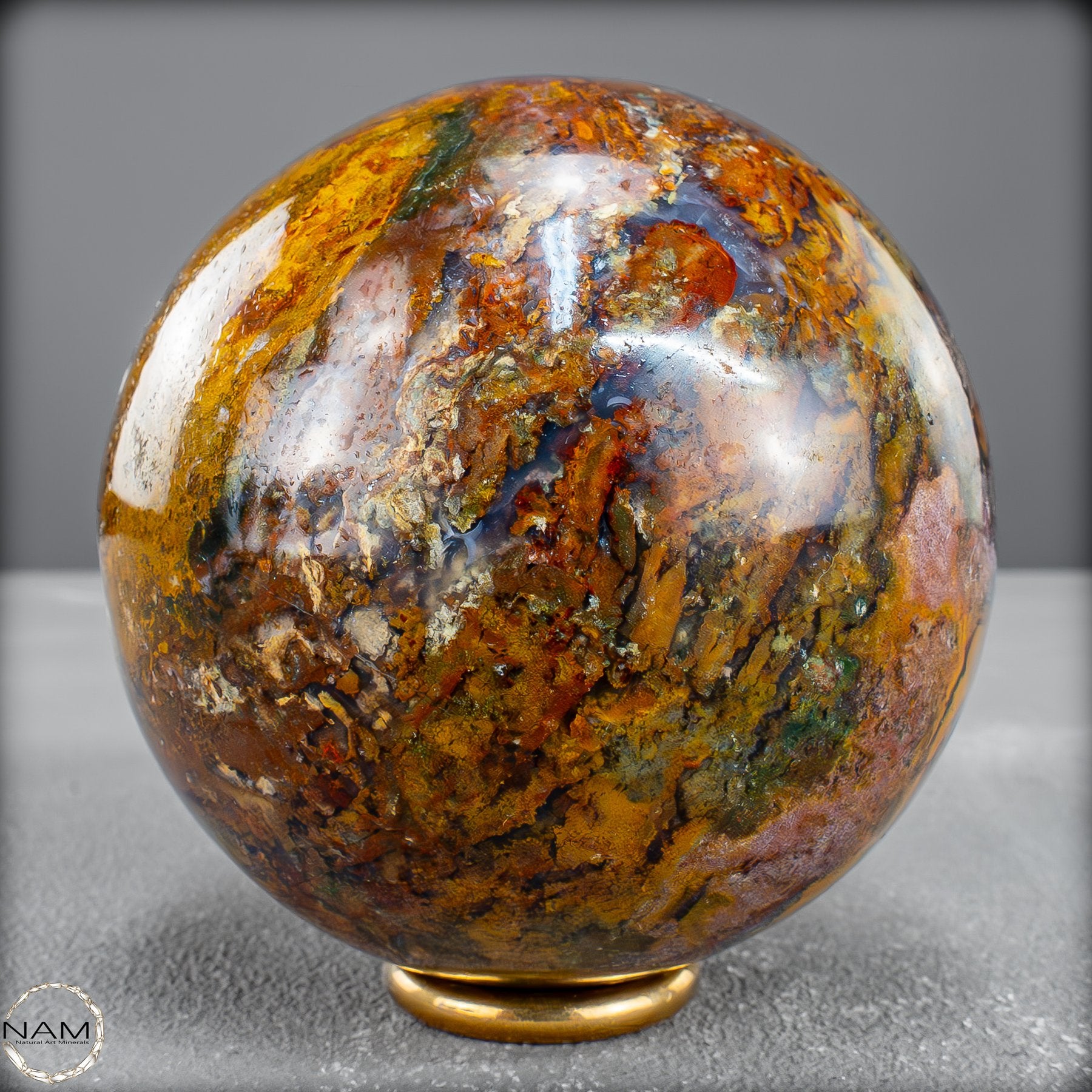 Diese prachtvolle Jaspis-Achat Kugel vereint in sich die Urkraft der Erde und die Eleganz der Natur in vollendeter Harmonie. Ihre Oberfläche offenbart ein spektakuläres Farbspiel aus warmem Goldgelb, erdigem Rot, sattem Braun und tiefem Schwarz – durchzogen von faszinierenden Strukturen, die wie kleine Landschaften oder Flussläufe erscheinen. Jede Nuance erzählt ihre eigene Geschichte und macht diese Kugel zu einem unvergleichlichen Unikat.