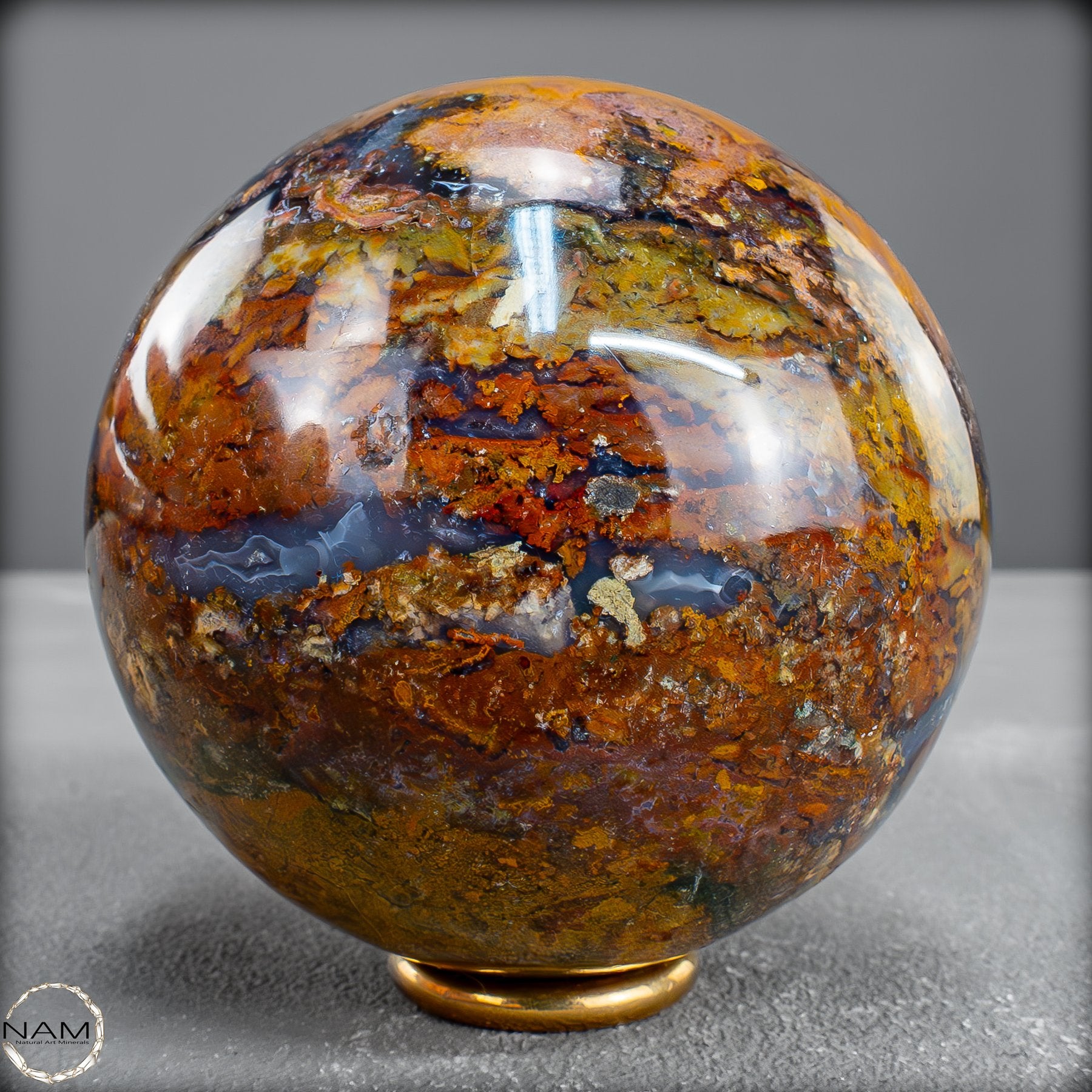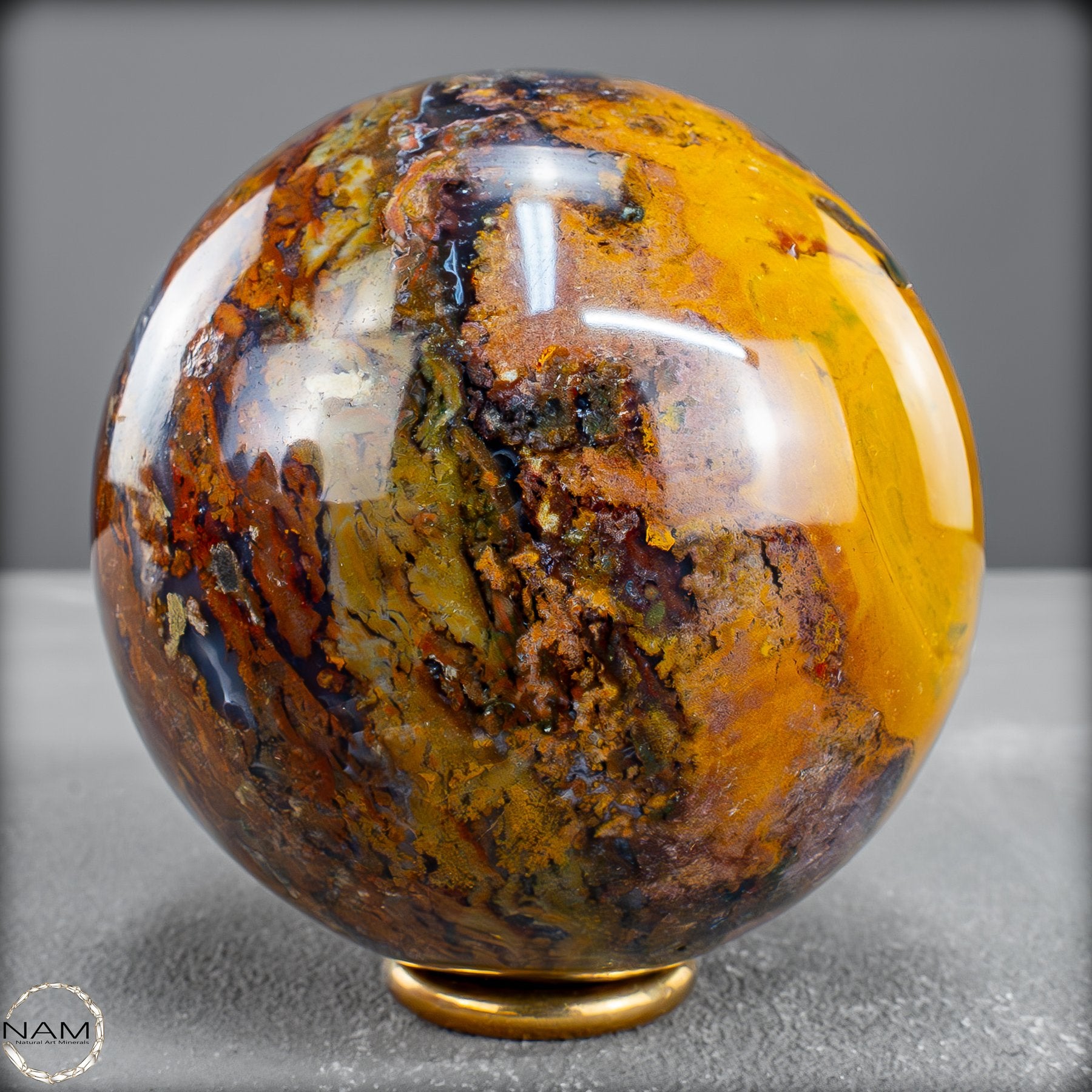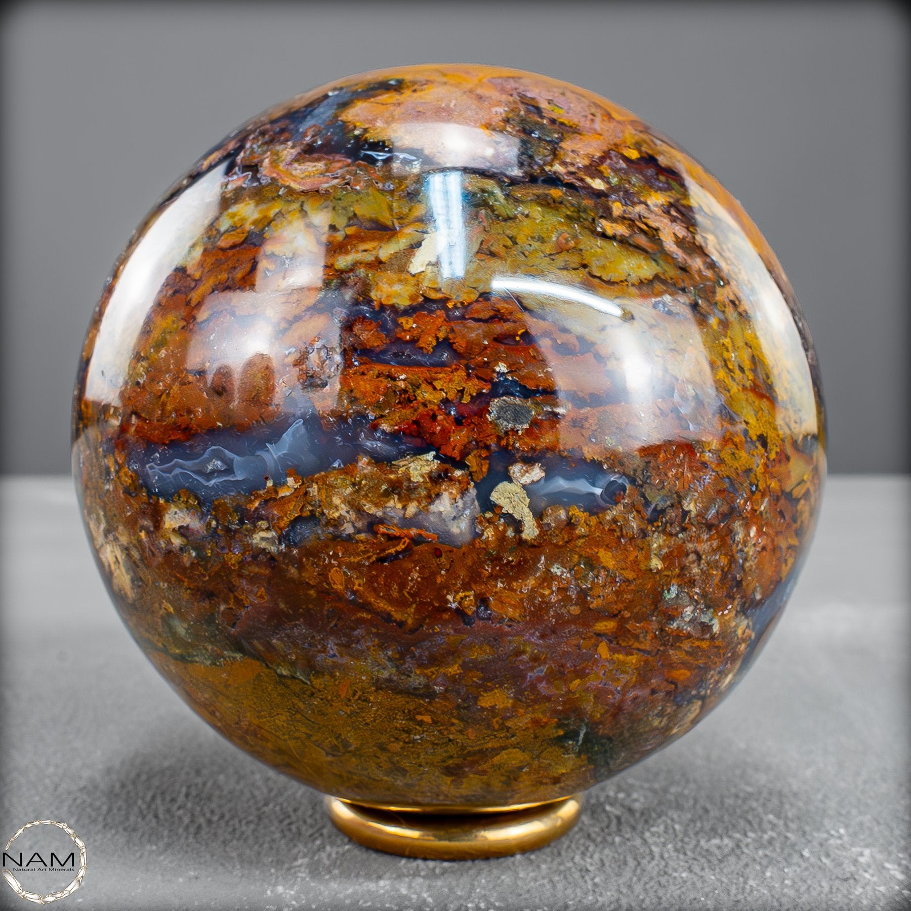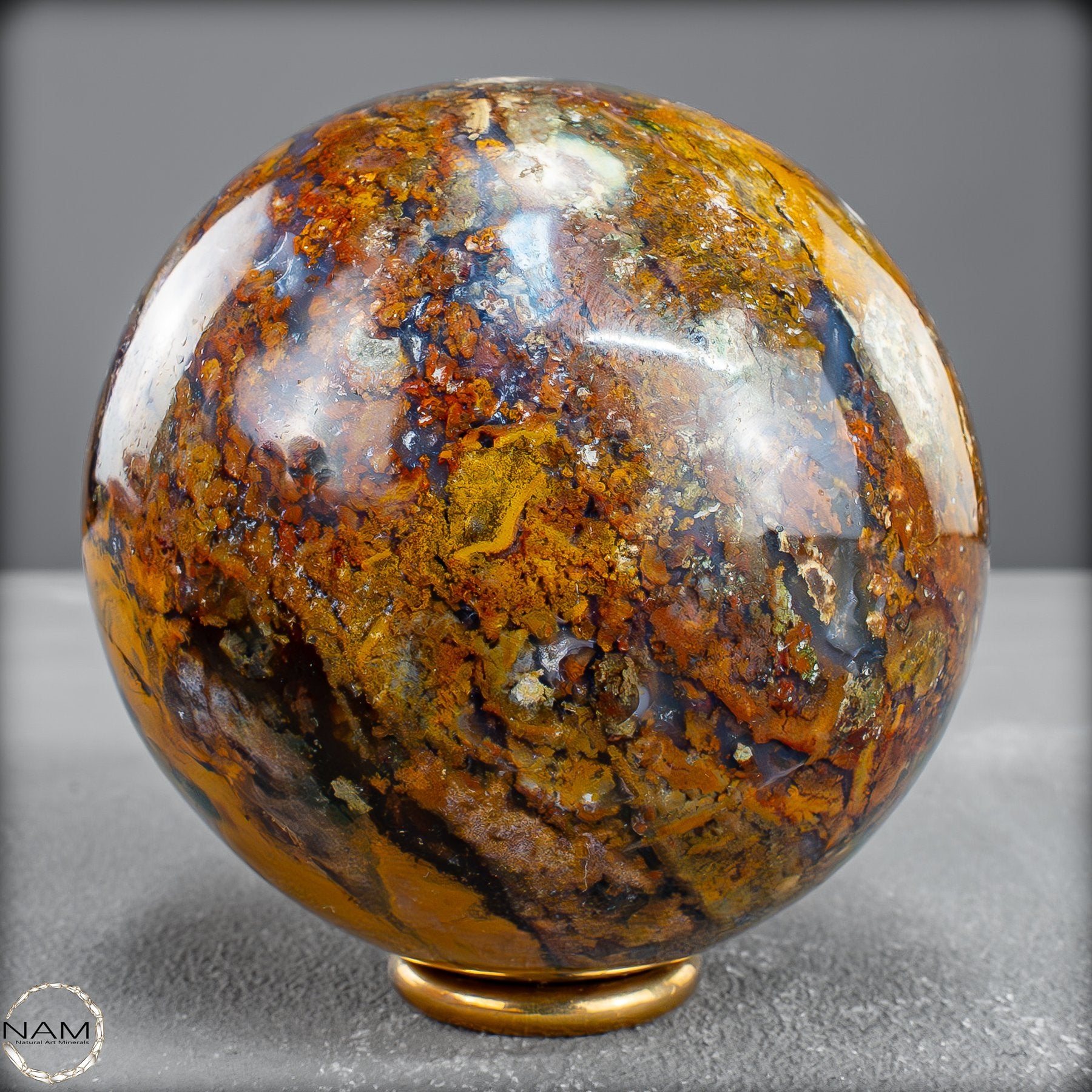 Diese prachtvolle Jaspis-Achat Kugel vereint in sich die Urkraft der Erde und die Eleganz der Natur in vollendeter Harmonie. Ihre Oberfläche offenbart ein spektakuläres Farbspiel aus warmem Goldgelb, erdigem Rot, sattem Braun und tiefem Schwarz – durchzogen von faszinierenden Strukturen, die wie kleine Landschaften oder Flussläufe erscheinen. Jede Nuance erzählt ihre eigene Geschichte und macht diese Kugel zu einem unvergleichlichen Unikat.