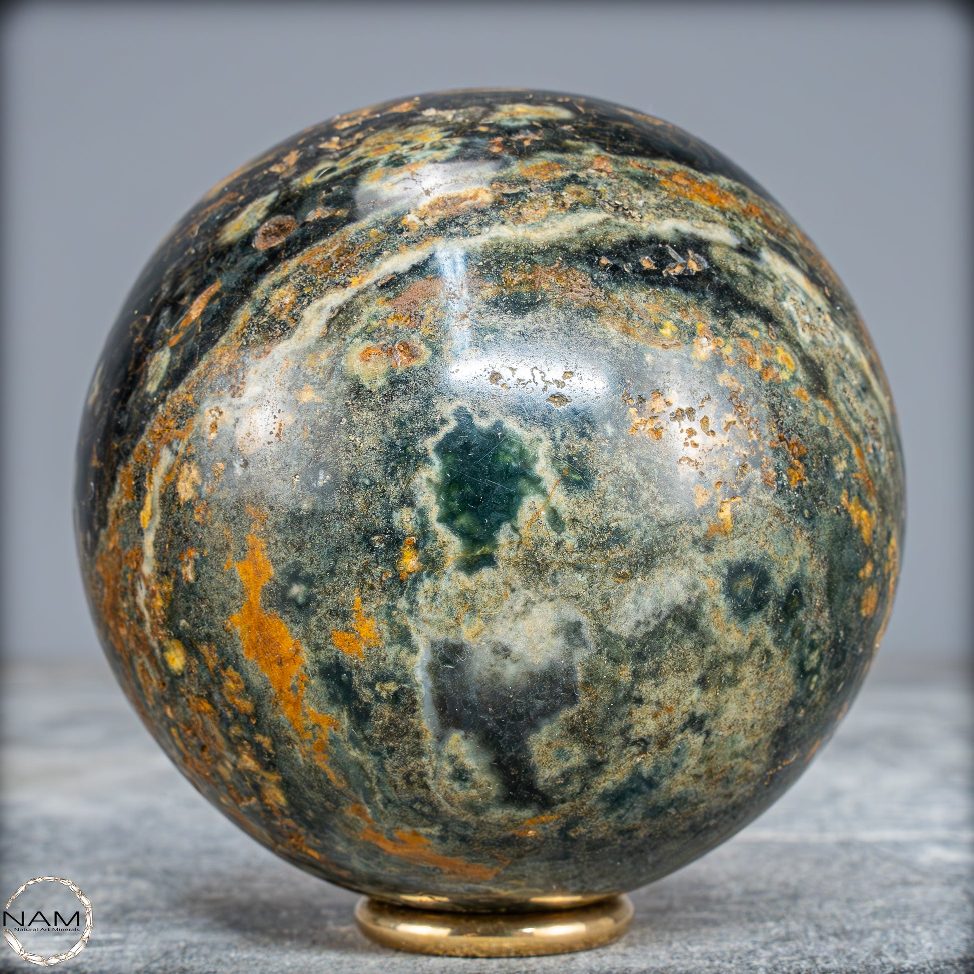 Diese ausdrucksstarke Jaspis-Achat-Kugel vereint die erdige Kraft des Jaspis mit der feinen Strukturvielfalt des Achats in einer faszinierenden Komposition. Dunkle, fast moosartige Grün- und Schwarznuancen verlaufen in lebendig wirbelnden Mustern über die Oberfläche und werden von rostroten, ockerfarbenen und cremeweißen Einschlüssen durchzogen. Feine Aderungen, punktuelle Kristallzonen und natürliche Vertiefungen verleihen dem Stein Tiefe und Charakter.