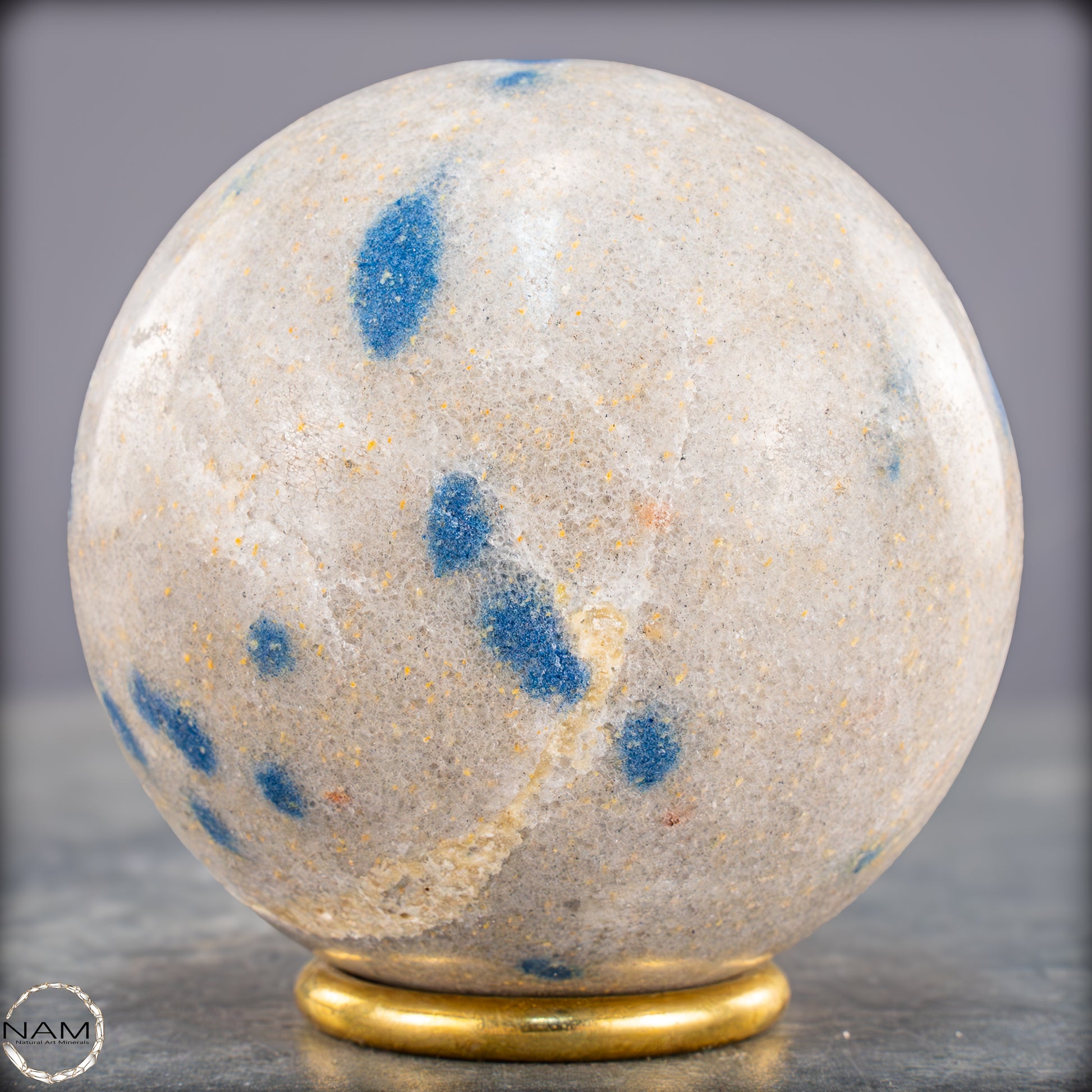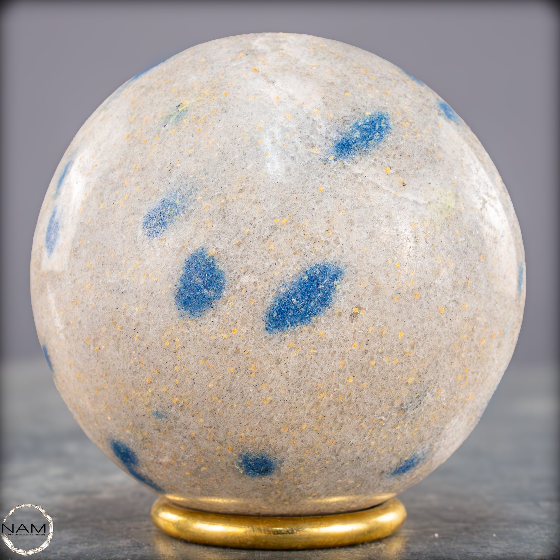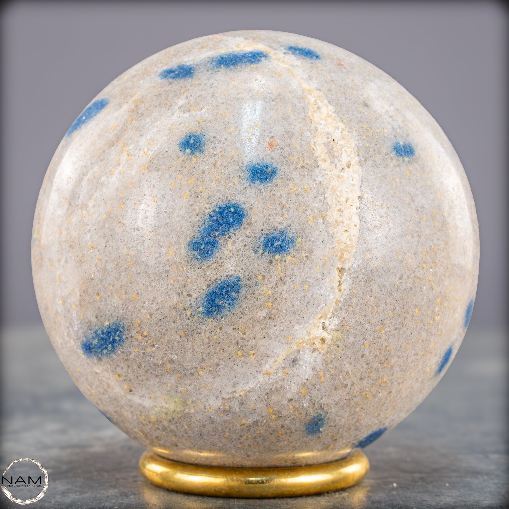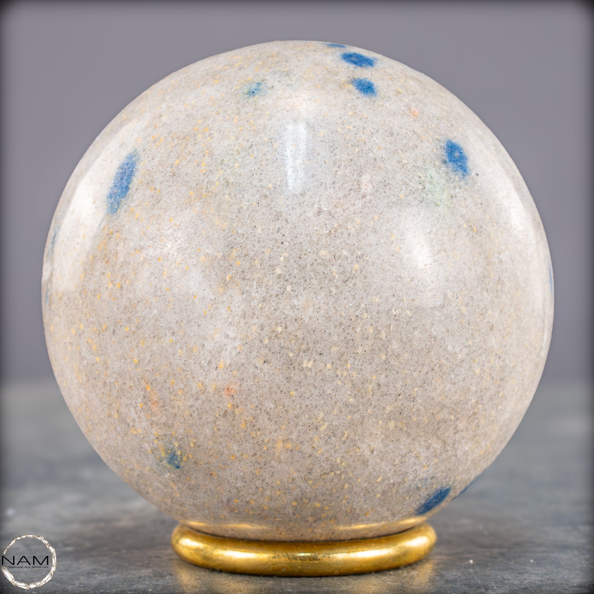 Diese eindrucksvolle K2-Kugel ist ein außergewöhnliches und seltenes Schmuckstück der Natur. Sie besticht durch ihre markanten blauen Flecken auf einem hellgrauen Granithintergrund, die dieses Mineral besonders einzigartig machen. K2, auch bekannt als „Azurit in Granit“, stammt aus der Region des zweithöchsten Berges der Welt, dem K2 im Karakorum-Gebirge, und gehört zu den seltensten Edelsteinen.