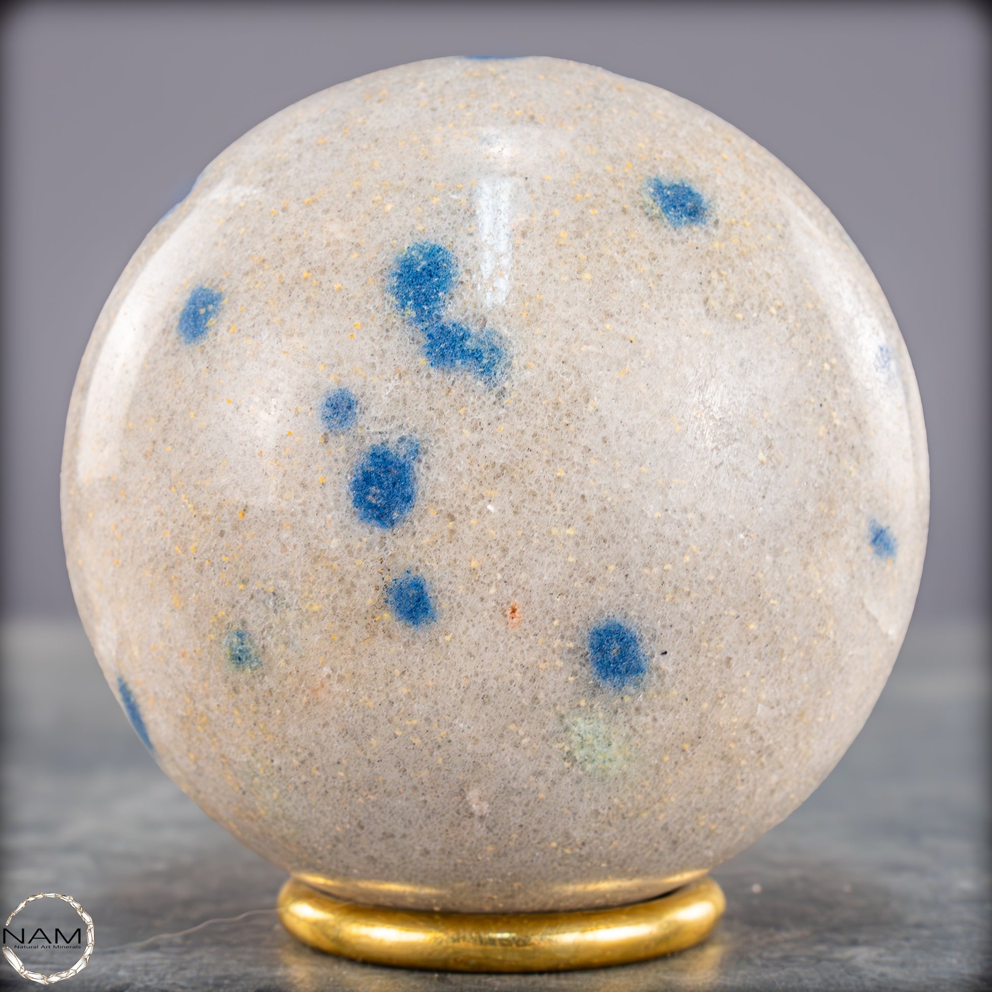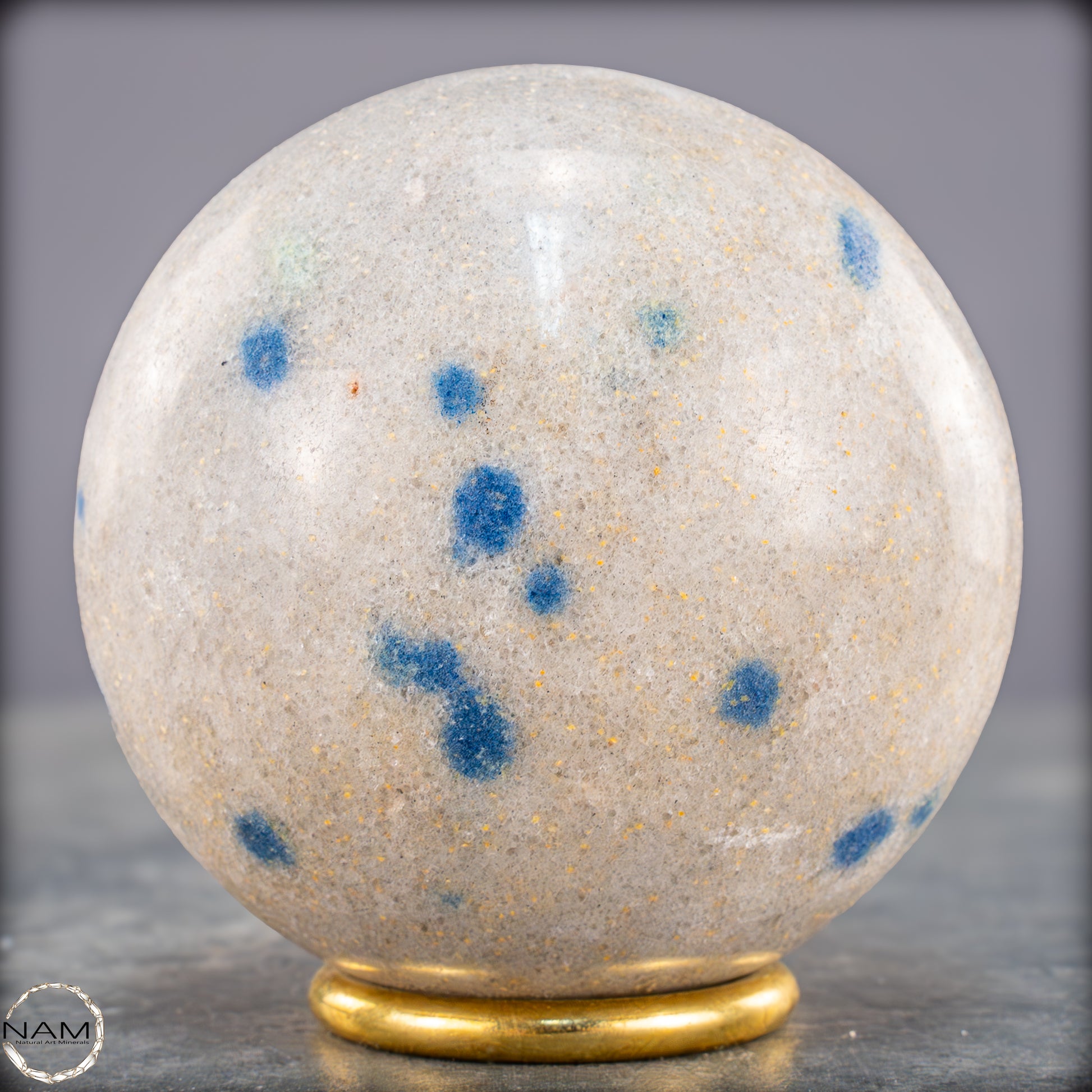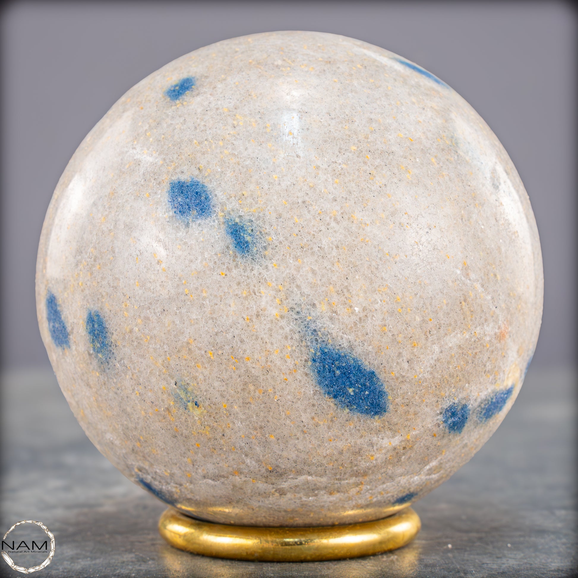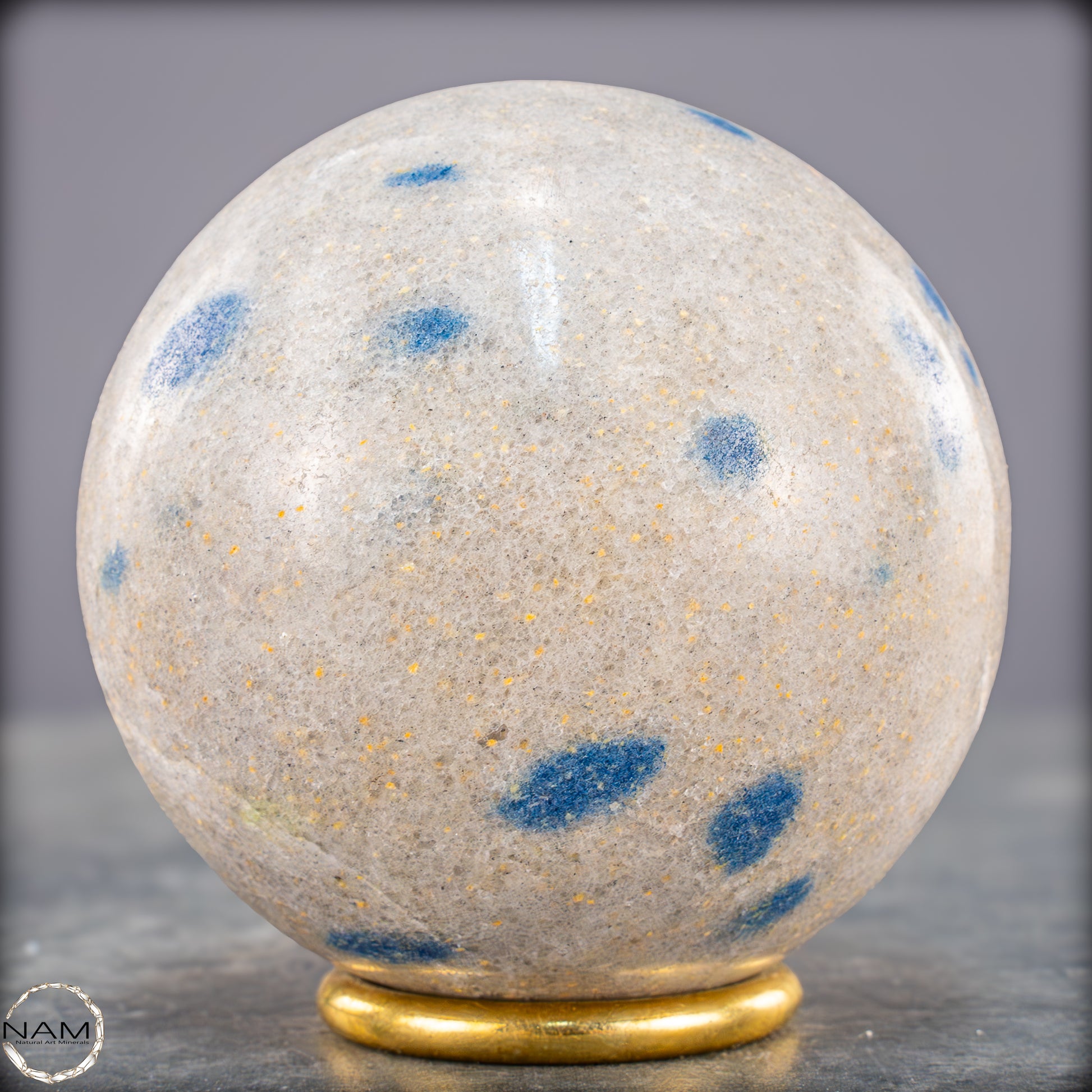 Diese eindrucksvolle K2-Kugel ist ein außergewöhnliches und seltenes Schmuckstück der Natur. Sie besticht durch ihre markanten blauen Flecken auf einem hellgrauen Granithintergrund, die dieses Mineral besonders einzigartig machen. K2, auch bekannt als „Azurit in Granit“, stammt aus der Region des zweithöchsten Berges der Welt, dem K2 im Karakorum-Gebirge, und gehört zu den seltensten Edelsteinen.