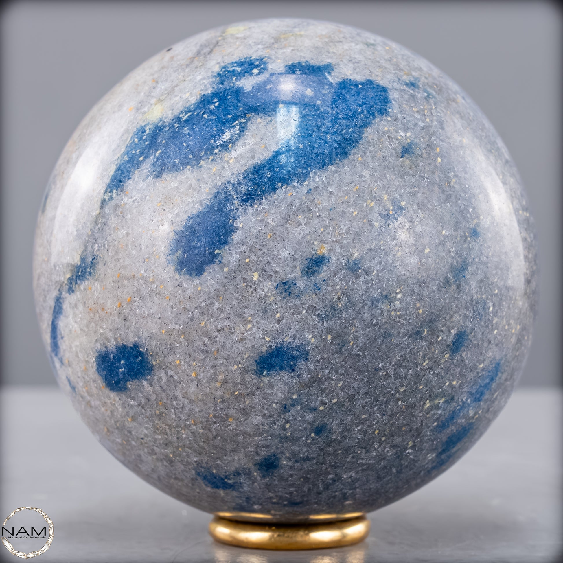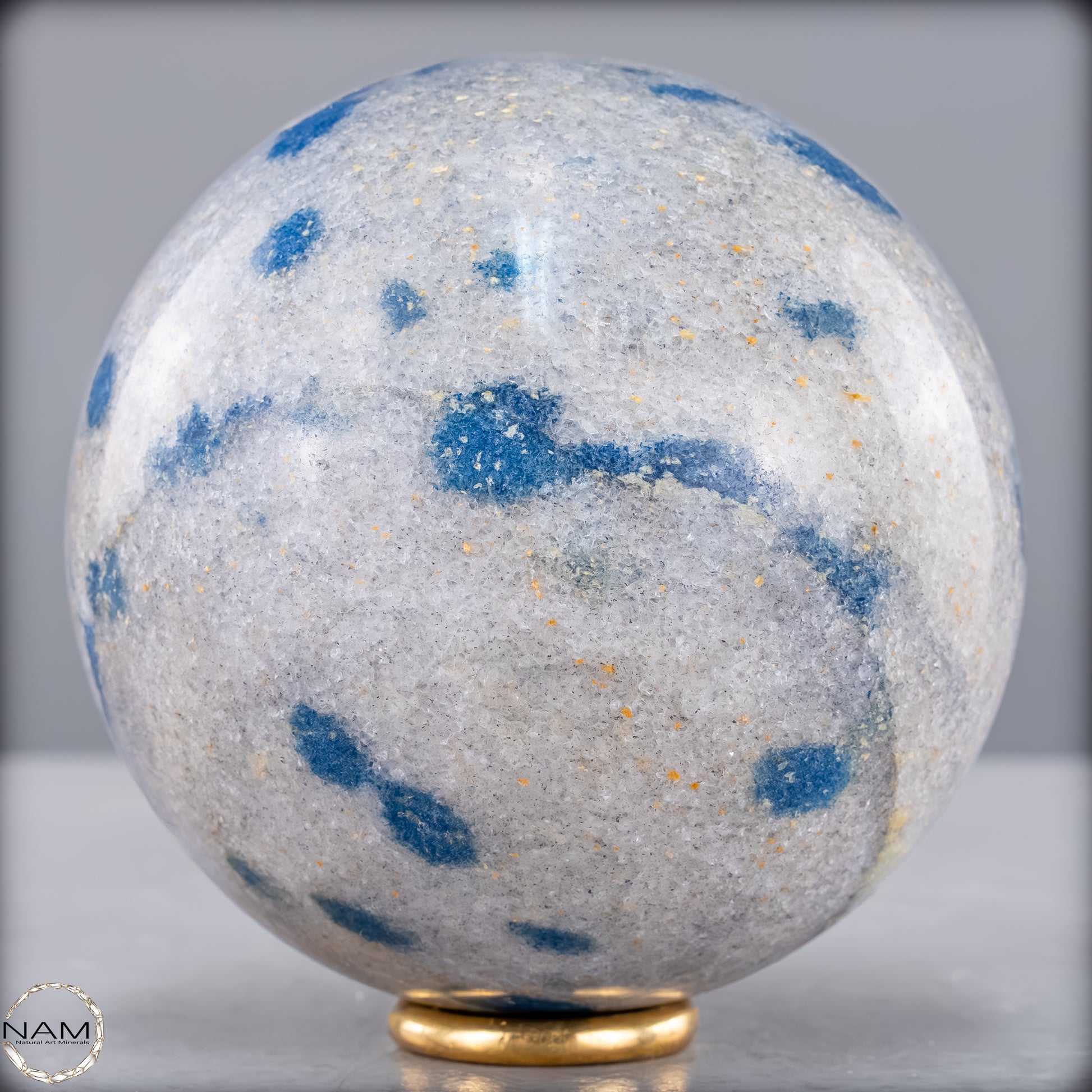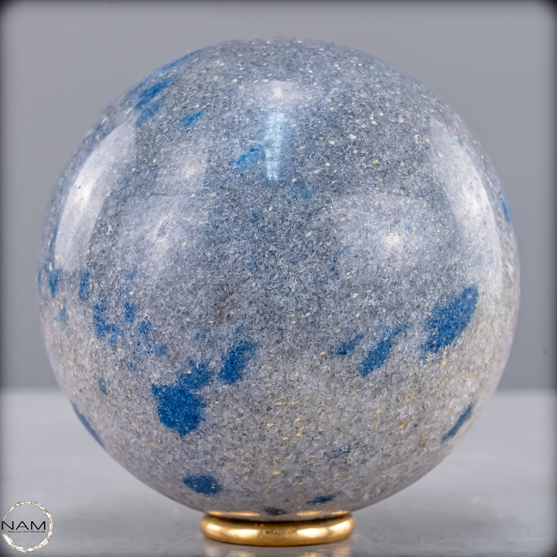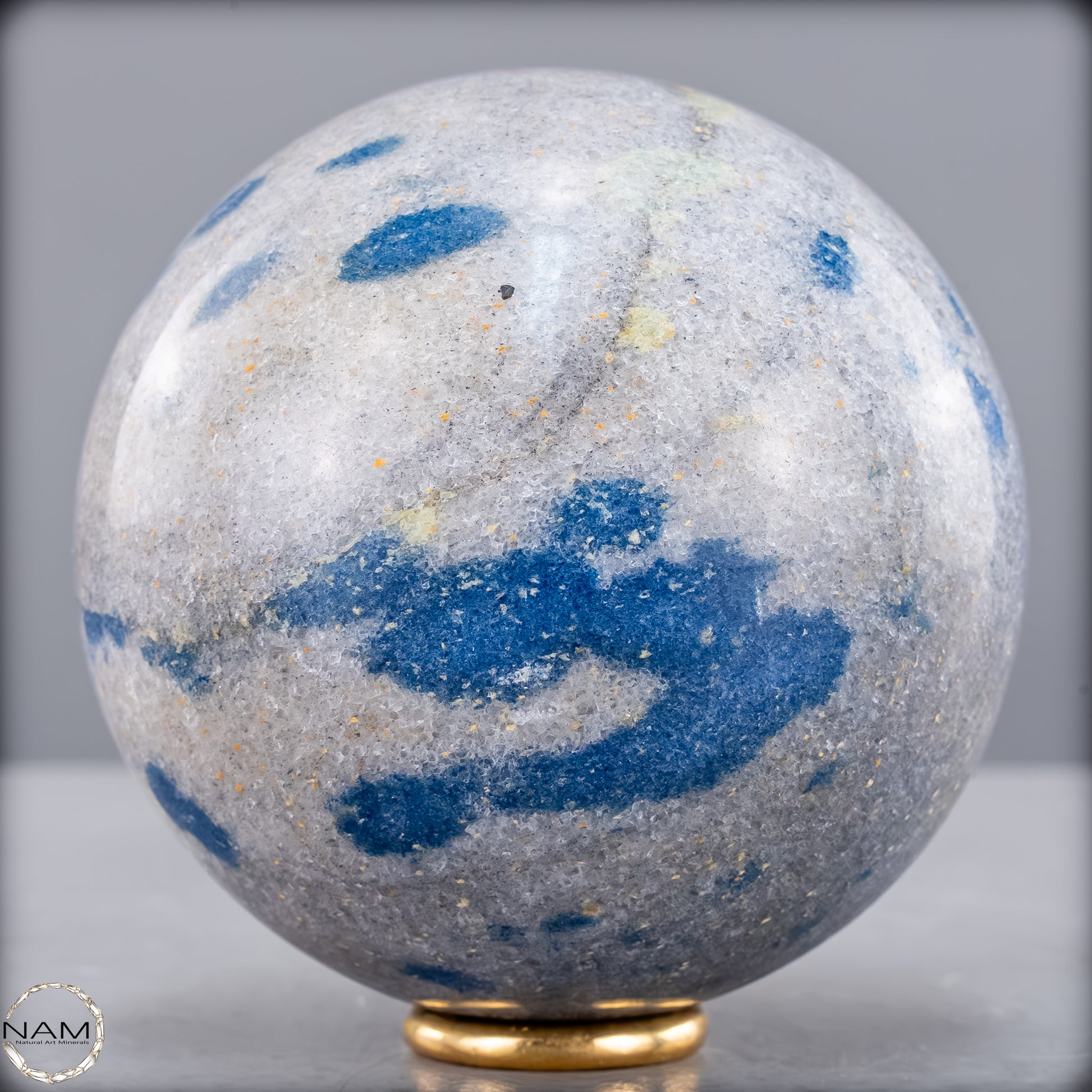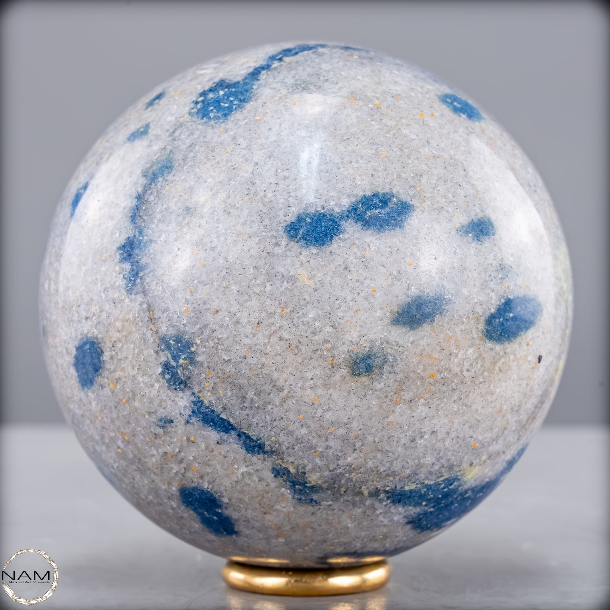 Diese eindrucksvolle K2-Kugel ist ein außergewöhnliches und seltenes Schmuckstück der Natur. Sie besticht durch ihre markanten blauen Flecken auf einem hellgrauen Granithintergrund, die dieses Mineral besonders einzigartig machen. K2, auch bekannt als „Azurit in Granit“, stammt aus der Region des zweithöchsten Berges der Welt, dem K2 im Karakorum-Gebirge, und gehört zu den seltensten Edelsteinen.