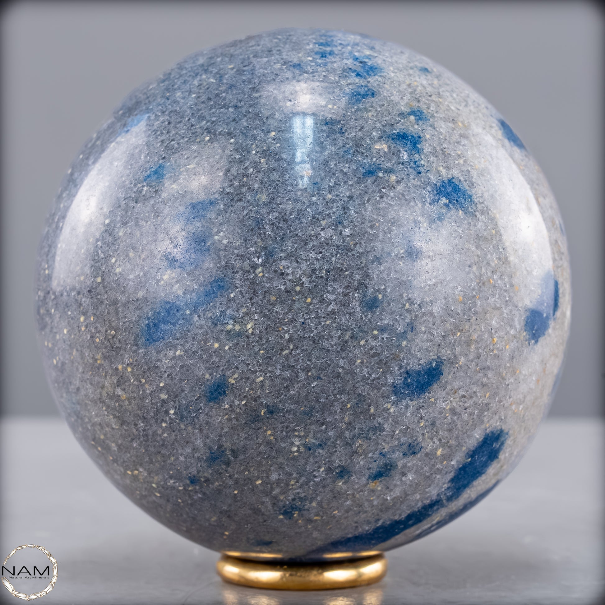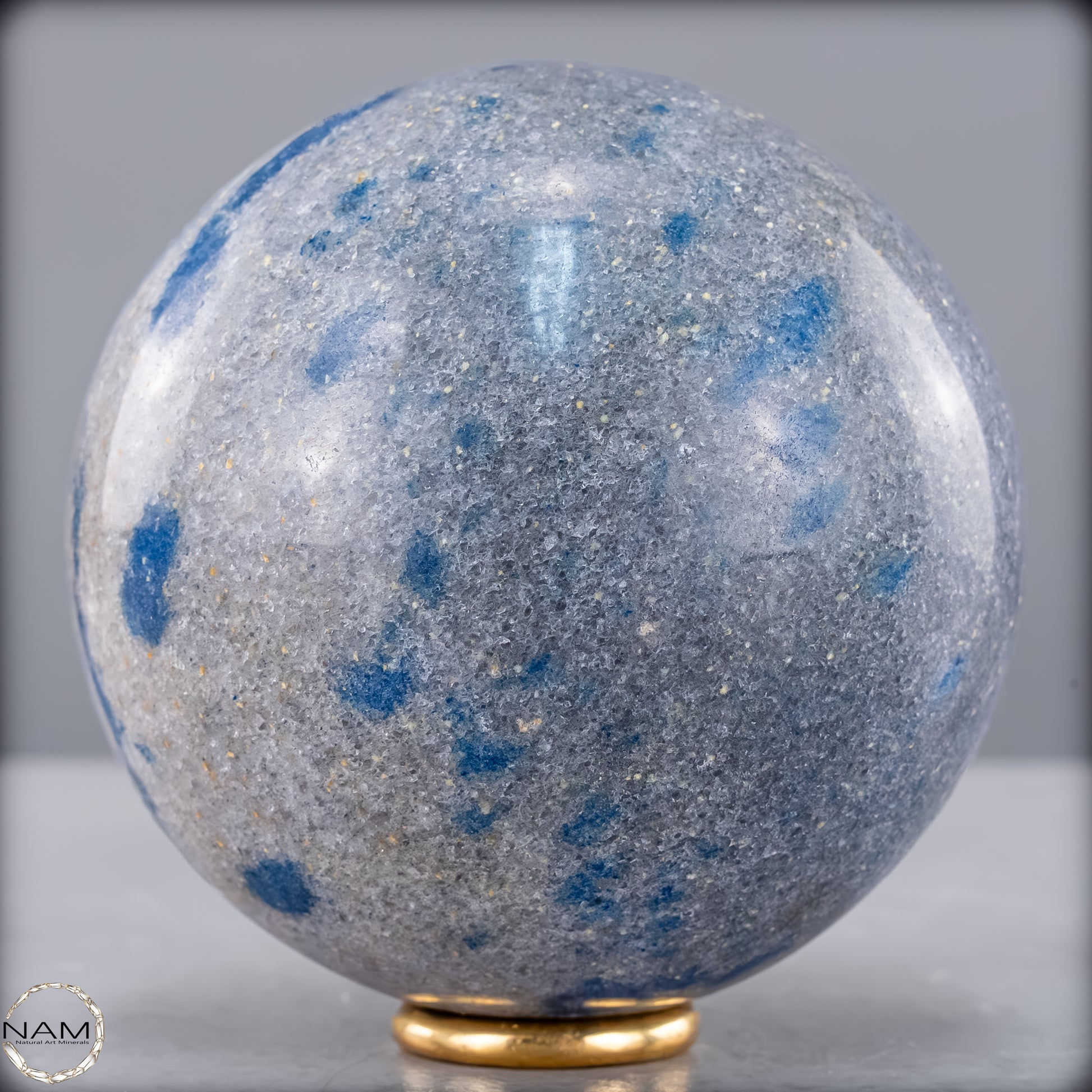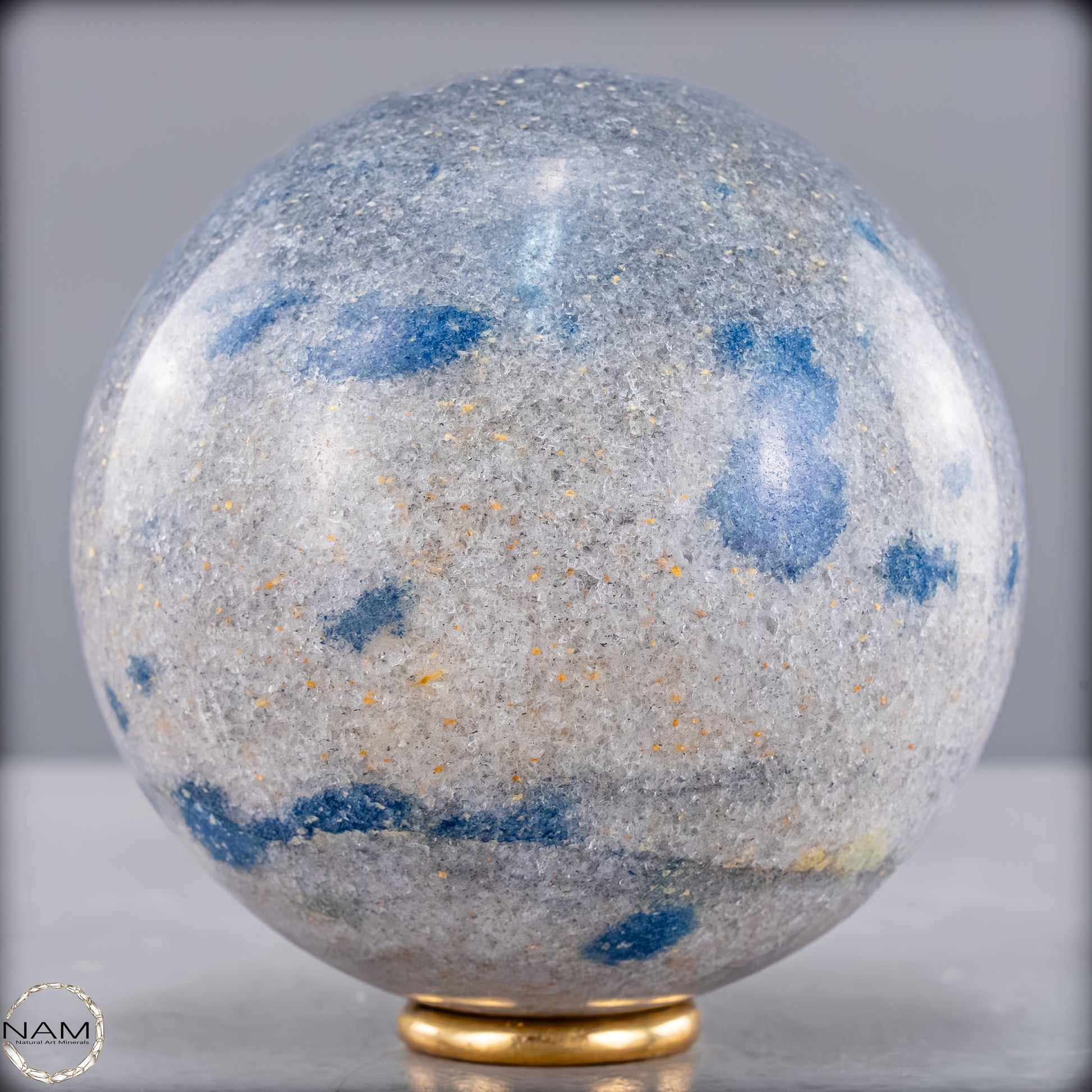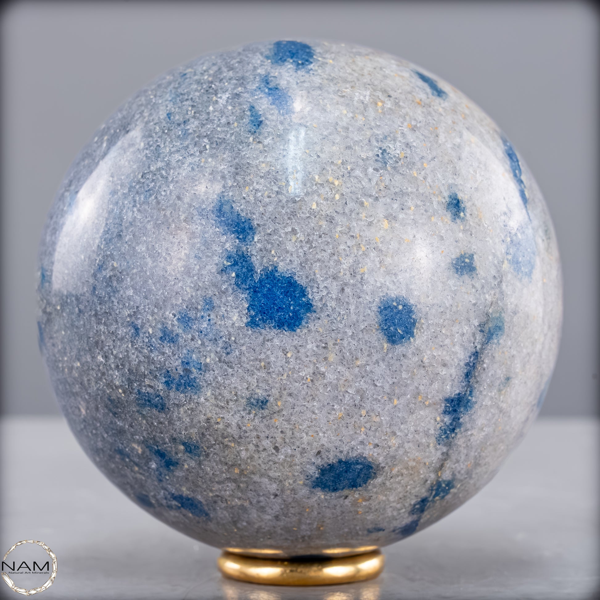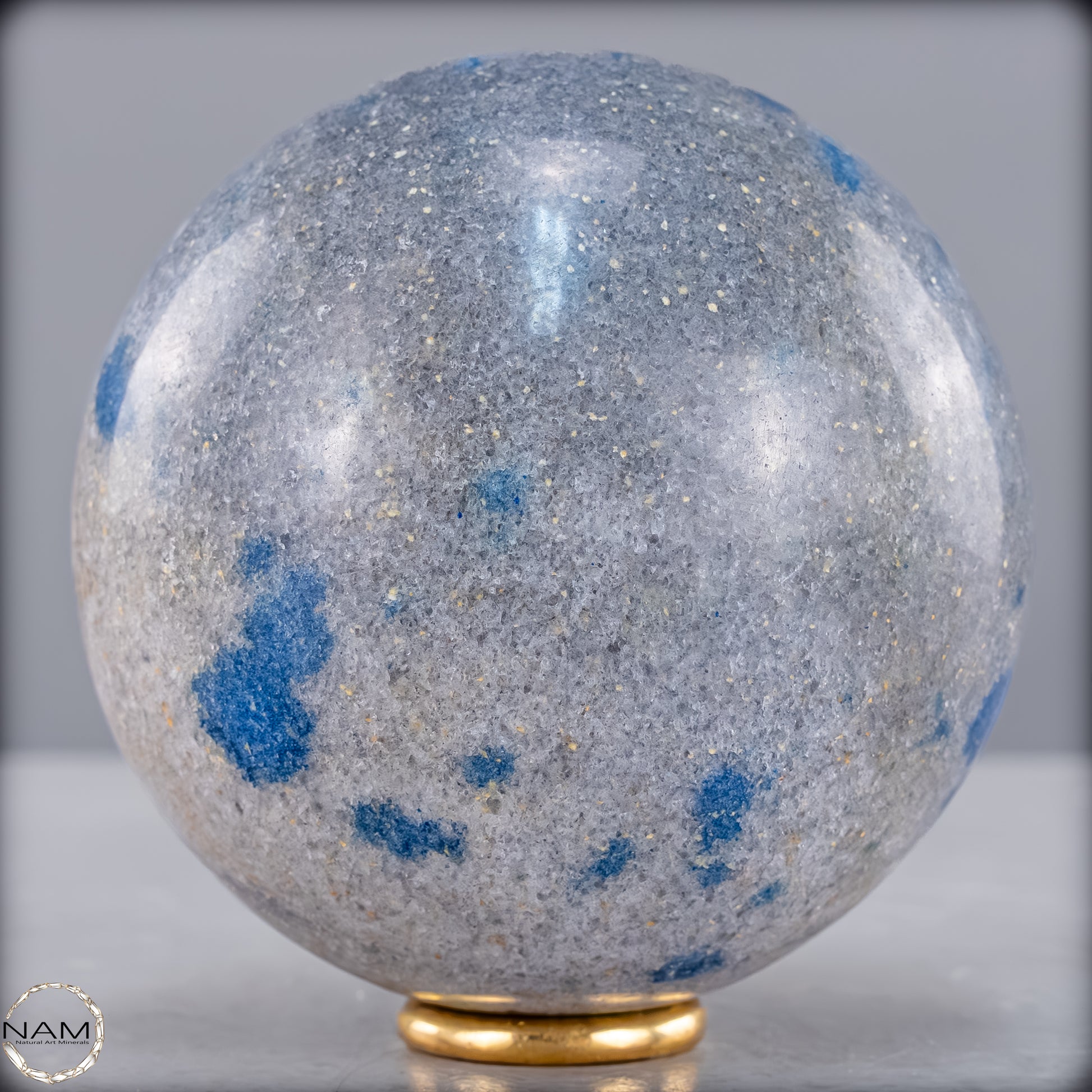 Diese eindrucksvolle K2-Kugel ist ein außergewöhnliches und seltenes Schmuckstück der Natur. Sie besticht durch ihre markanten blauen Flecken auf einem hellgrauen Granithintergrund, die dieses Mineral besonders einzigartig machen. K2, auch bekannt als „Azurit in Granit“, stammt aus der Region des zweithöchsten Berges der Welt, dem K2 im Karakorum-Gebirge, und gehört zu den seltensten Edelsteinen.