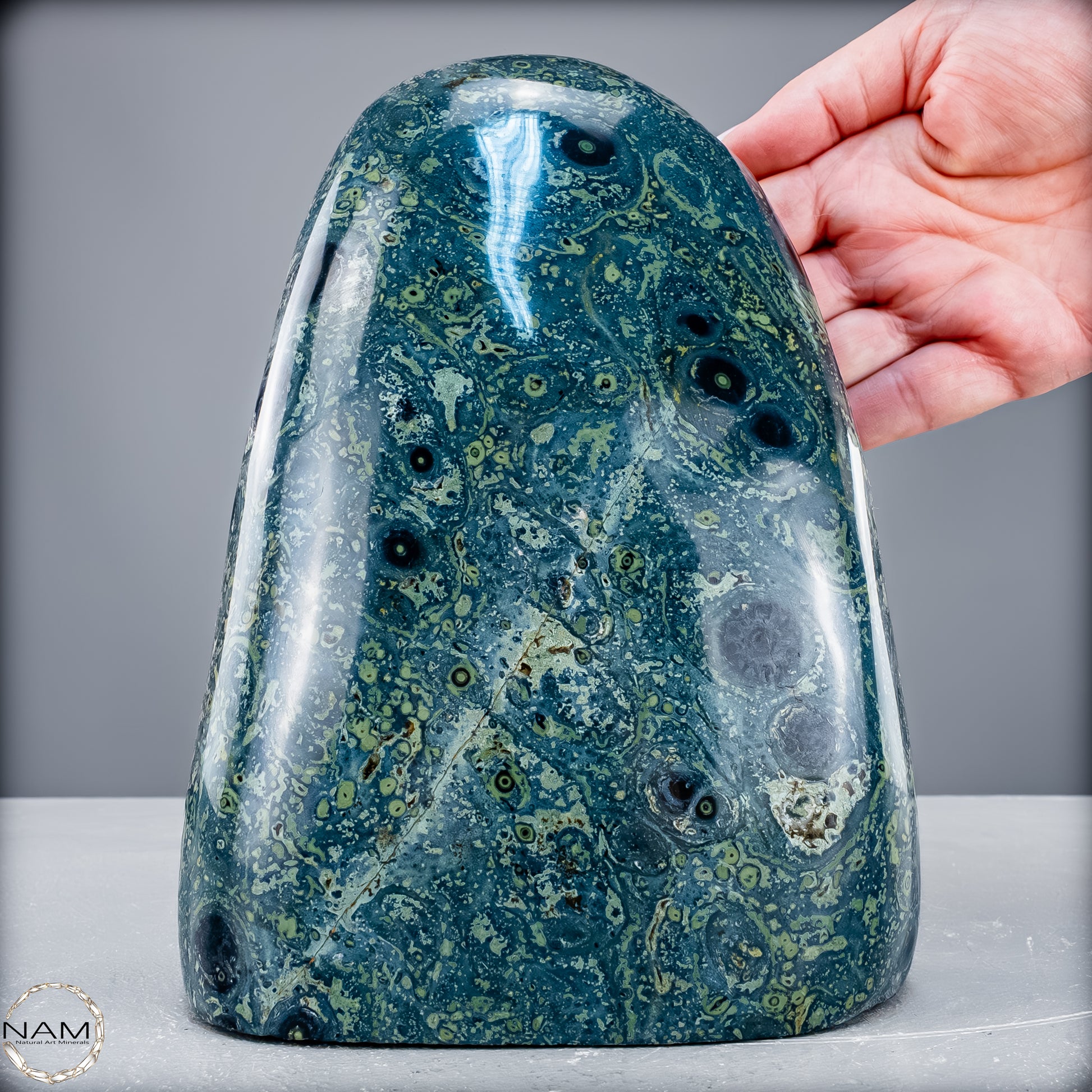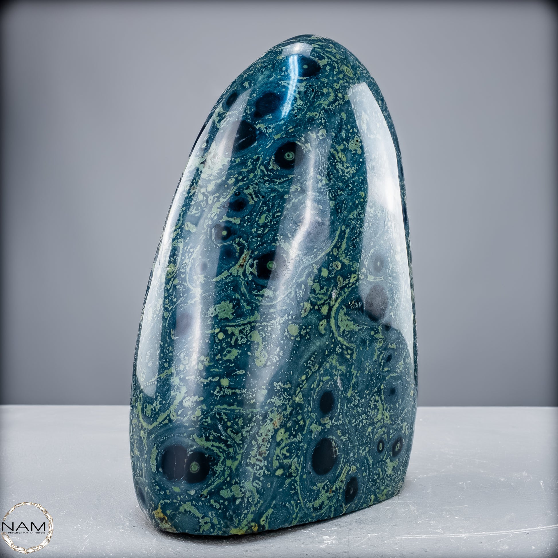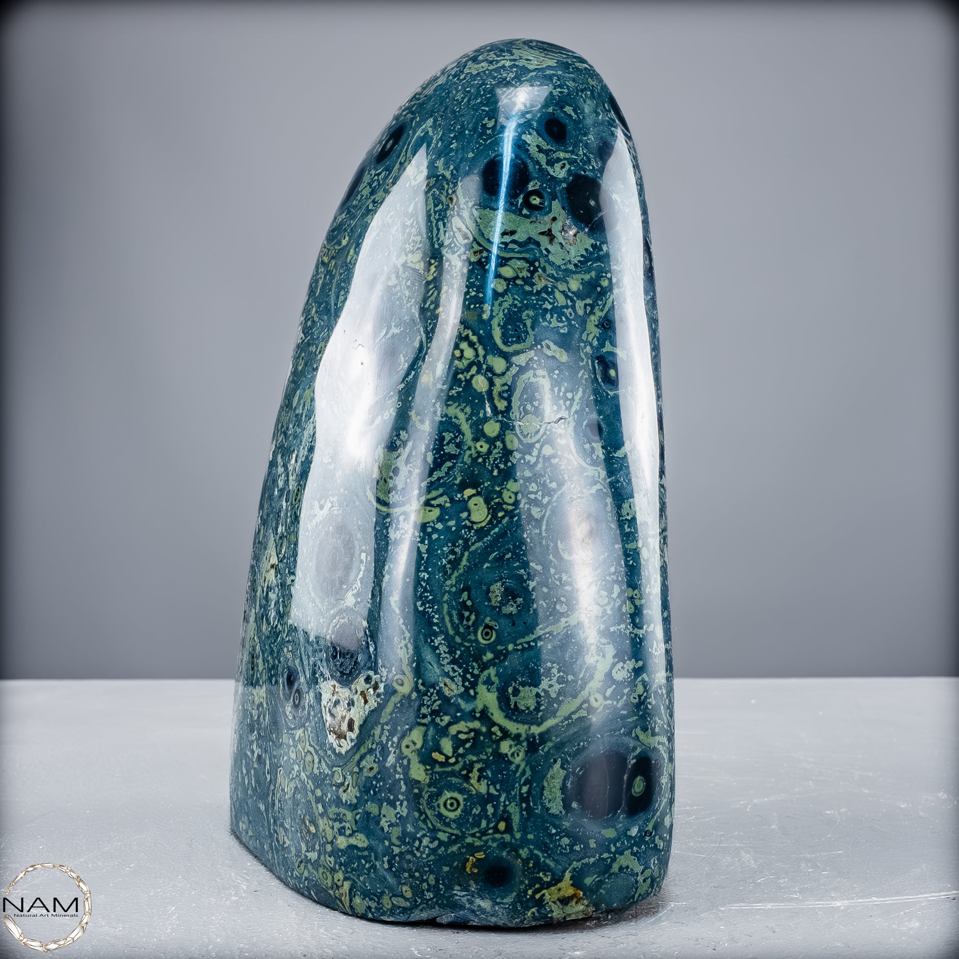 Große Kambaba-Jaspis-Freiformin der höchsten Qualität-Qualität. Dieses Beeindruckende Stück ist aus einem massiven Stück Kambaba-Jaspis handpoliert. Dieses Stück hat einen ausgezeichneten Glanz durch seine Perfekte Politur, ein erstaunliches Muster und ist ein Gesprächsstoff in jedem Raum. Kambaba-Jaspis wird manchmal auch als Krokodil-Jaspis oder Kambaba-Stein bezeichnet. Kambaba-Jaspis, eine Form des kugelförmigen Jaspis, ist auch als Stromatolith-Jaspis bekannt. Dieser seltene versteinerte Stramatolith-Jaspis wird hauptsächlich auf Madagaskar, einem Inselstaat im Indischen Ozean, gefunden. Kambaba-Jaspis enthält einige der ältesten Lebensformen, die wunderschön versteinert sind.