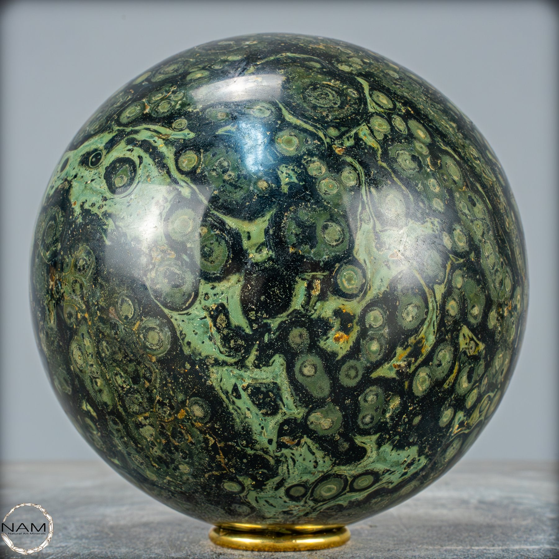 Kambaba- Jaspis, auch bekannt als Krokodilenjaspis, ist ein faszinierender Edelstein mit einer tiefgrünen bis fast schwarzen Grundfarbe, durchzogen von charakteristischen wirbelnden Mustern und konzentrischen Kreisen. Diese markanten Strukturen erinnern an mikrobielle Fossilien und verleihen dem Stein eine geheimnisvolle, schnelle urzeitliche Ausstrahlung. Tatsächlich stammt das Gestein aus uralten Ablagerungen, die über zwei Milliarden Jahre alt sein können, und wird vor allem in Madagaskar und Südafrika gefunden.