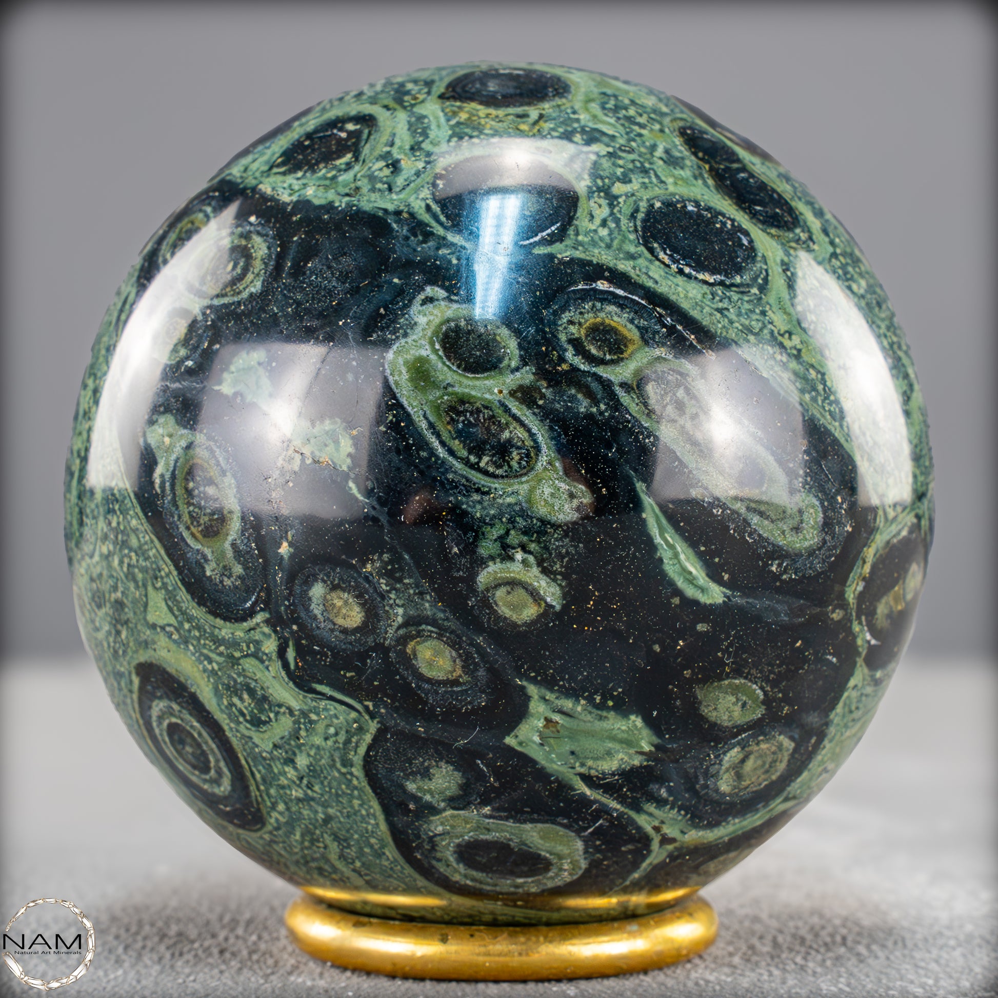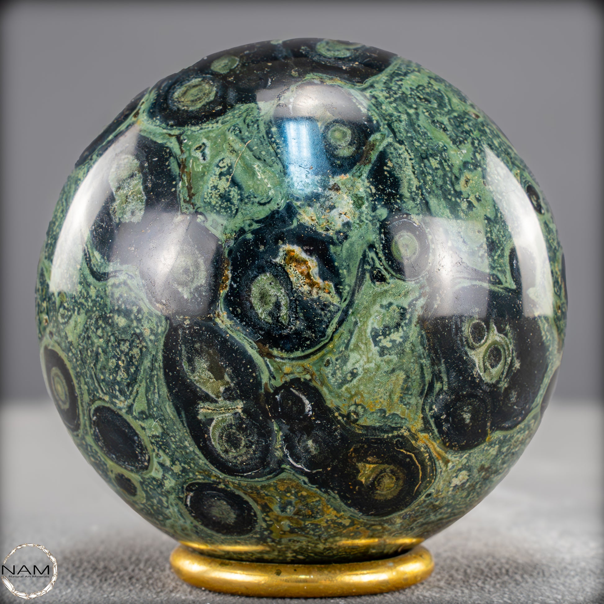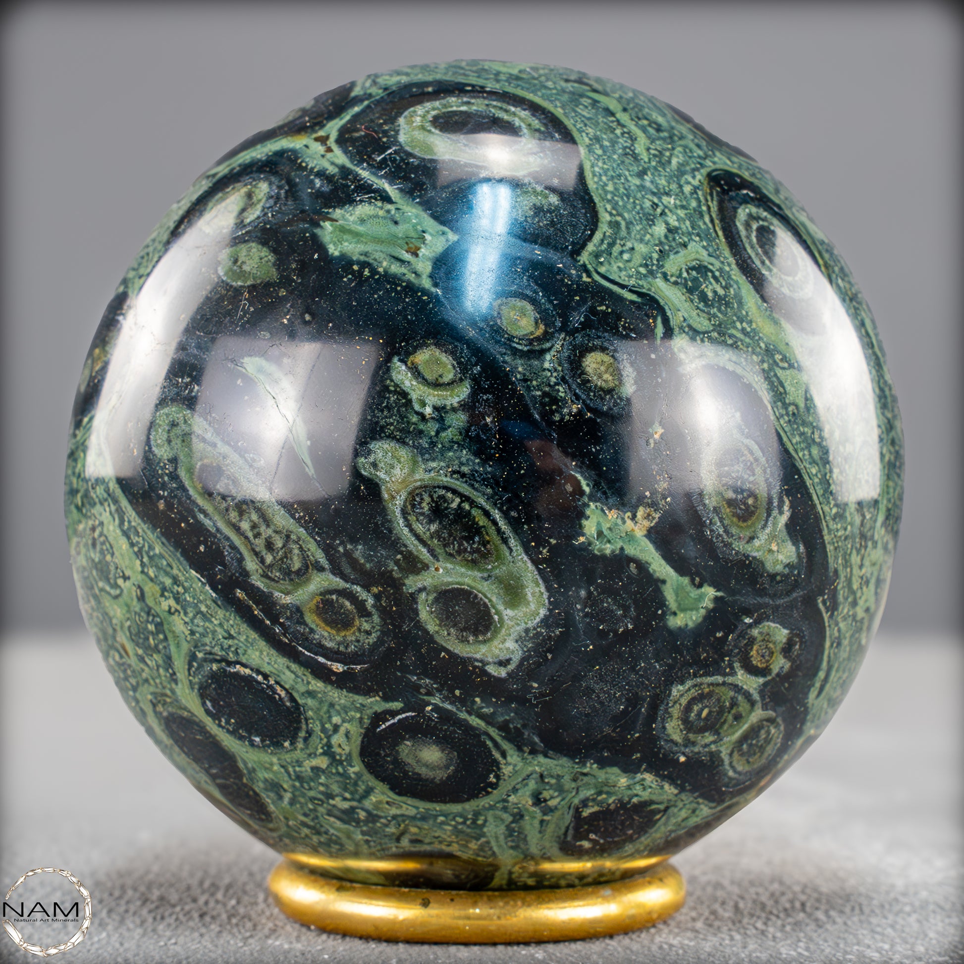 Kambaba- Jaspis, auch bekannt als Krokodilenjaspis, ist ein faszinierender Edelstein mit einer tiefgrünen bis fast schwarzen Grundfarbe, durchzogen von charakteristischen wirbelnden Mustern und konzentrischen Kreisen. Diese markanten Strukturen erinnern an mikrobielle Fossilien und verleihen dem Stein eine geheimnisvolle, schnelle urzeitliche Ausstrahlung. Tatsächlich stammt das Gestein aus uralten Ablagerungen, die über zwei Milliarden Jahre alt sein können, und wird vor allem in Madagaskar und Südafrika gefunden.