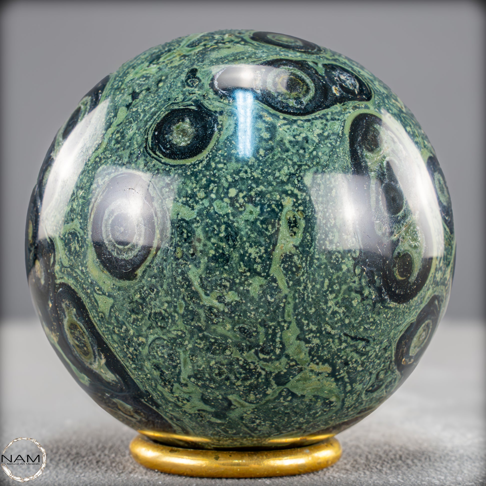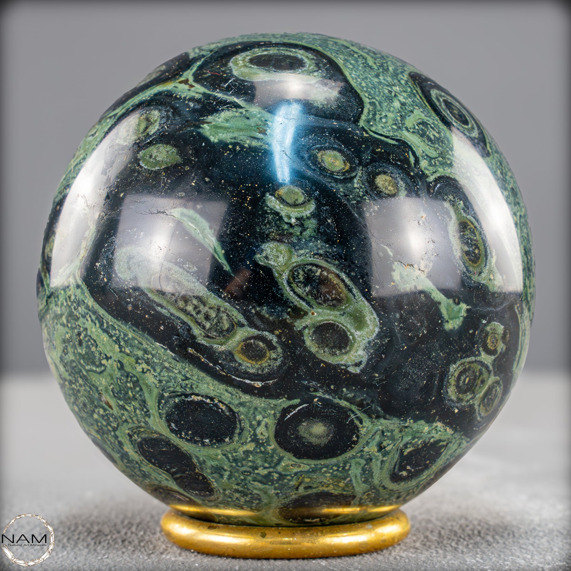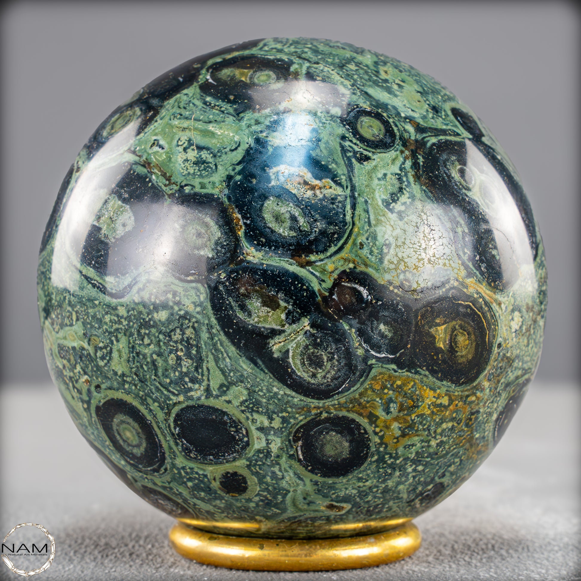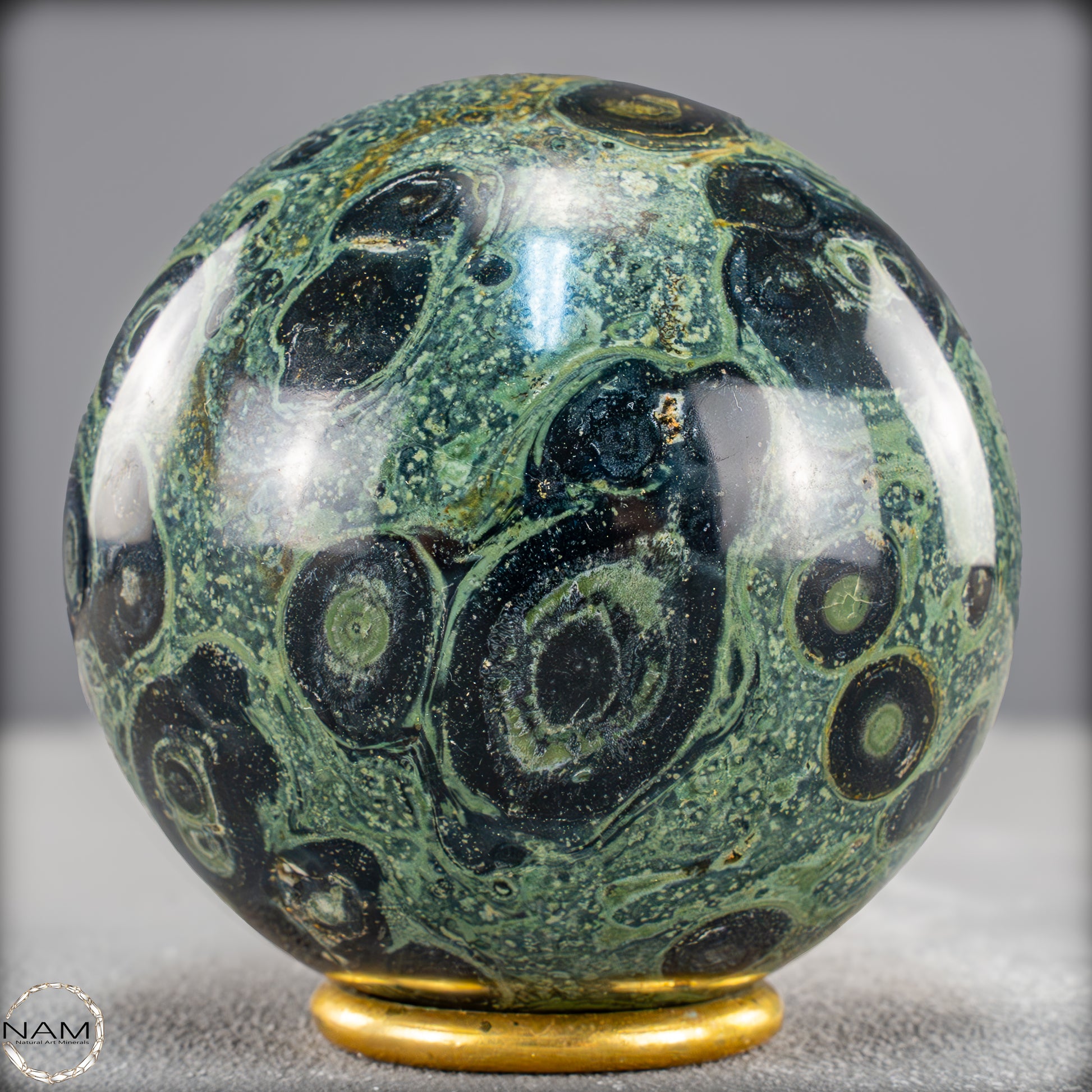 Kambaba- Jaspis, auch bekannt als Krokodilenjaspis, ist ein faszinierender Edelstein mit einer tiefgrünen bis fast schwarzen Grundfarbe, durchzogen von charakteristischen wirbelnden Mustern und konzentrischen Kreisen. Diese markanten Strukturen erinnern an mikrobielle Fossilien und verleihen dem Stein eine geheimnisvolle, schnelle urzeitliche Ausstrahlung. Tatsächlich stammt das Gestein aus uralten Ablagerungen, die über zwei Milliarden Jahre alt sein können, und wird vor allem in Madagaskar und Südafrika gefunden.