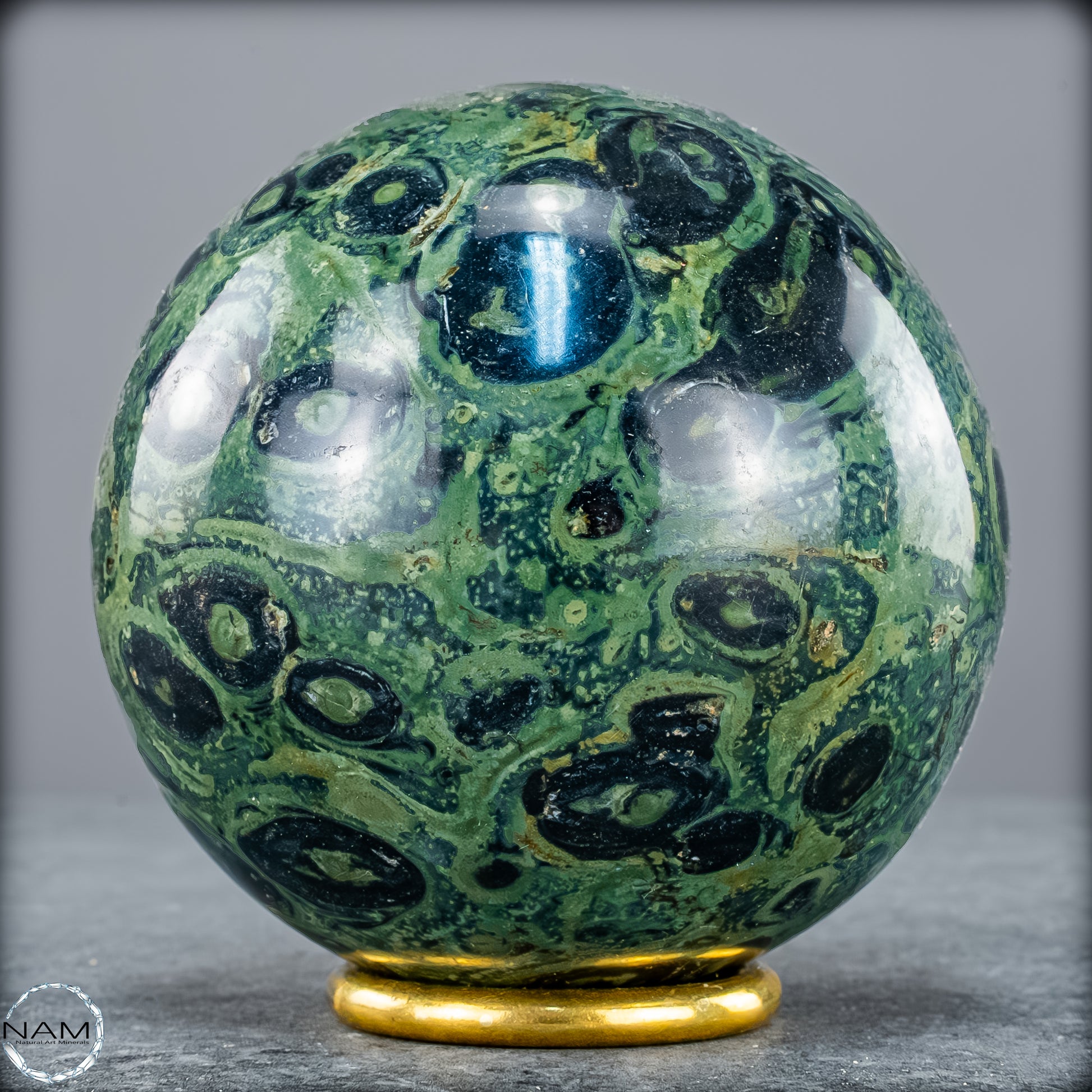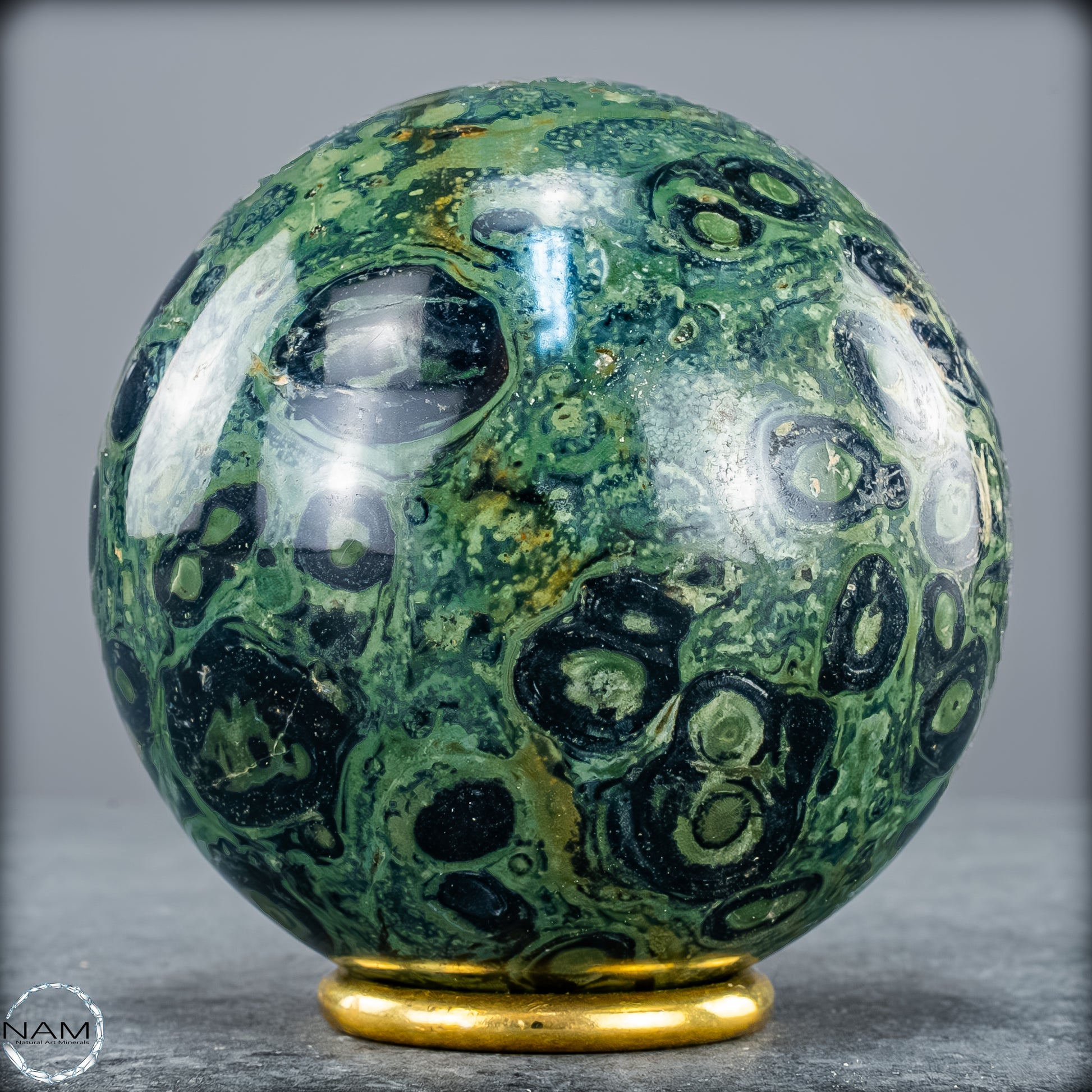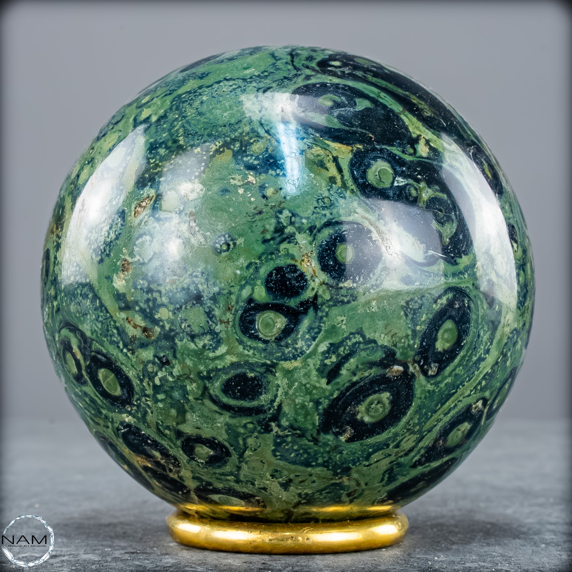 Kambaba- Jaspis, auch bekannt als Krokodilenjaspis, ist ein faszinierender Edelstein mit einer tiefgrünen bis fast schwarzen Grundfarbe, durchzogen von charakteristischen wirbelnden Mustern und konzentrischen Kreisen. Diese markanten Strukturen erinnern an mikrobielle Fossilien und verleihen dem Stein eine geheimnisvolle, schnelle urzeitliche Ausstrahlung. Tatsächlich stammt das Gestein aus uralten Ablagerungen, die über zwei Milliarden Jahre alt sein können, und wird vor allem in Madagaskar und Südafrika gefunden.