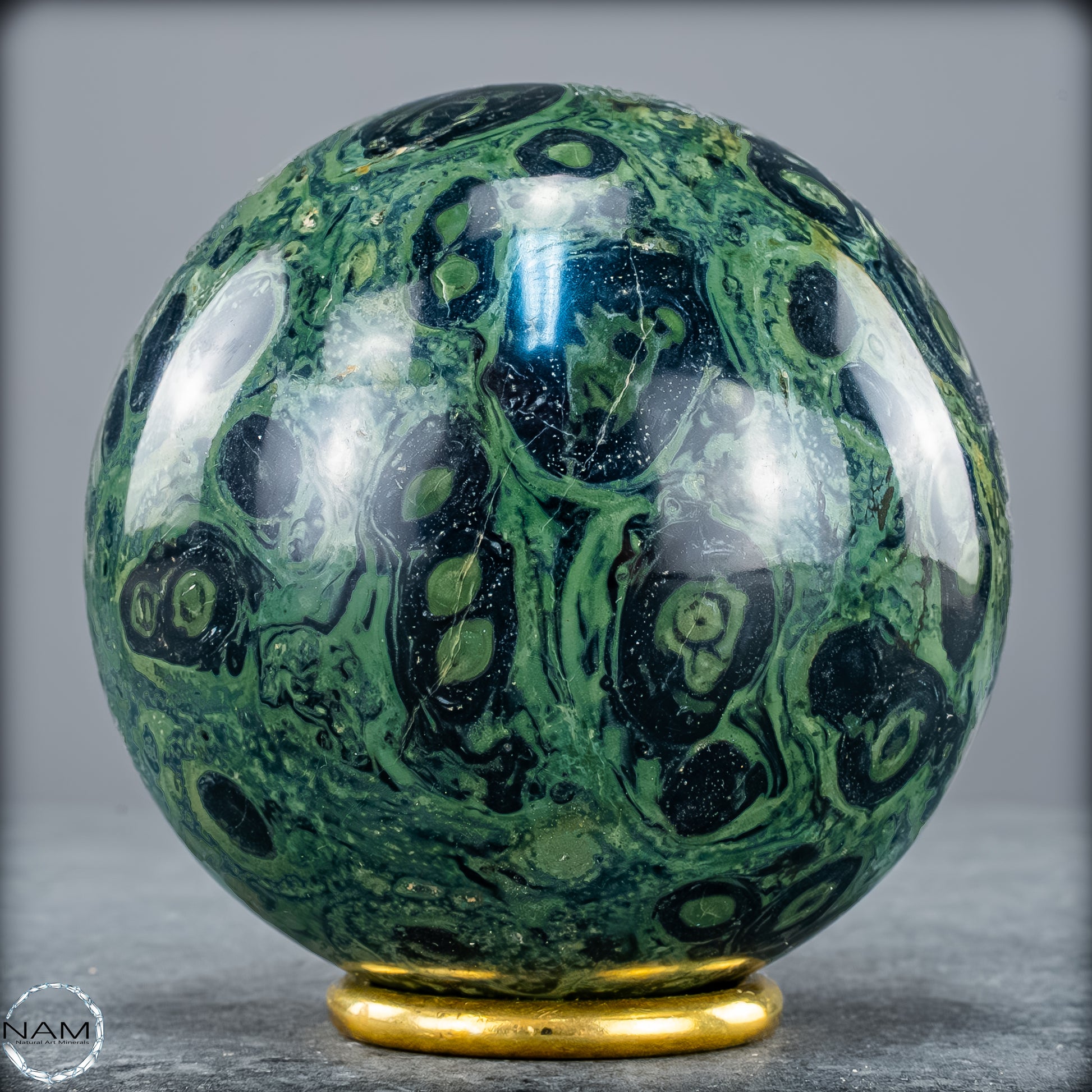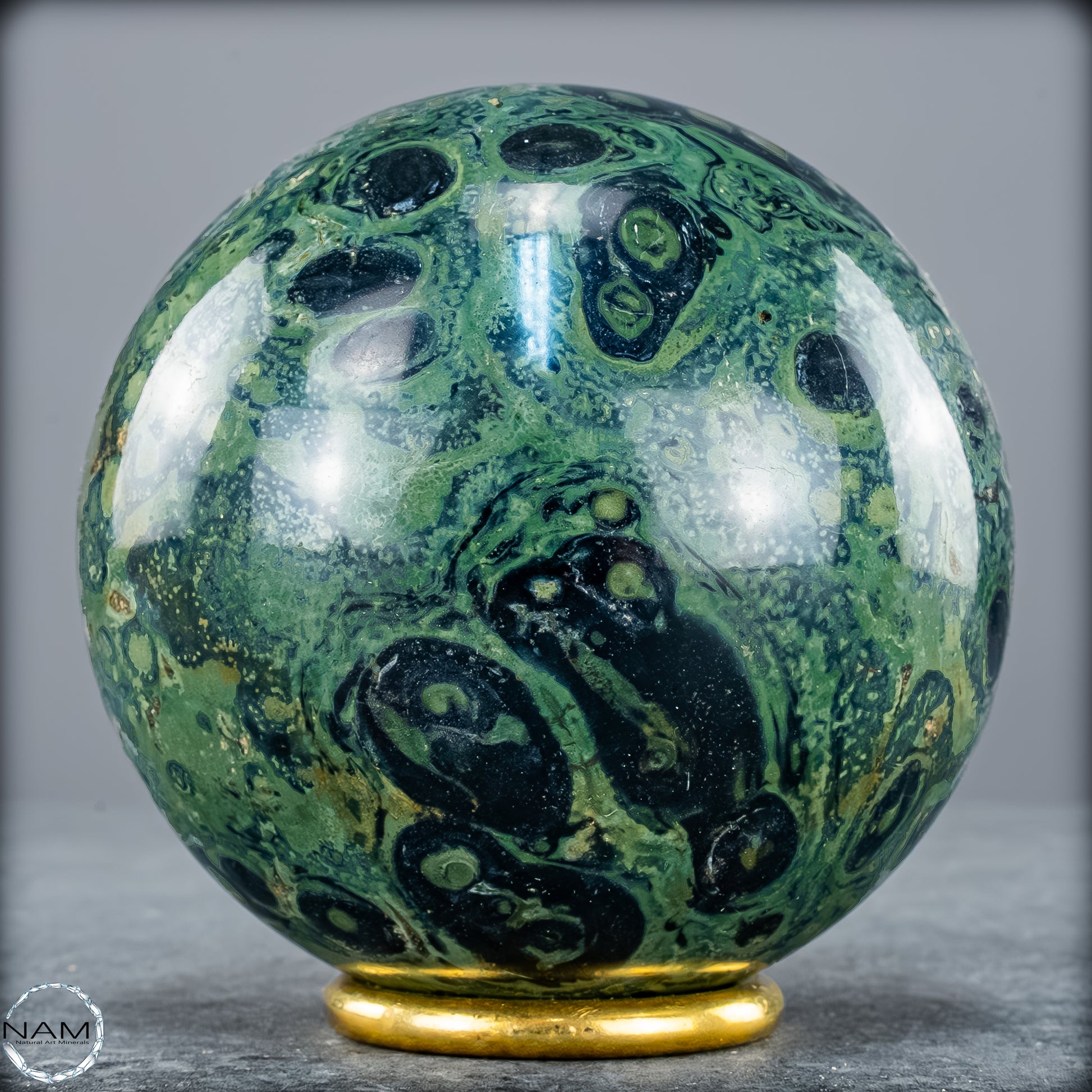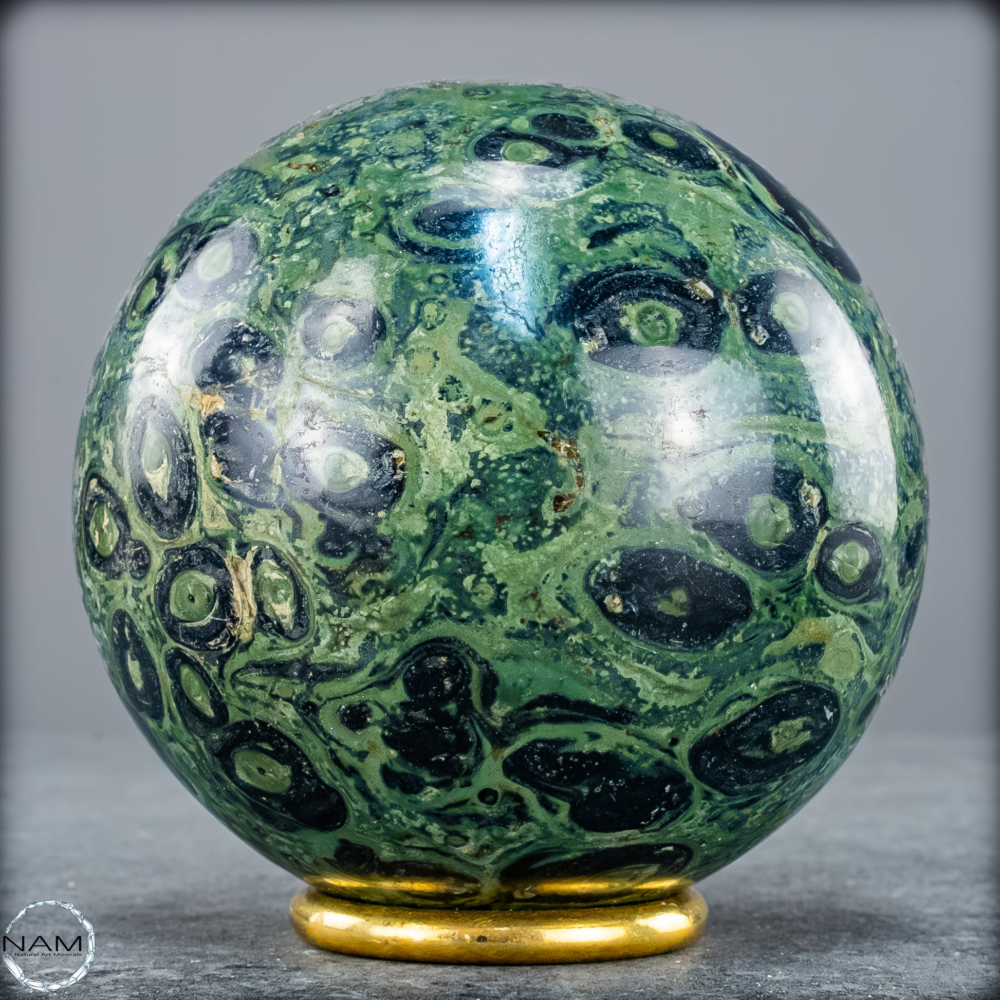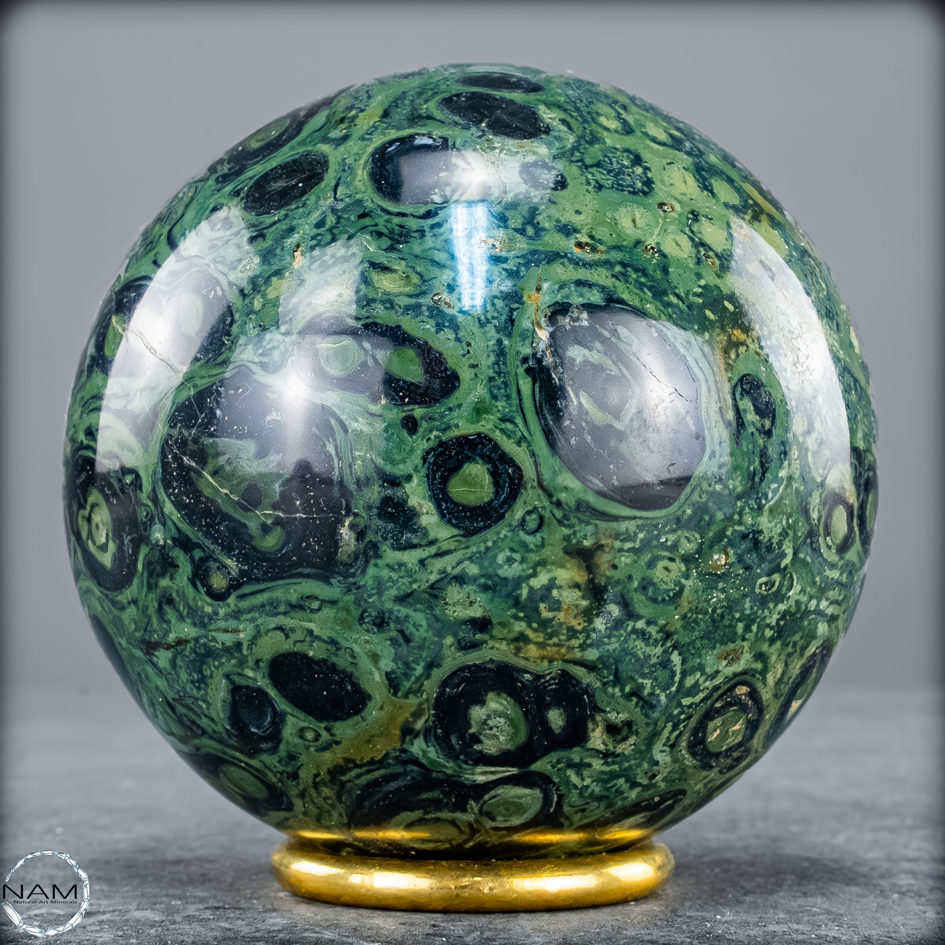 Kambaba- Jaspis, auch bekannt als Krokodilenjaspis, ist ein faszinierender Edelstein mit einer tiefgrünen bis fast schwarzen Grundfarbe, durchzogen von charakteristischen wirbelnden Mustern und konzentrischen Kreisen. Diese markanten Strukturen erinnern an mikrobielle Fossilien und verleihen dem Stein eine geheimnisvolle, schnelle urzeitliche Ausstrahlung. Tatsächlich stammt das Gestein aus uralten Ablagerungen, die über zwei Milliarden Jahre alt sein können, und wird vor allem in Madagaskar und Südafrika gefunden.