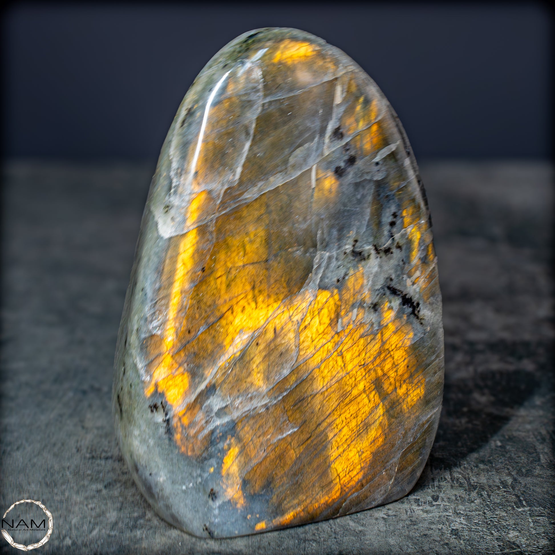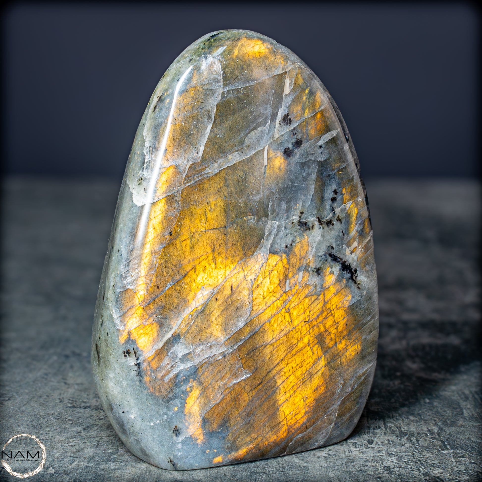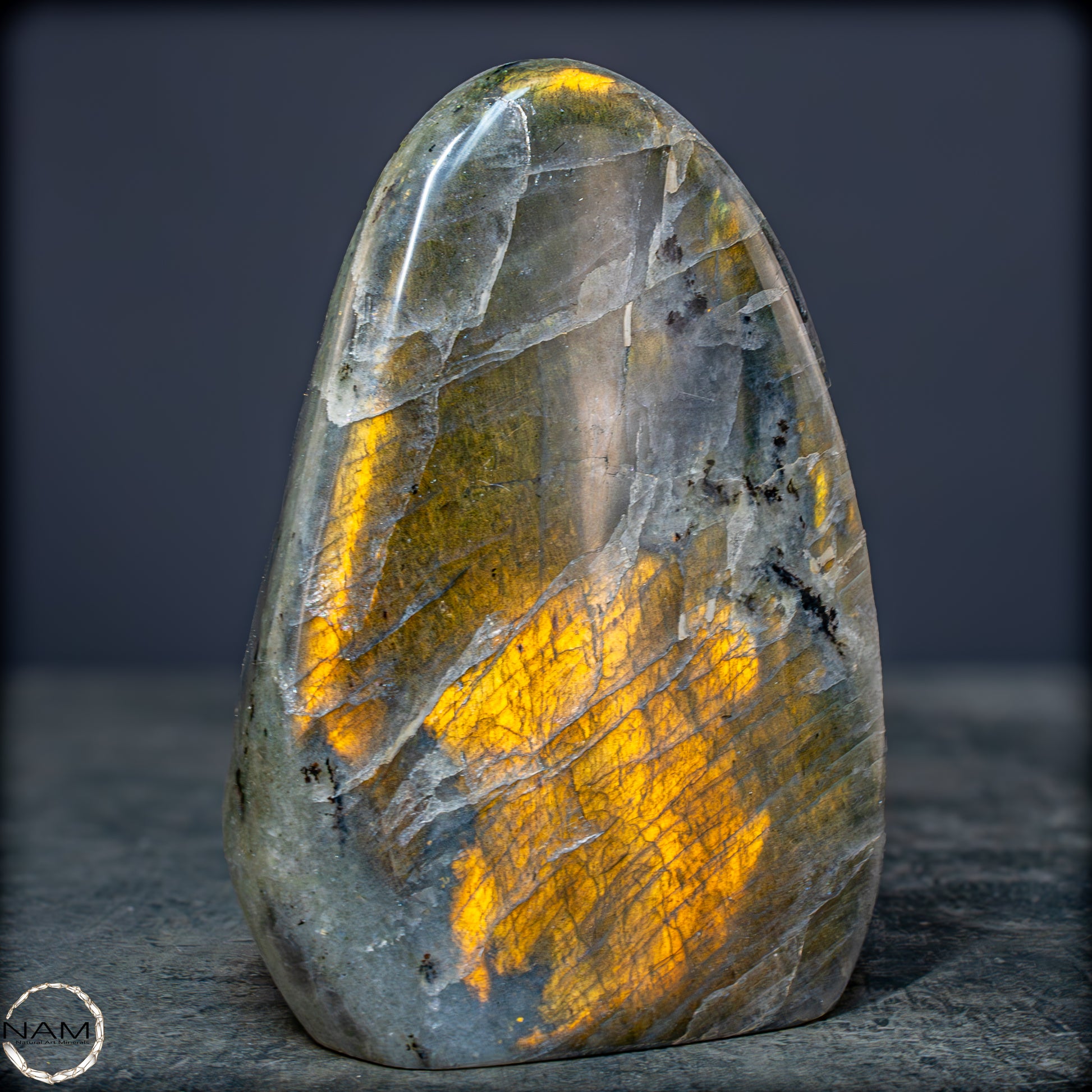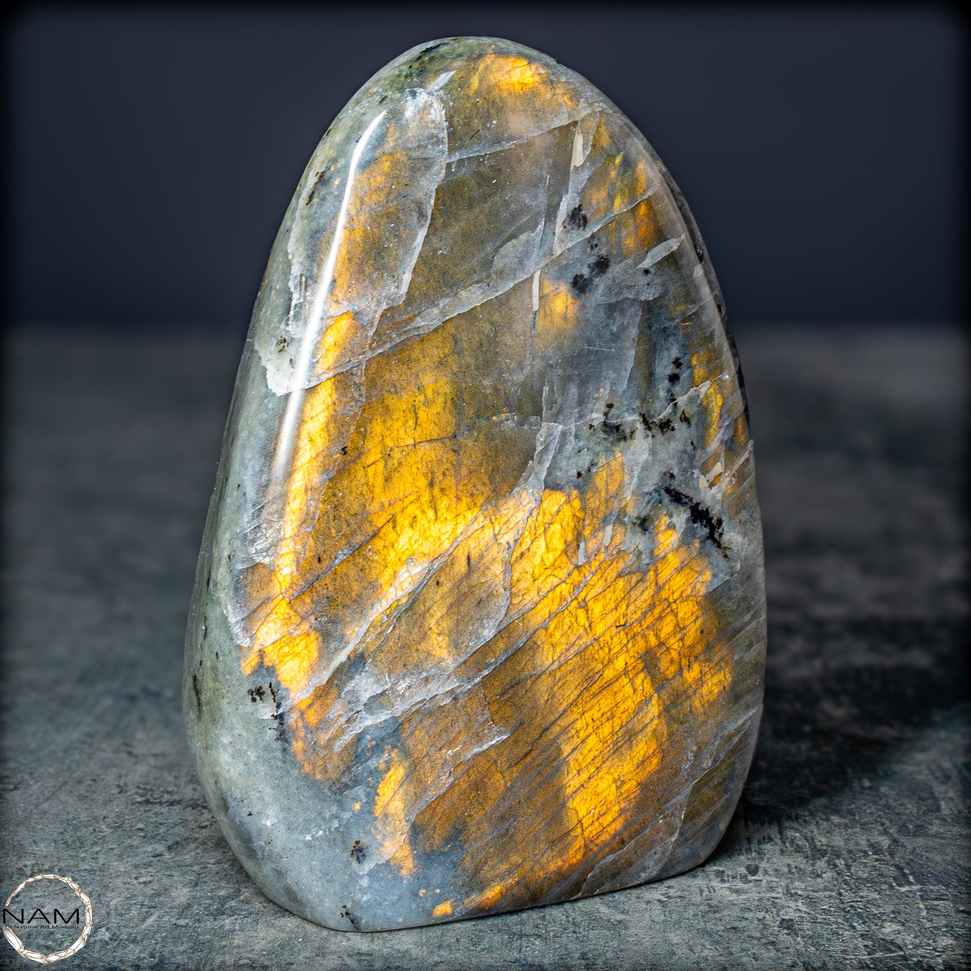 Die Form selbst ist organisch und ausgewogen, ideal als Blickfang in einer Sammlung oder als energetisches Objekt in einem besonderen Raum. Labradorit gilt als Stein der Intuition und Transformation – diese Freiform bringt seine mystische Ausstrahlung in besonders eindrucksvoller Weise zur Geltung.