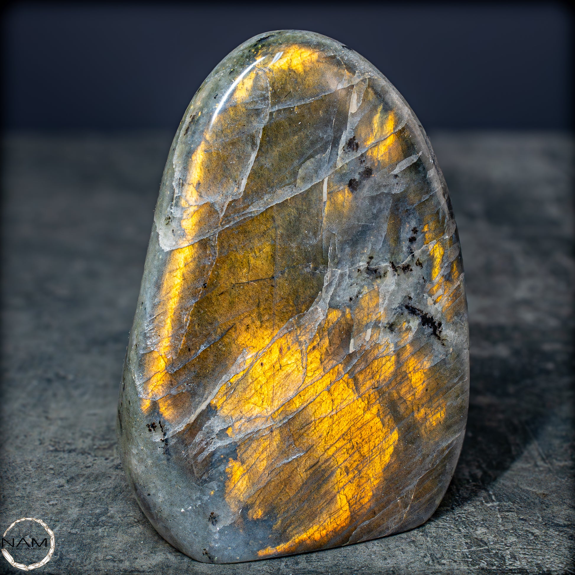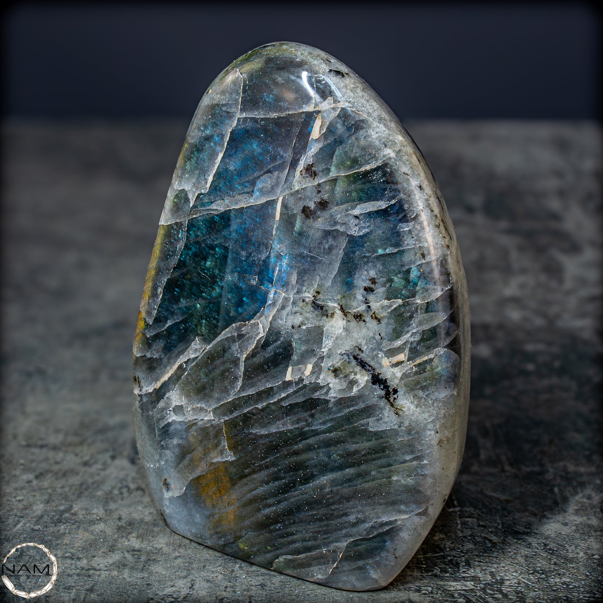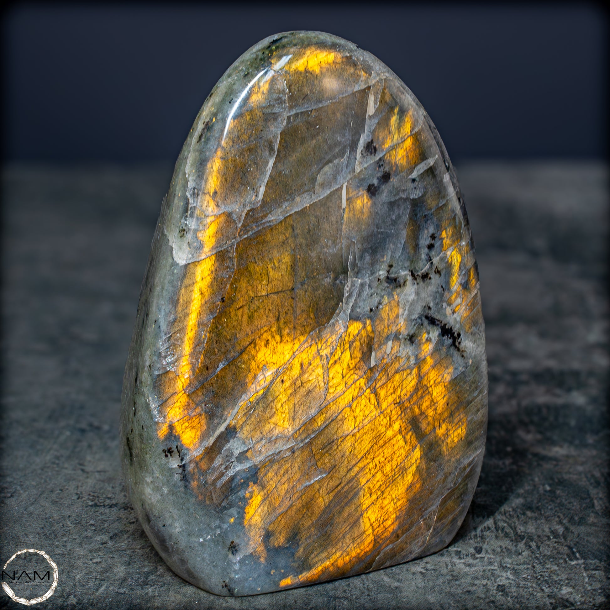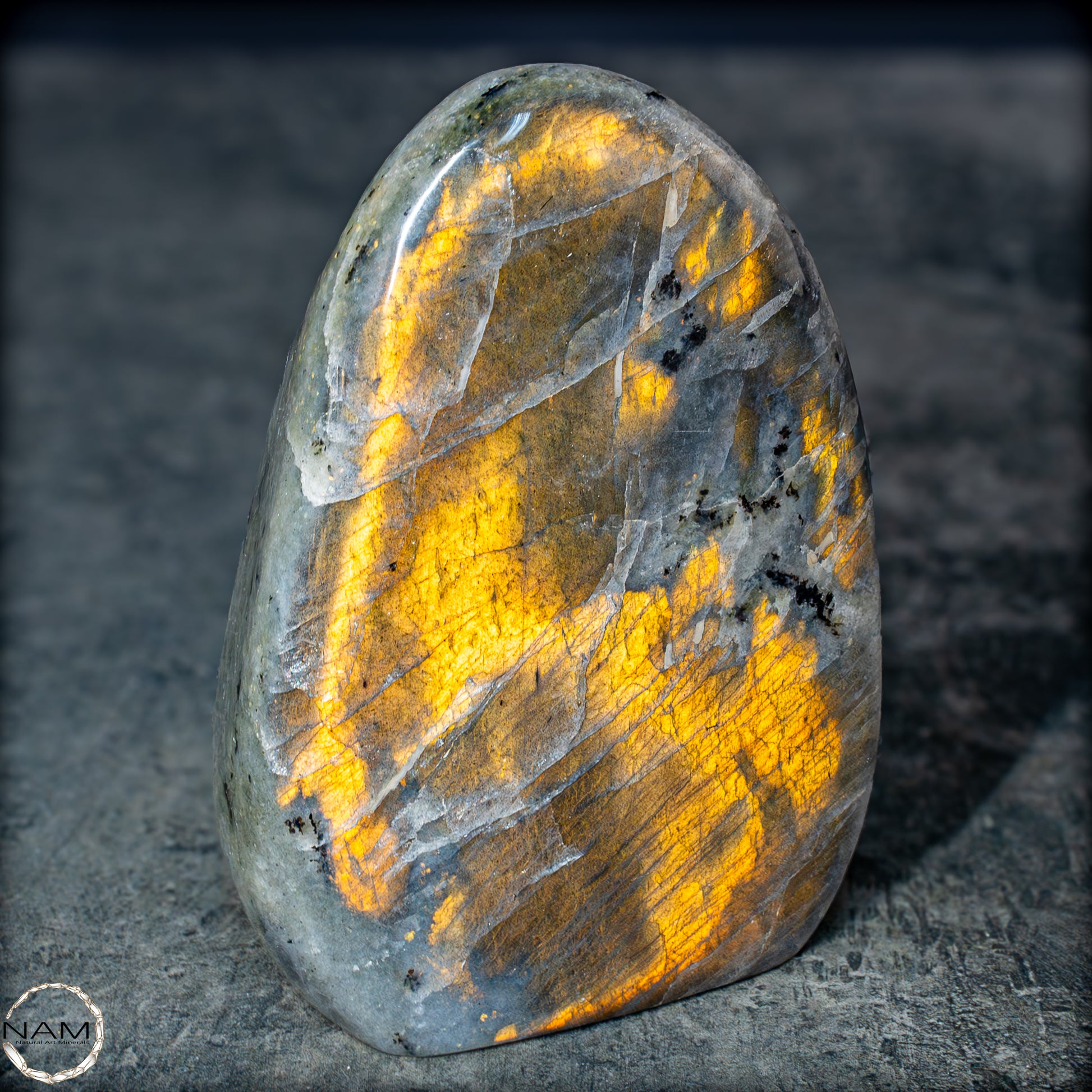 Die Form selbst ist organisch und ausgewogen, ideal als Blickfang in einer Sammlung oder als energetisches Objekt in einem besonderen Raum. Labradorit gilt als Stein der Intuition und Transformation – diese Freiform bringt seine mystische Ausstrahlung in besonders eindrucksvoller Weise zur Geltung.