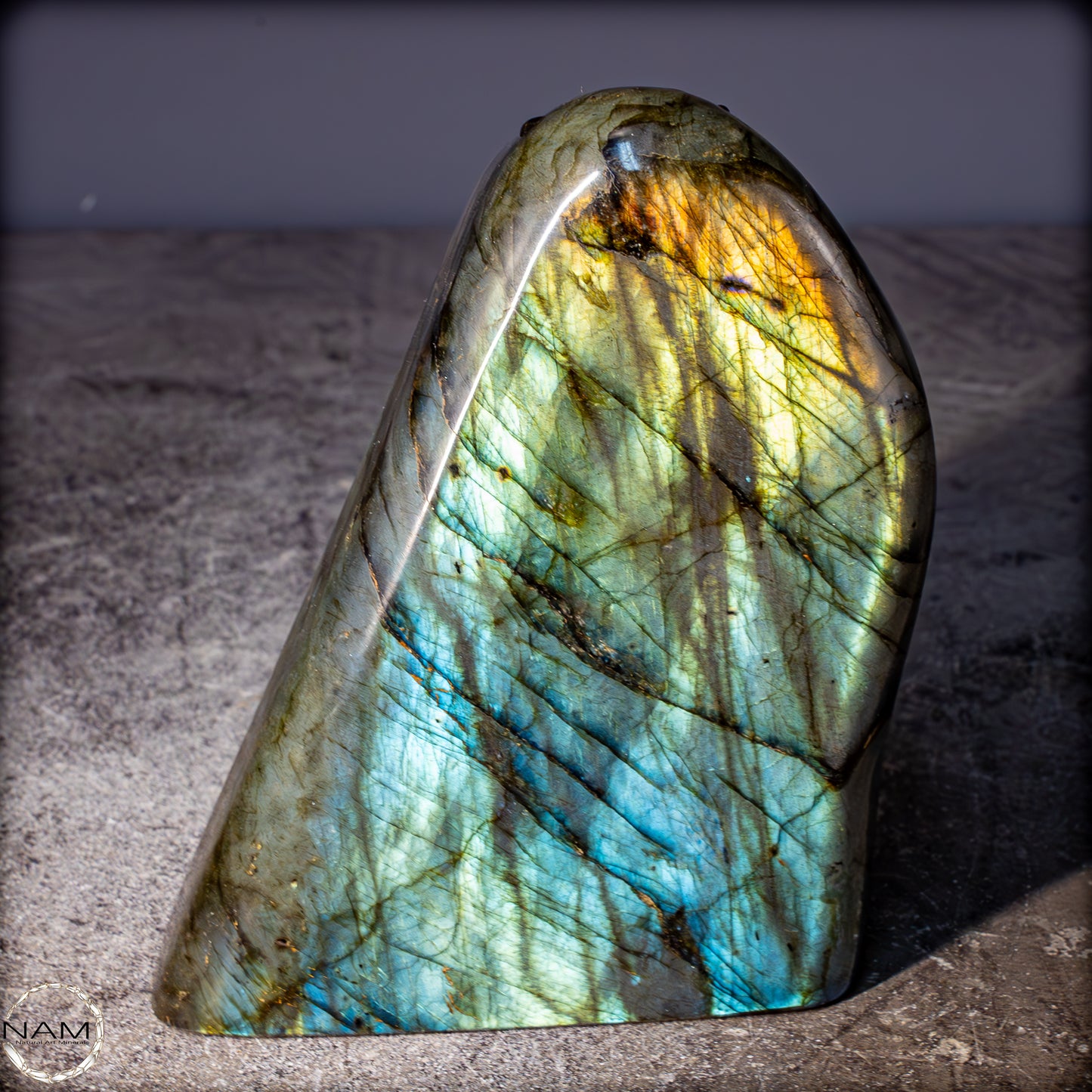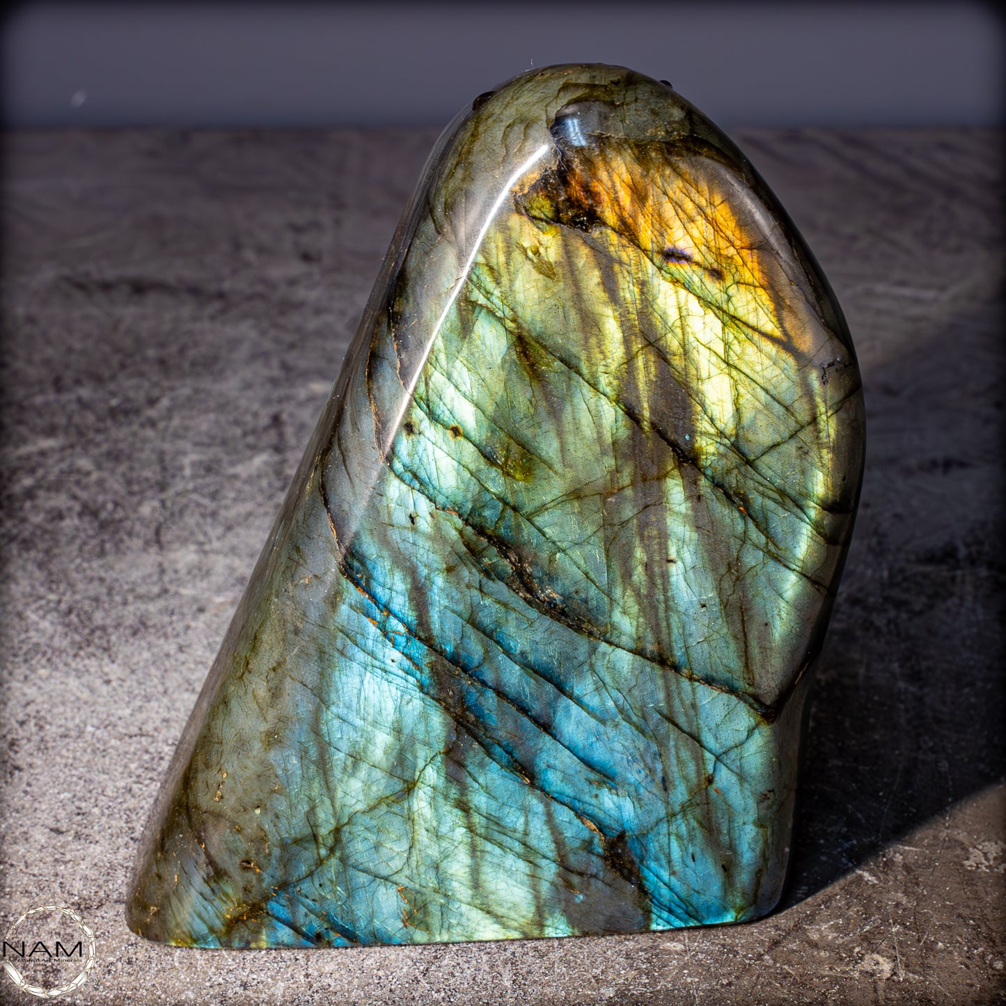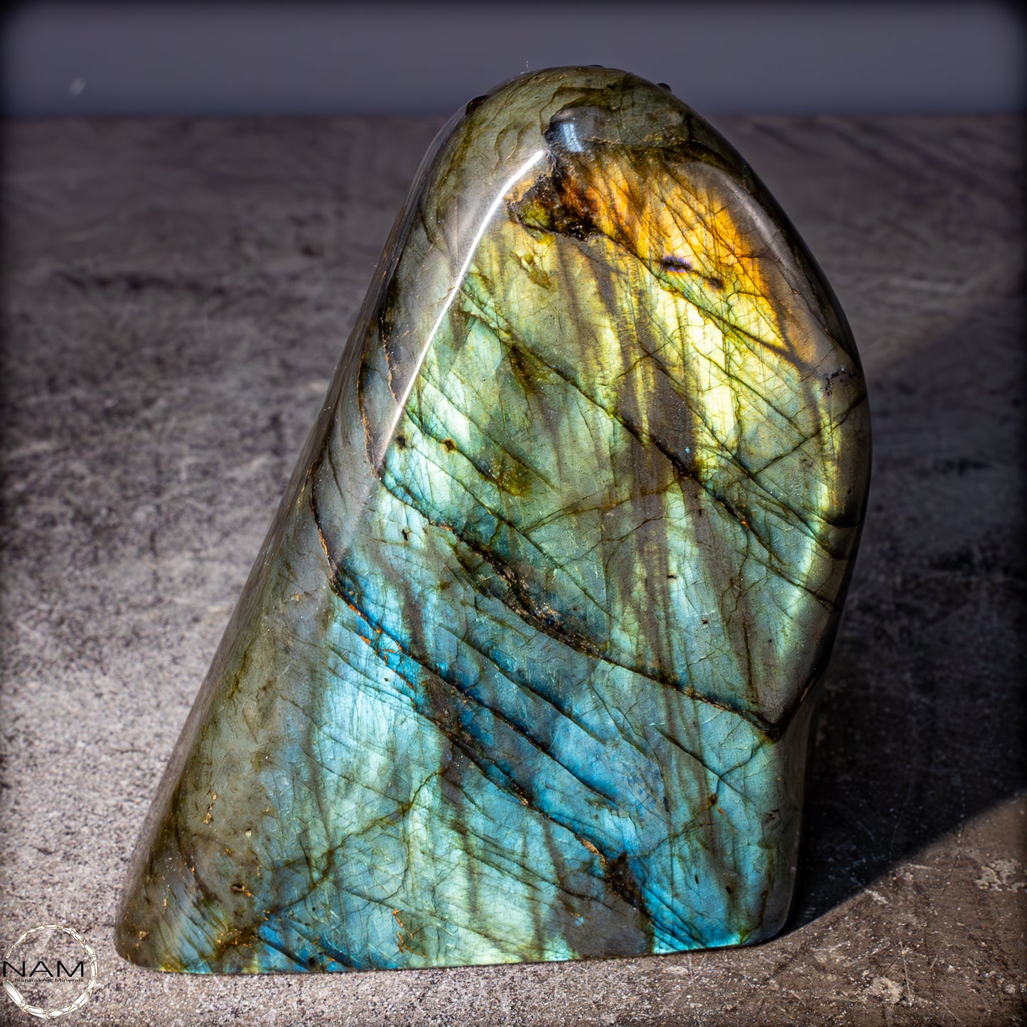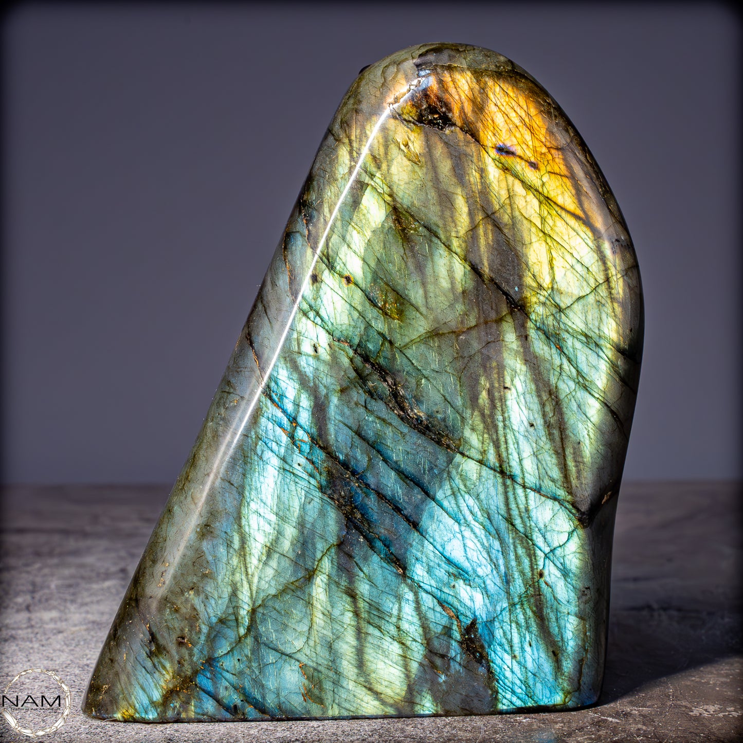Das magische Farbenspiel des Labradorits wird auch Labradorisieren genannt. Das natürliche Licht bricht an den Kristallen auf der Oberfläche des Edelsteins. Die in ihm enthaltenen Mineralien reflektieren blau,gelb, gold, orange und grün. Einer Inuit-Legende zufolge schlug ein Krieger mit seinem Schwert auf ein großes Stück Labradorit ein. Die vielen Farben stiegen in den Himmel hinauf. So wurden die Nordlichter geboren.