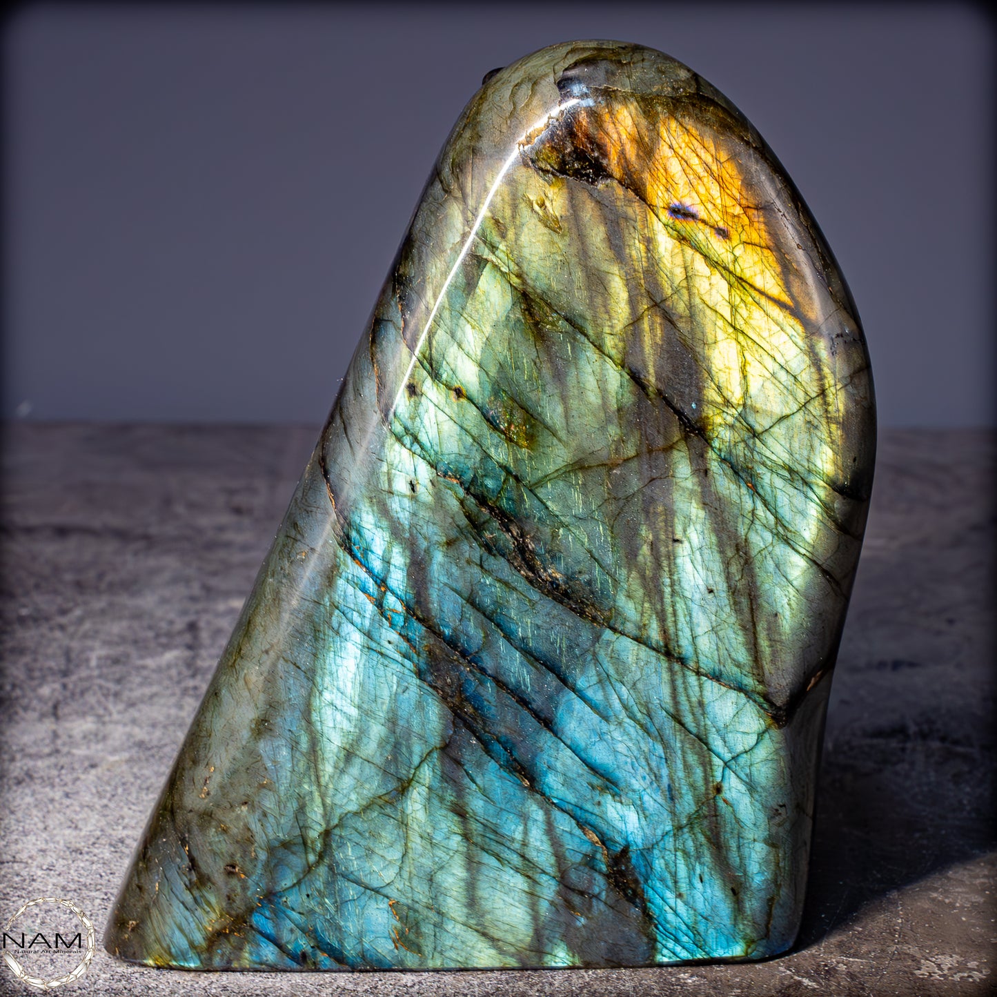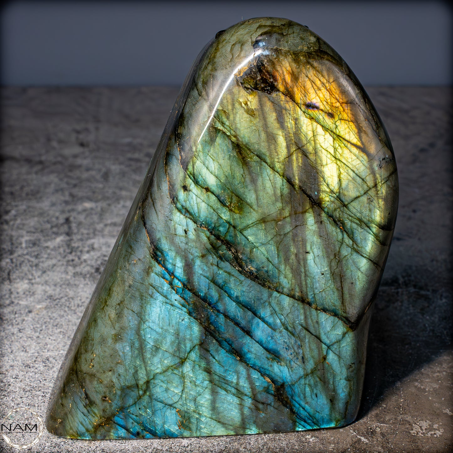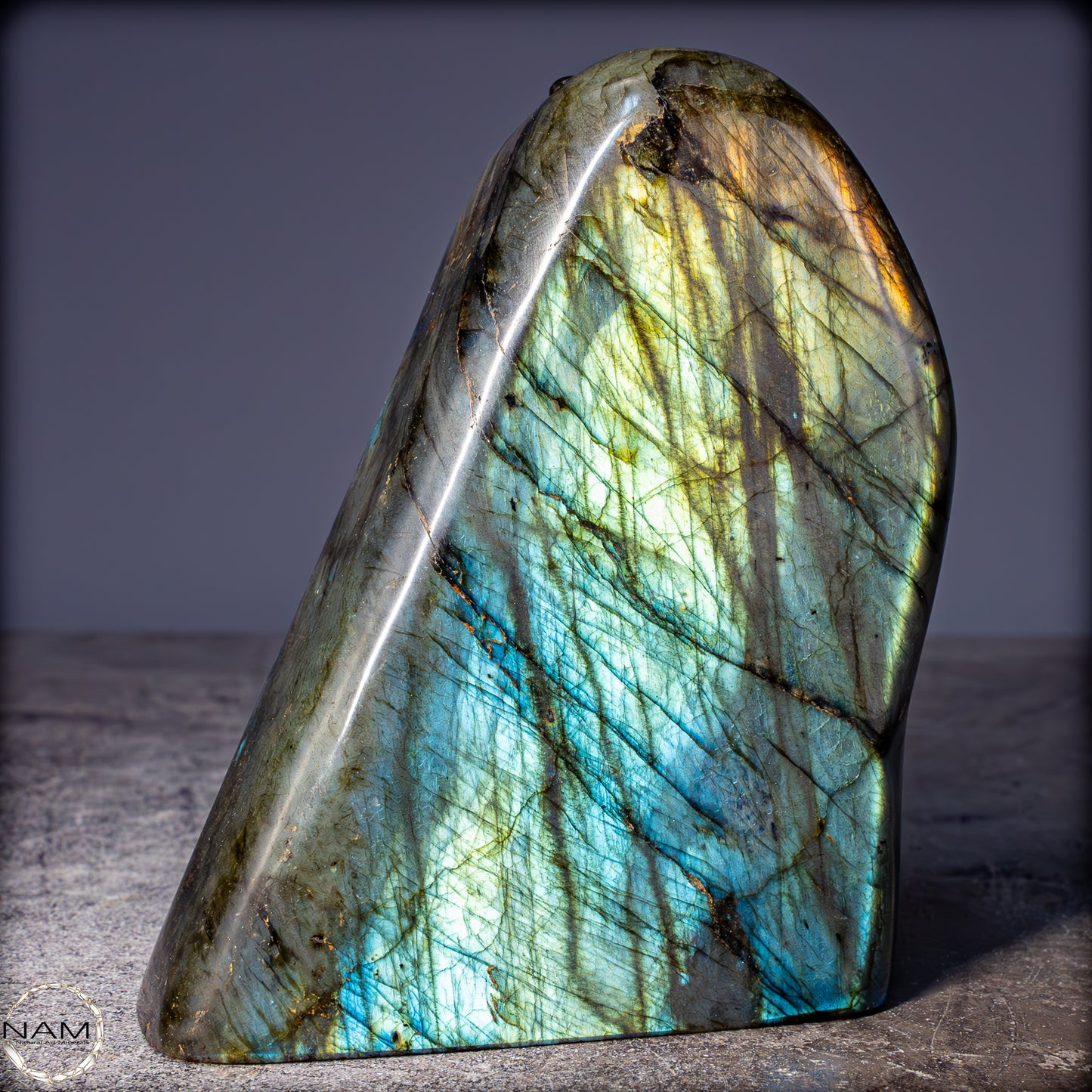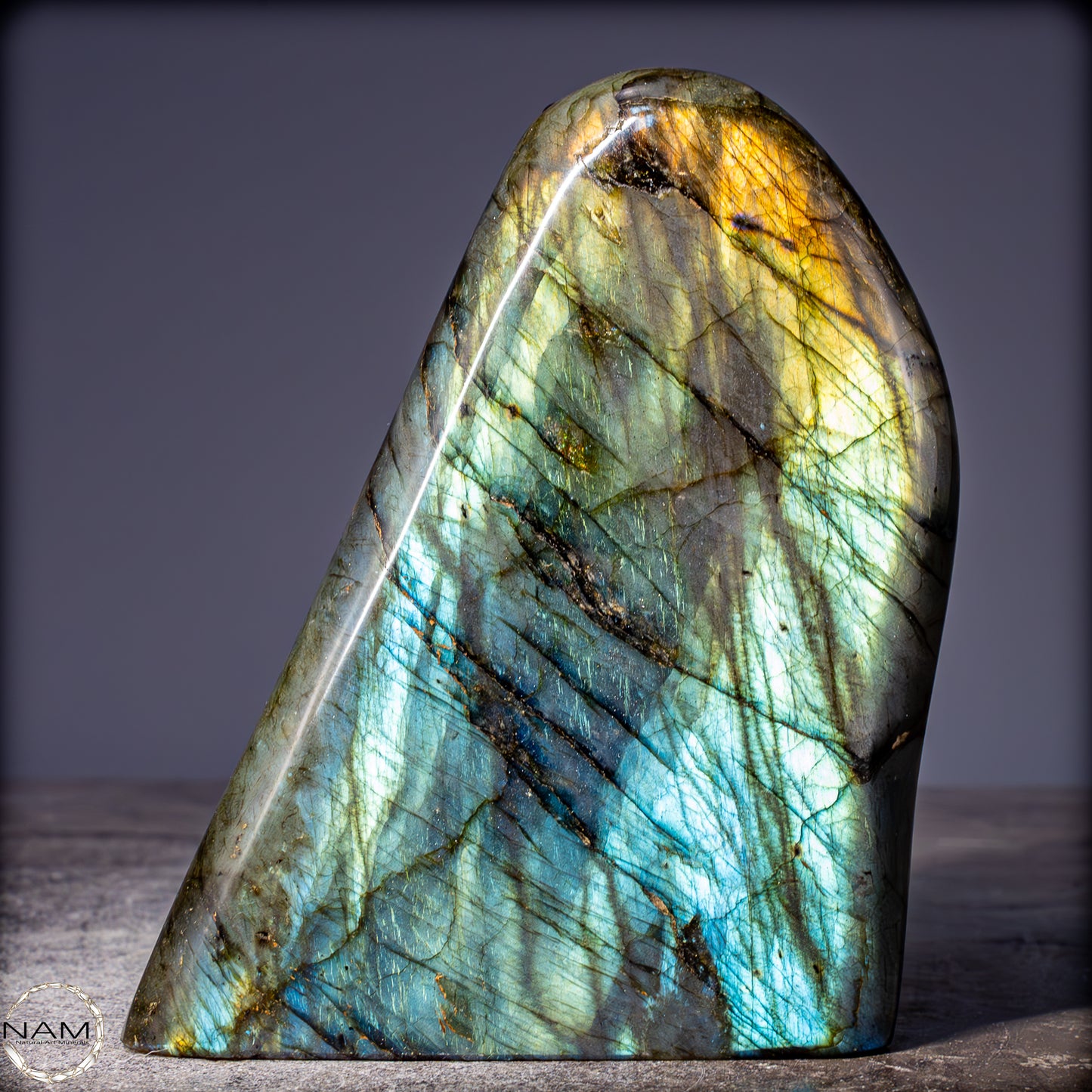 Das magische Farbenspiel des Labradorits wird auch Labradorisieren genannt. Das natürliche Licht bricht an den Kristallen auf der Oberfläche des Edelsteins. Die in ihm enthaltenen Mineralien reflektieren blau,gelb, gold, orange und grün. Einer Inuit-Legende zufolge schlug ein Krieger mit seinem Schwert auf ein großes Stück Labradorit ein. Die vielen Farben stiegen in den Himmel hinauf. So wurden die Nordlichter geboren.