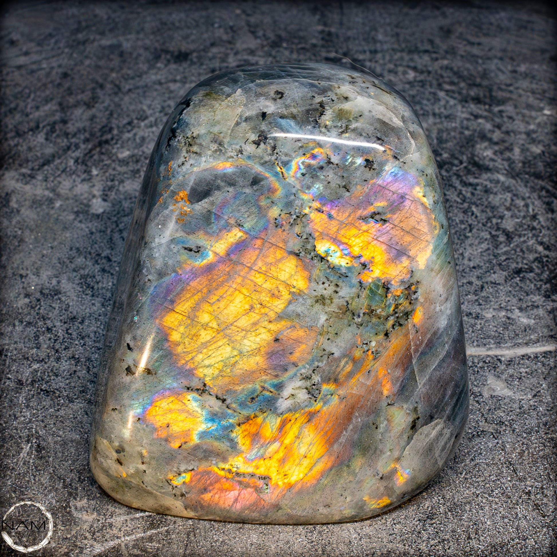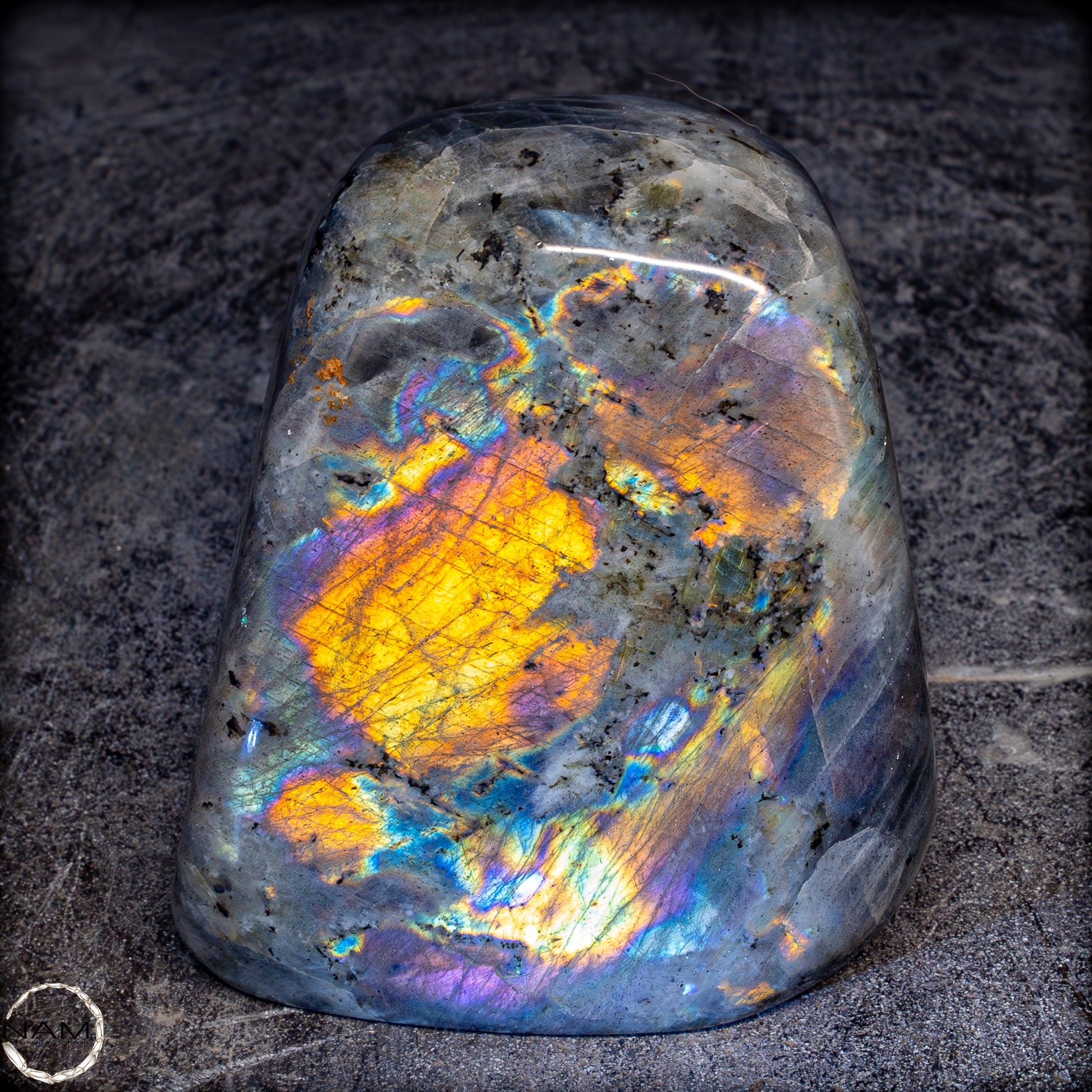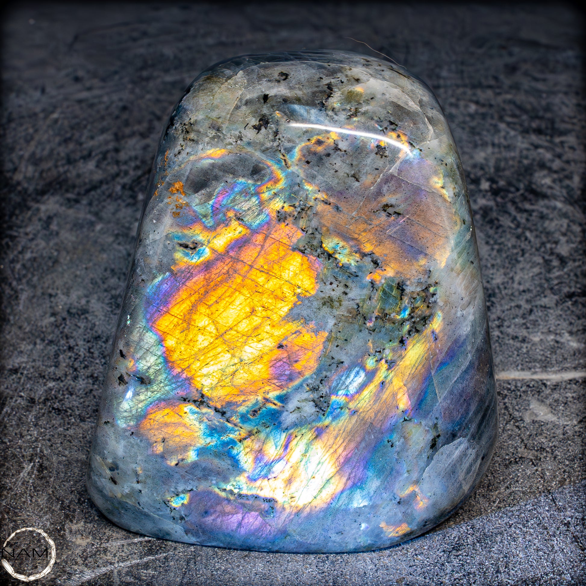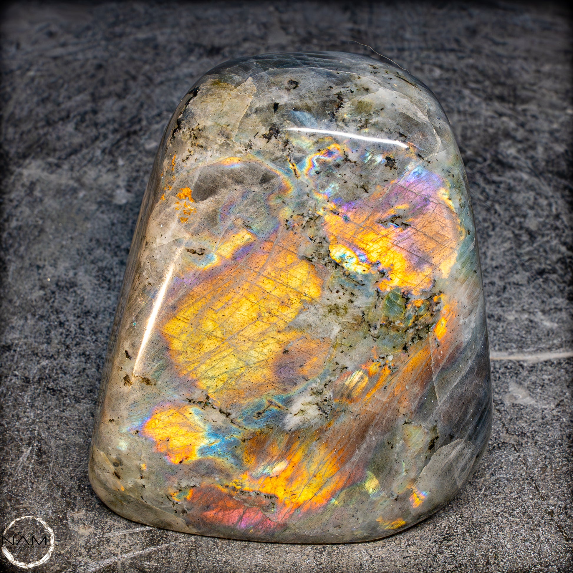 Diese Freiform aus Labradorit fasziniert mit einem außergewöhnlich intensiven Farbspiel, das von goldenen und orangefarbenen Flächen bis hin zu violetten, blauen und grünen Reflexen reicht. Die irisierenden Strukturen scheinen sich je nach Blickwinkel zu verändern und verleihen dem Stein eine dynamische Lebendigkeit. Eingebettet in eine graue Matrix mit natürlichen Einschlüssen, bilden die leuchtenden Farbzonen kontrastreiche Muster, die an Polarlichter erinnern. Ein besonders auffälliges Exemplar mit ausgeprägtem „Labradoreszenz“-Effekt – ideal als dekoratives Highlight oder als Sammlerstück..