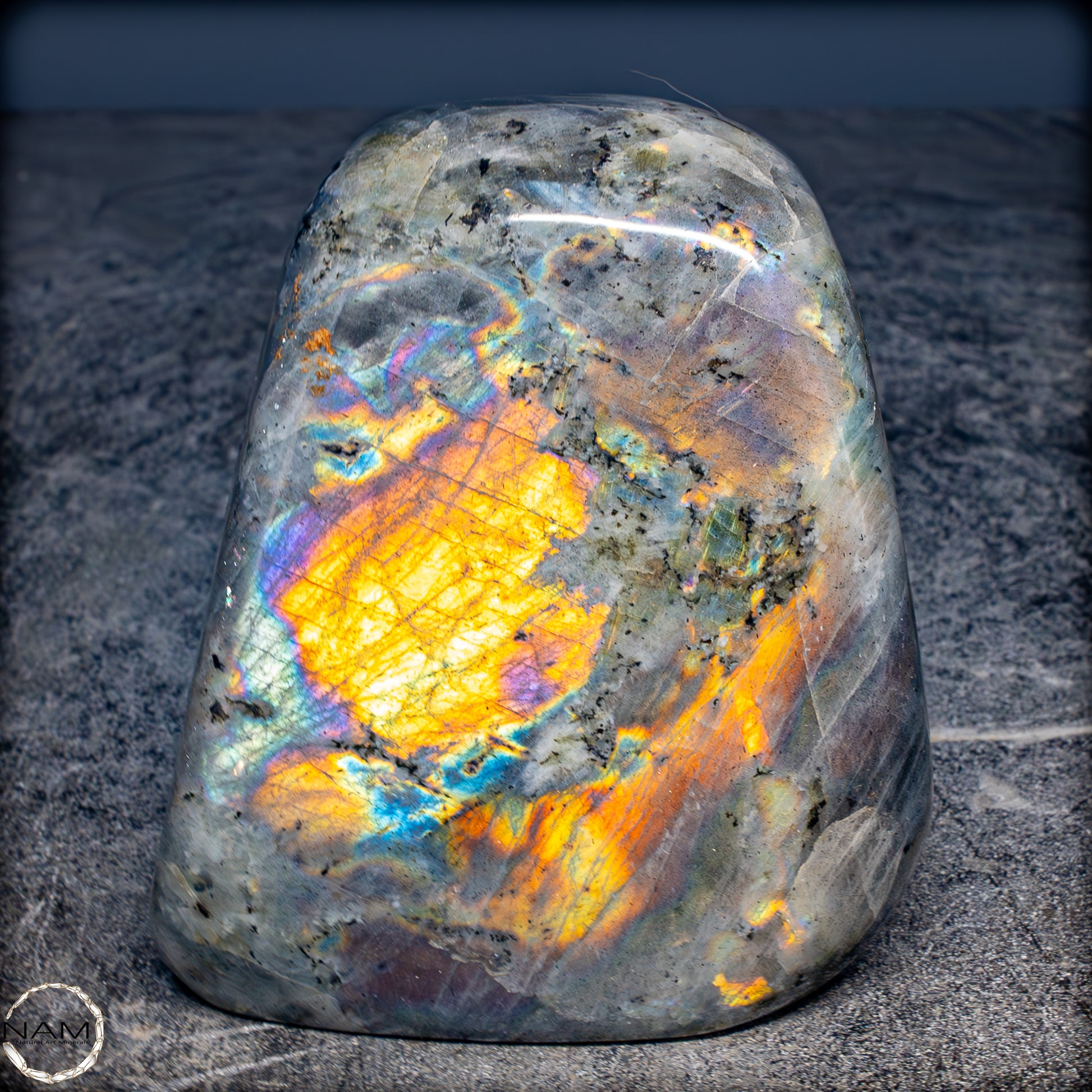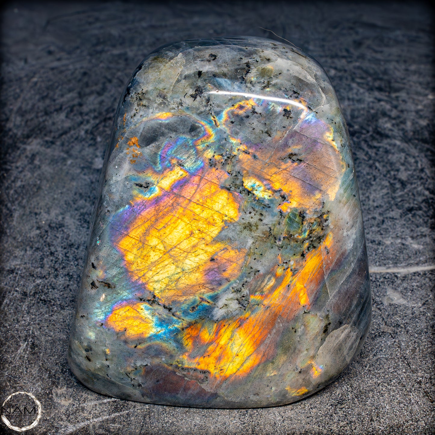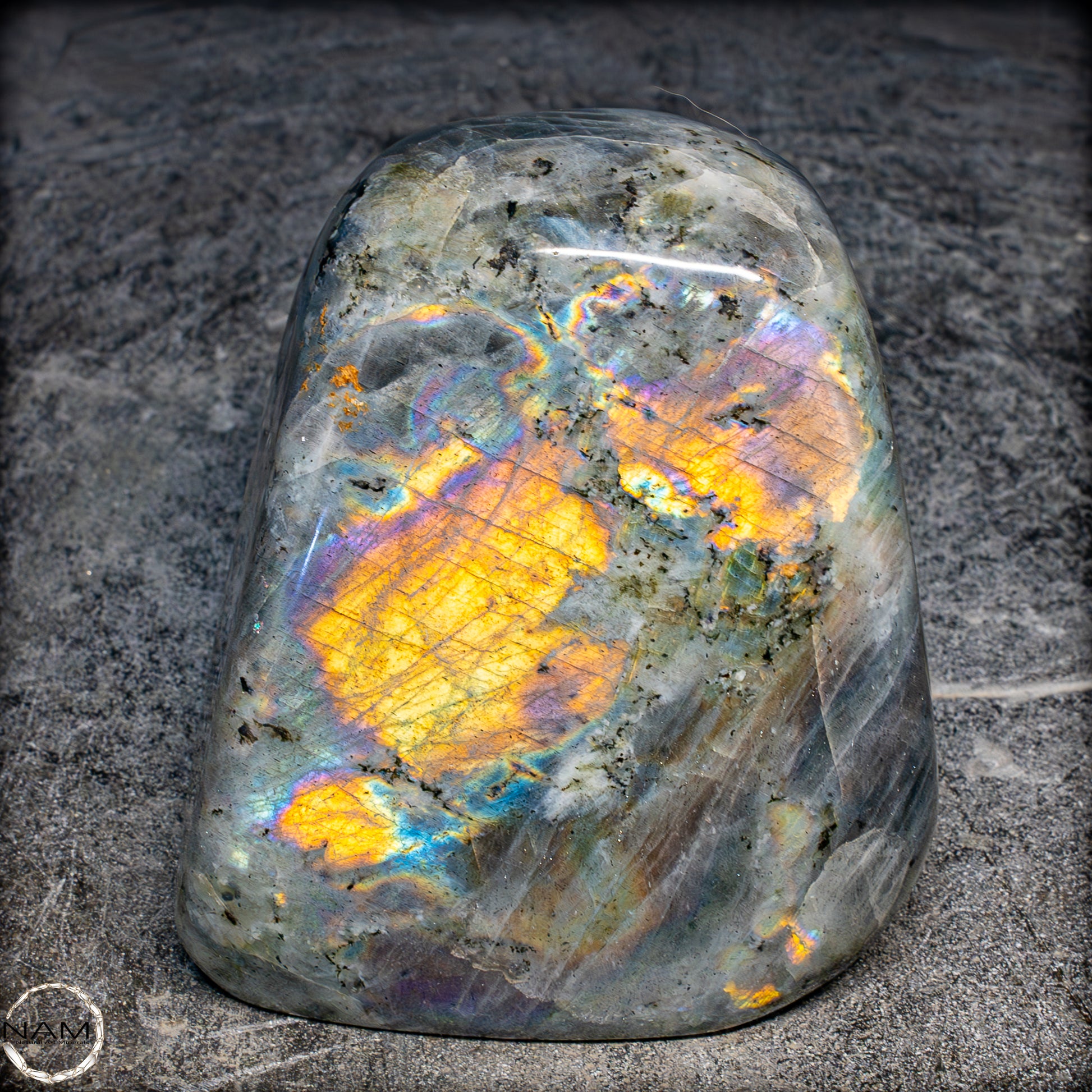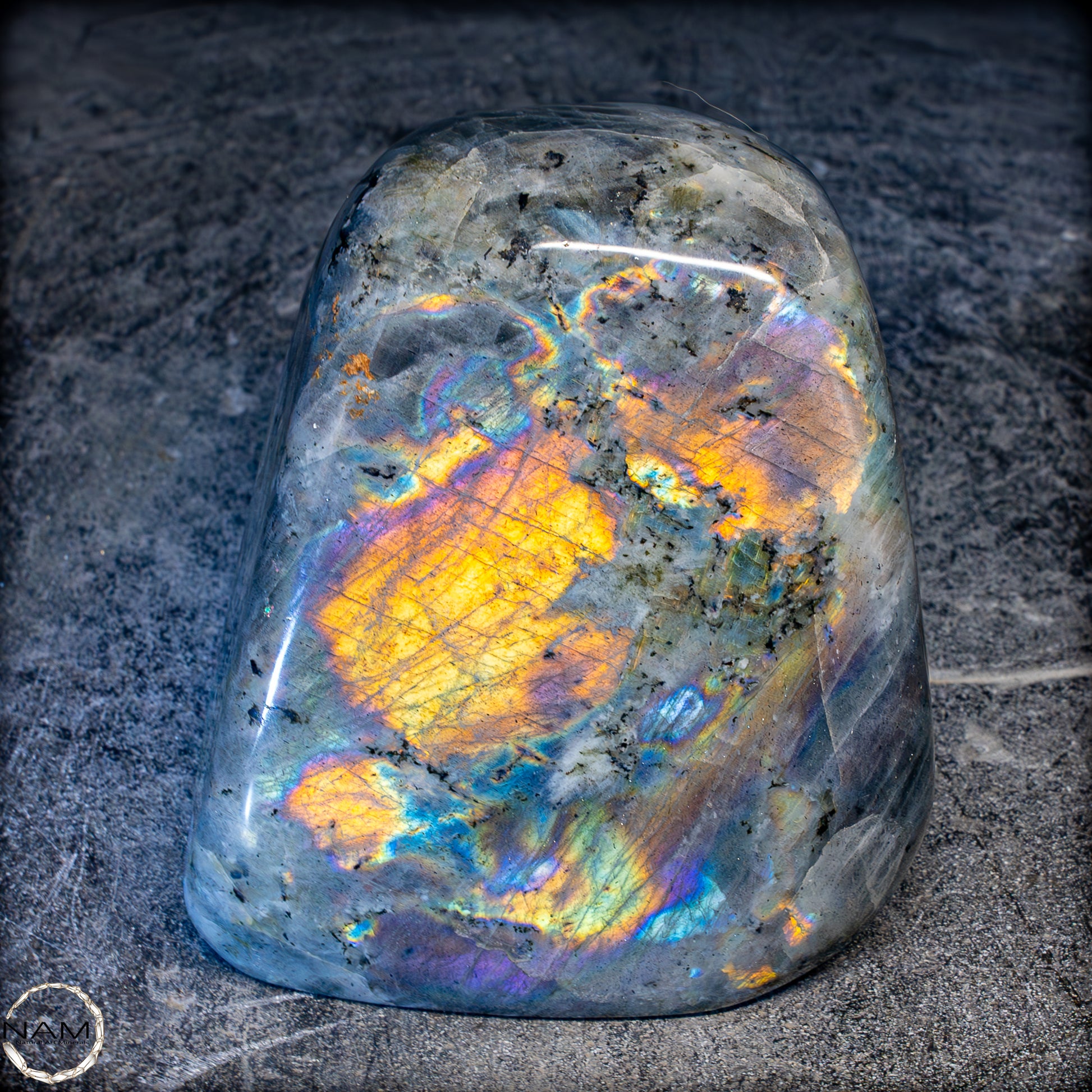 Diese Freiform aus Labradorit fasziniert mit einem außergewöhnlich intensiven Farbspiel, das von goldenen und orangefarbenen Flächen bis hin zu violetten, blauen und grünen Reflexen reicht. Die irisierenden Strukturen scheinen sich je nach Blickwinkel zu verändern und verleihen dem Stein eine dynamische Lebendigkeit. Eingebettet in eine graue Matrix mit natürlichen Einschlüssen, bilden die leuchtenden Farbzonen kontrastreiche Muster, die an Polarlichter erinnern. Ein besonders auffälliges Exemplar mit ausgeprägtem „Labradoreszenz“-Effekt – ideal als dekoratives Highlight oder als Sammlerstück..