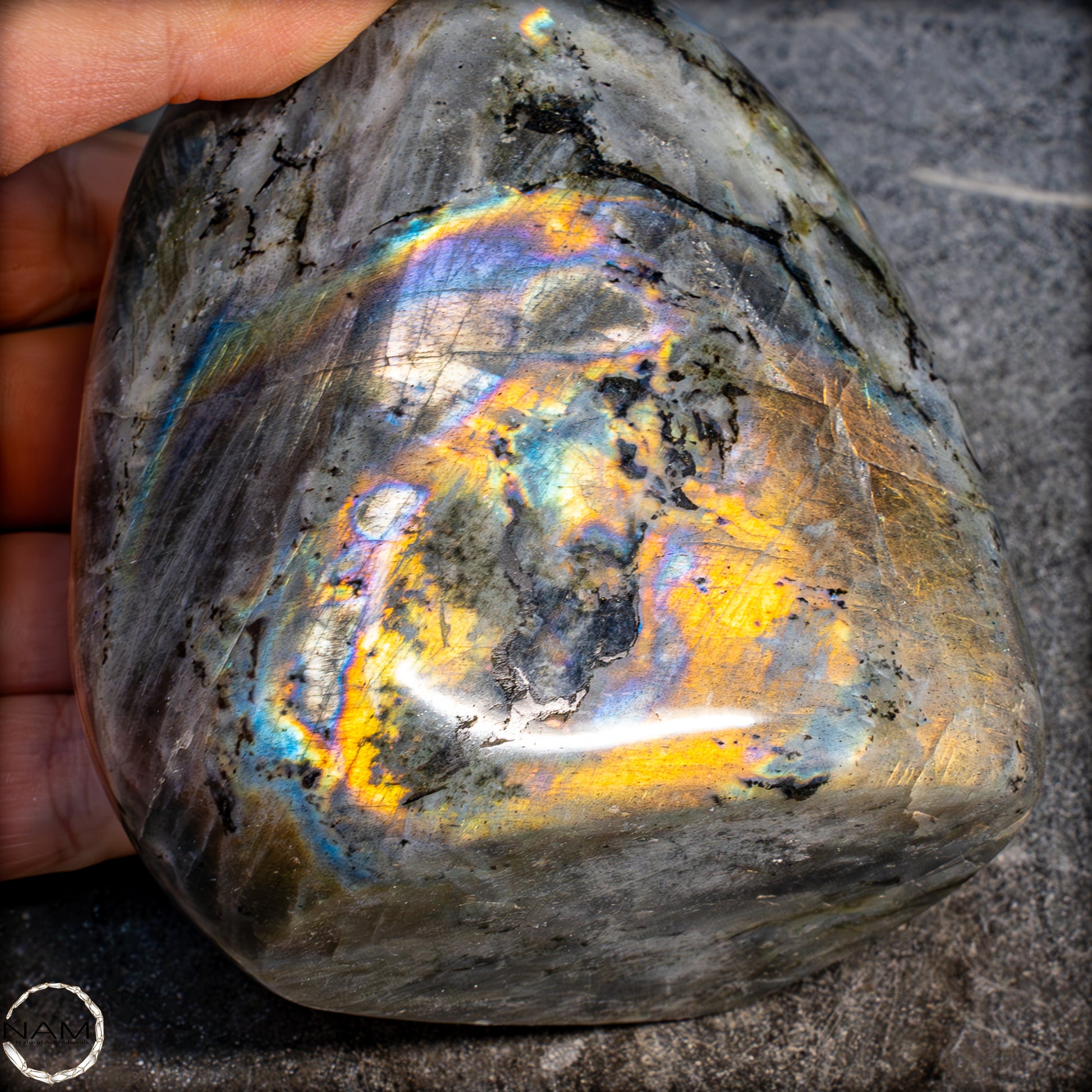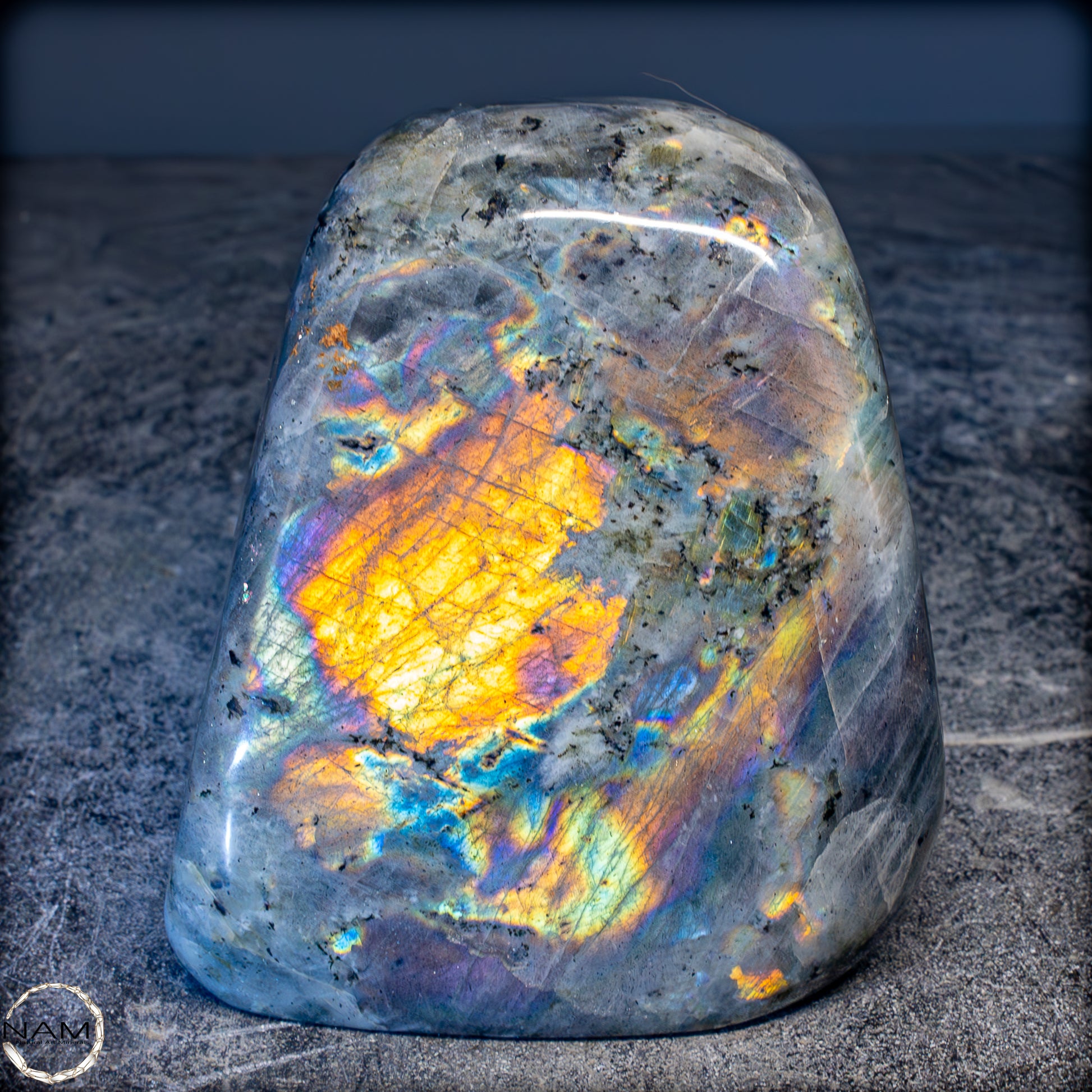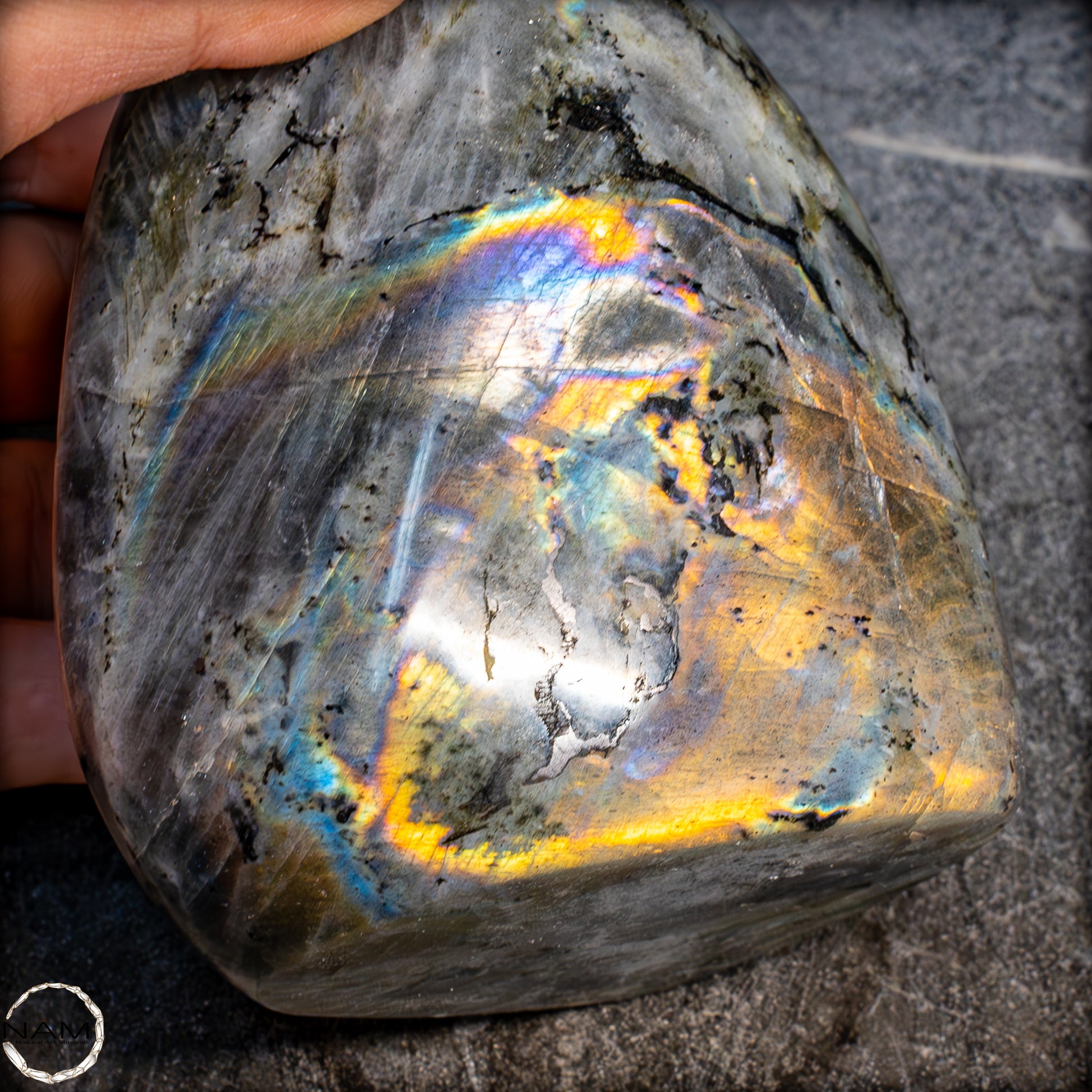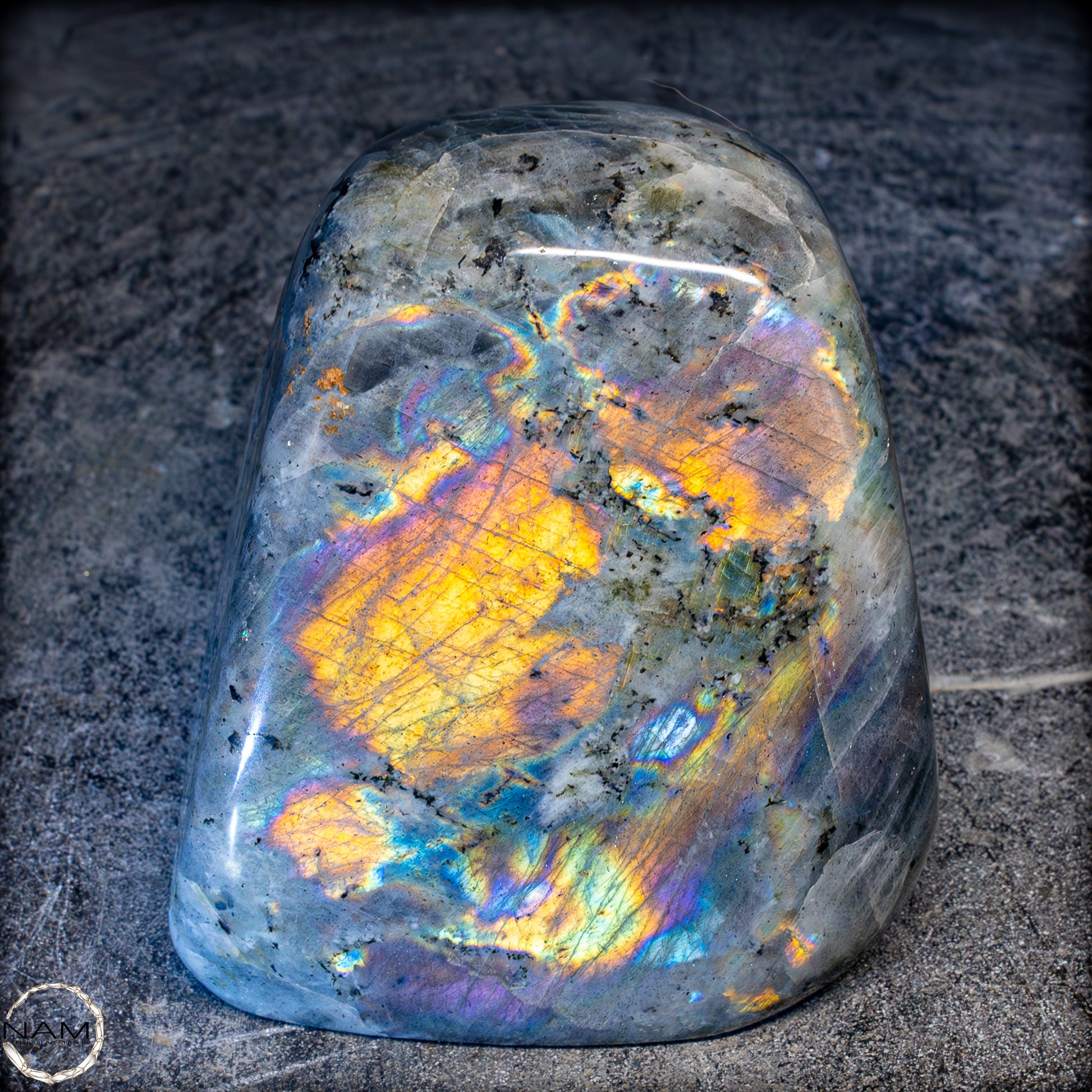 Diese Freiform aus Labradorit fasziniert mit einem außergewöhnlich intensiven Farbspiel, das von goldenen und orangefarbenen Flächen bis hin zu violetten, blauen und grünen Reflexen reicht. Die irisierenden Strukturen scheinen sich je nach Blickwinkel zu verändern und verleihen dem Stein eine dynamische Lebendigkeit. Eingebettet in eine graue Matrix mit natürlichen Einschlüssen, bilden die leuchtenden Farbzonen kontrastreiche Muster, die an Polarlichter erinnern. Ein besonders auffälliges Exemplar mit ausgeprägtem „Labradoreszenz“-Effekt – ideal als dekoratives Highlight oder als Sammlerstück..